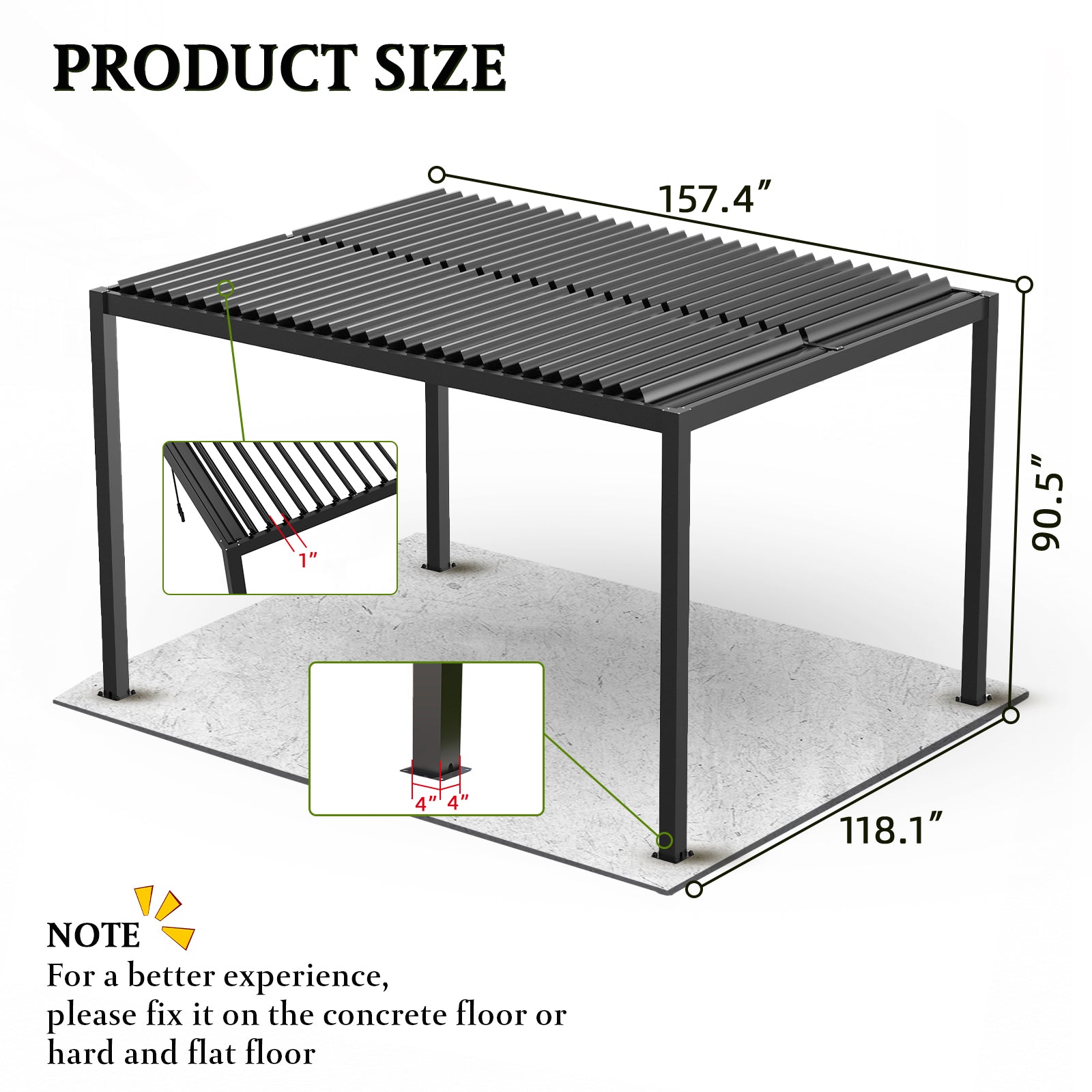 - Premium Material Construction: The pergola is made of a powder-coated aluminum frame and a tilting louvered roof of galvanized steel that withstands up to 73 mph winds.Durable construction for year-round use