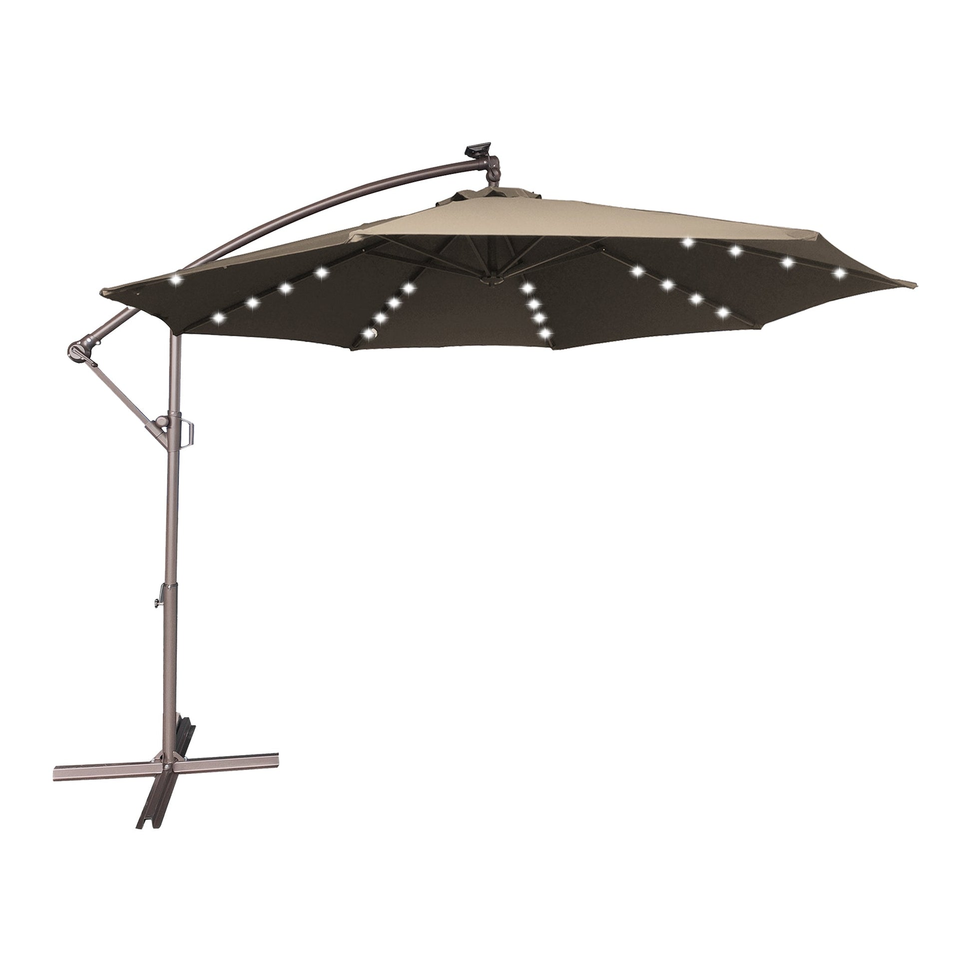 11FT Solar Offset Umbrella with 32 LED Lights Cantilever Hanging Outdoor Umbrellas Handy Crank & Cross Base for Lawn/Deck/Backyard/Pool,Tan