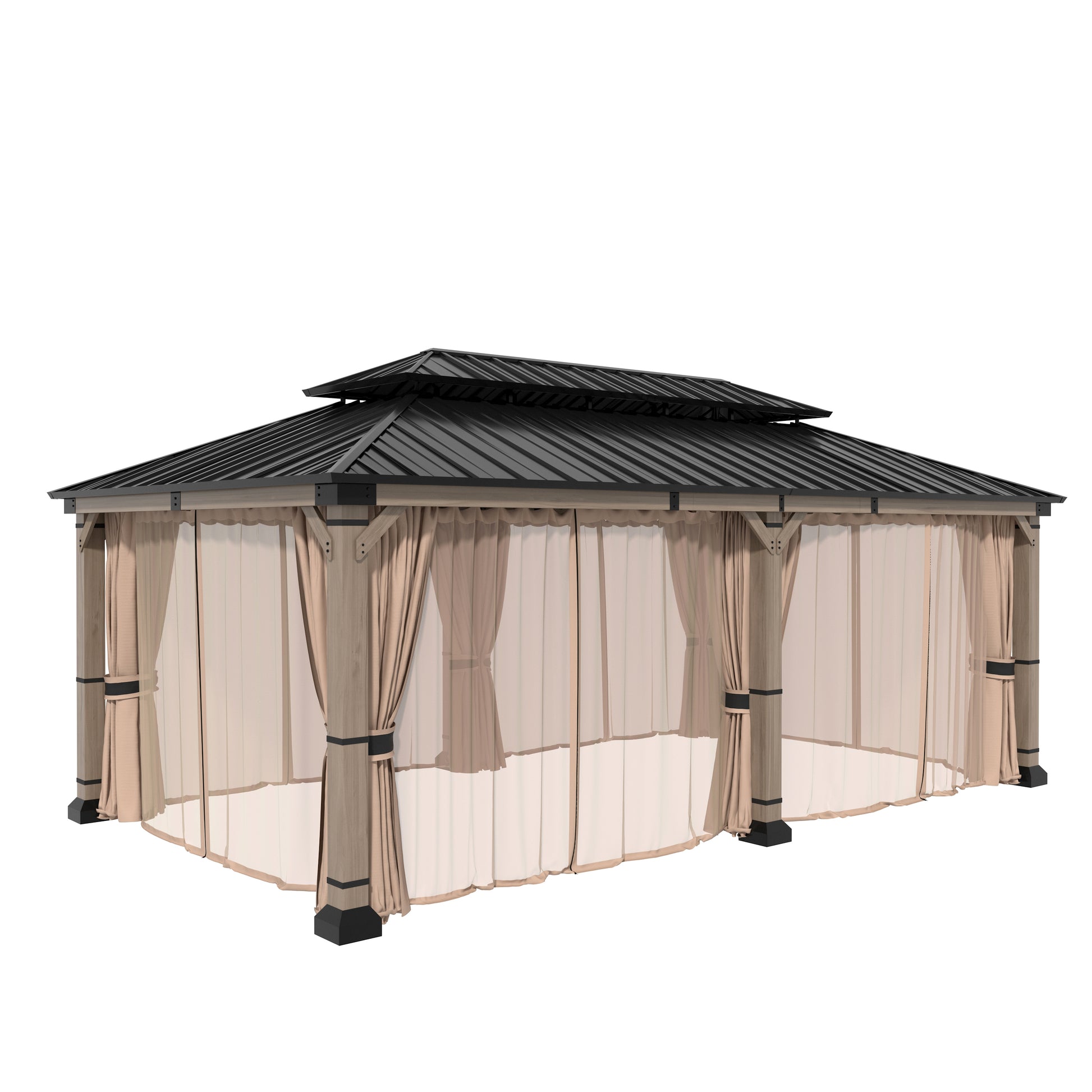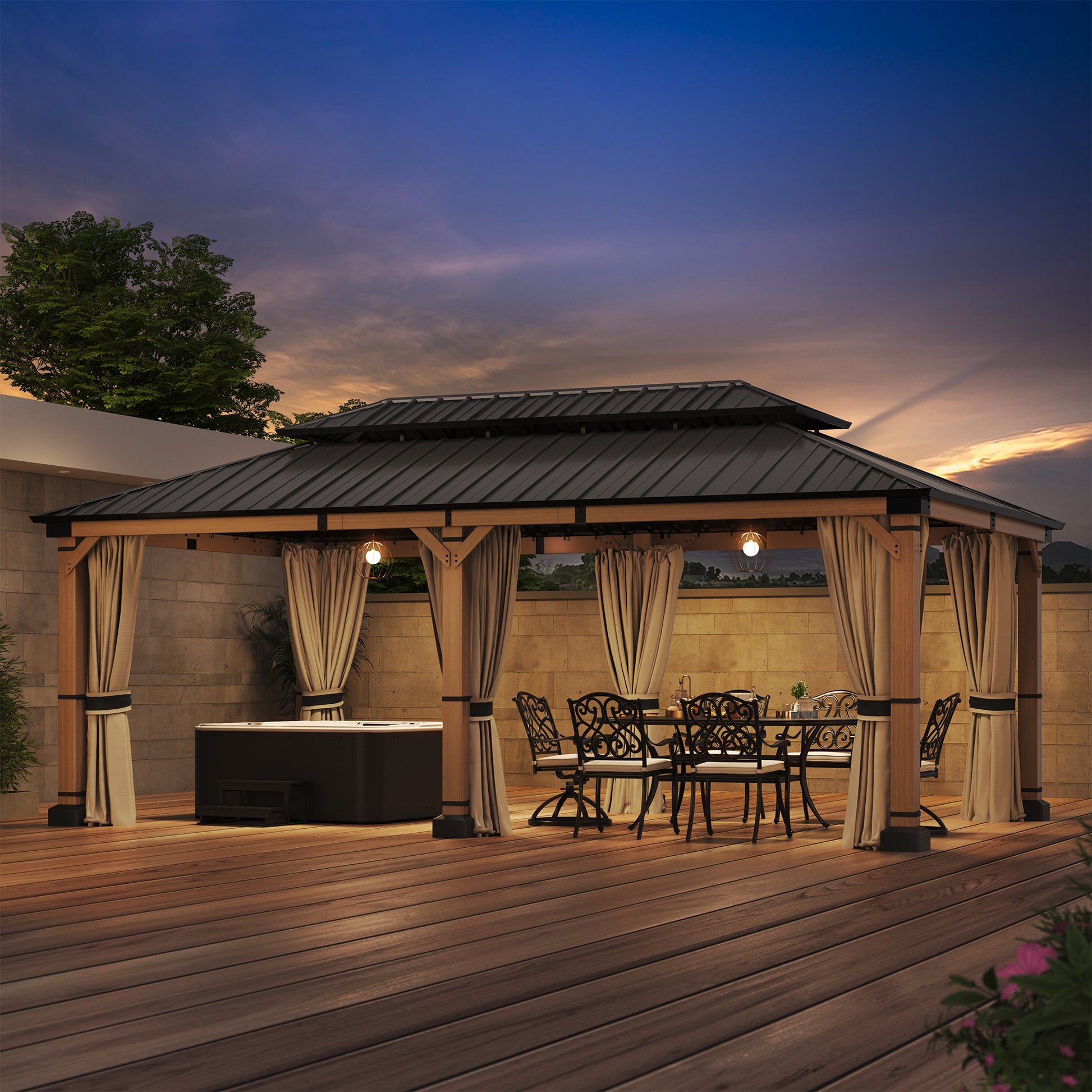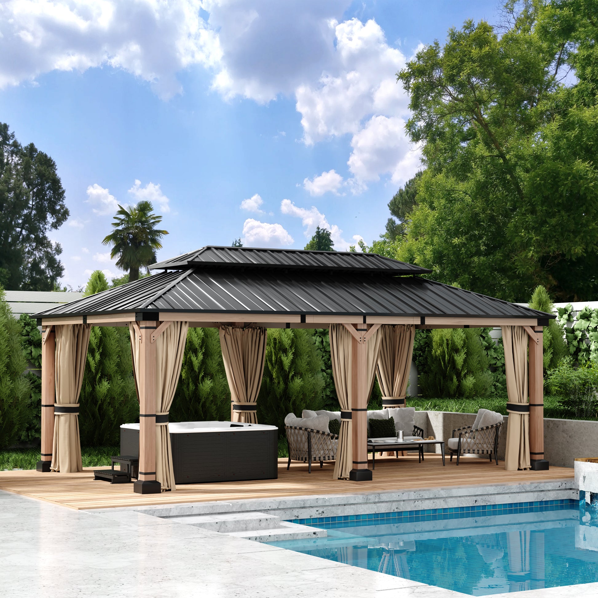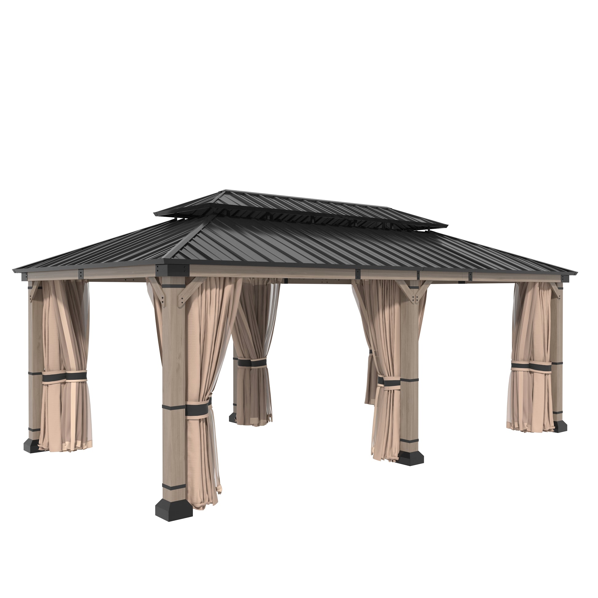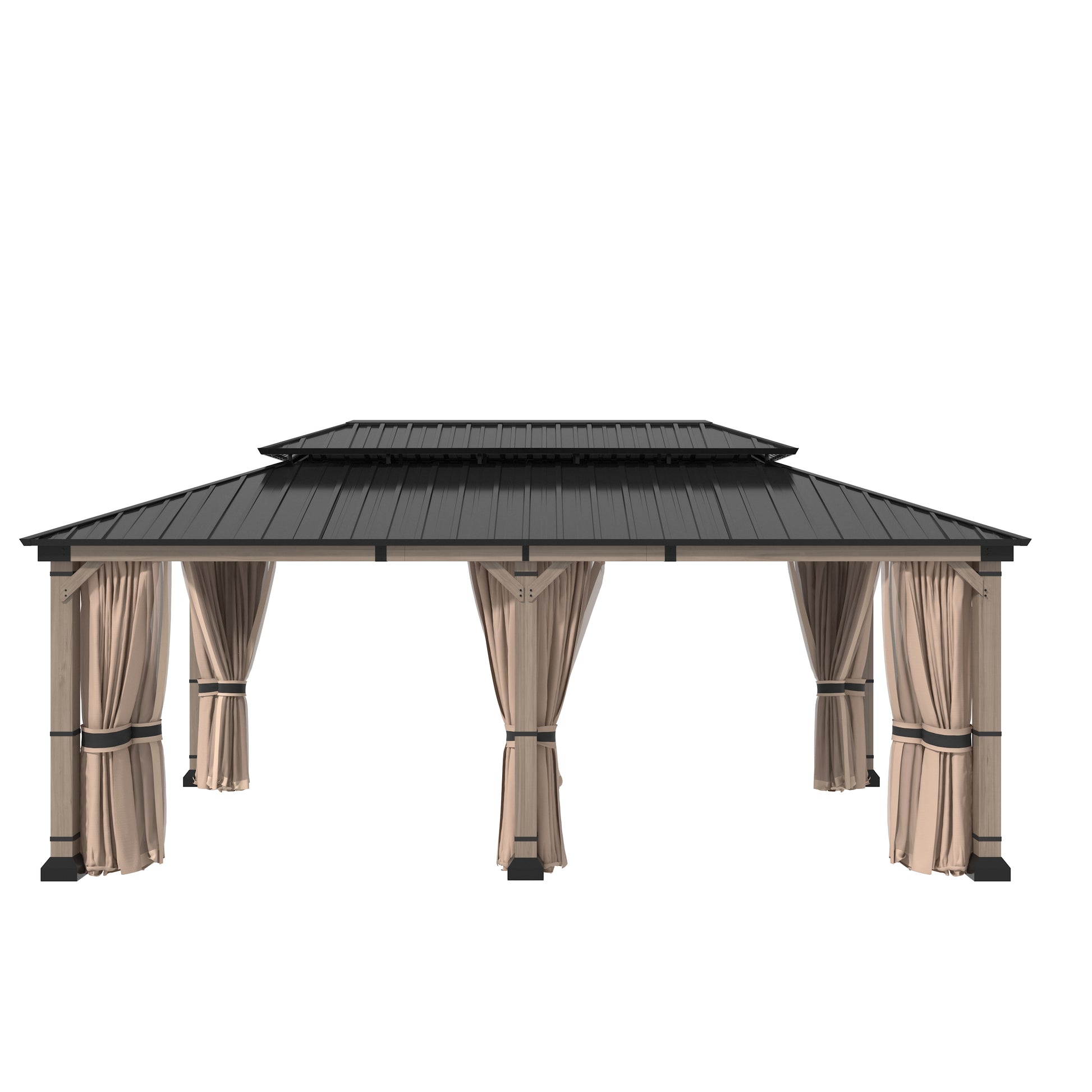 Mondawe 12 ft. x20 ft. Cedar Gazebo with a galvanized steel double canopy roof, meticulously crafted to provide an oasis of comfort in your outdoor space. The gazebo's cedar wood frame is not only sturdy but also boasts a natural beauty that enhances any outdoor setting. The wood is treated to resist corrosion, ensuring that this structure will be a lasting feature in your garden. The six cedar pillars and triangular corner braces offer exceptional support, making it a reliable choice for gatherings, no matter the weather. The galvanized steel roof is a marvel of engineering, featuring a dual-canopy design that promotes optimal airflow and provides shade from the sun and protection from the rain. Its UV-resistant properties mean that the gazebo will retain its aesthetic appeal over time, while the angled roof and overhangs ensure that water is quickly directed away, keeping the interior dry. The gazebo includes practical features such as two hooks for hanging lighting, making it safe and enjoyable even after dark. With a spacious 240 square feet of shade, this gazebo comfortably accommodates 10-12 people, making it perfect for family gatherings, barbecues, or simply lounging with friends. Additionally, the gazebo comes with four waterproof polyester curtains that can be easily attached with velcro, providing privacy and protection from the elements when needed.