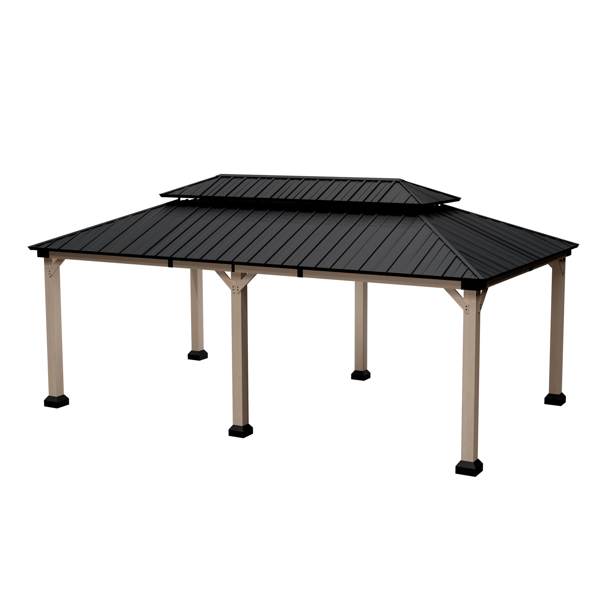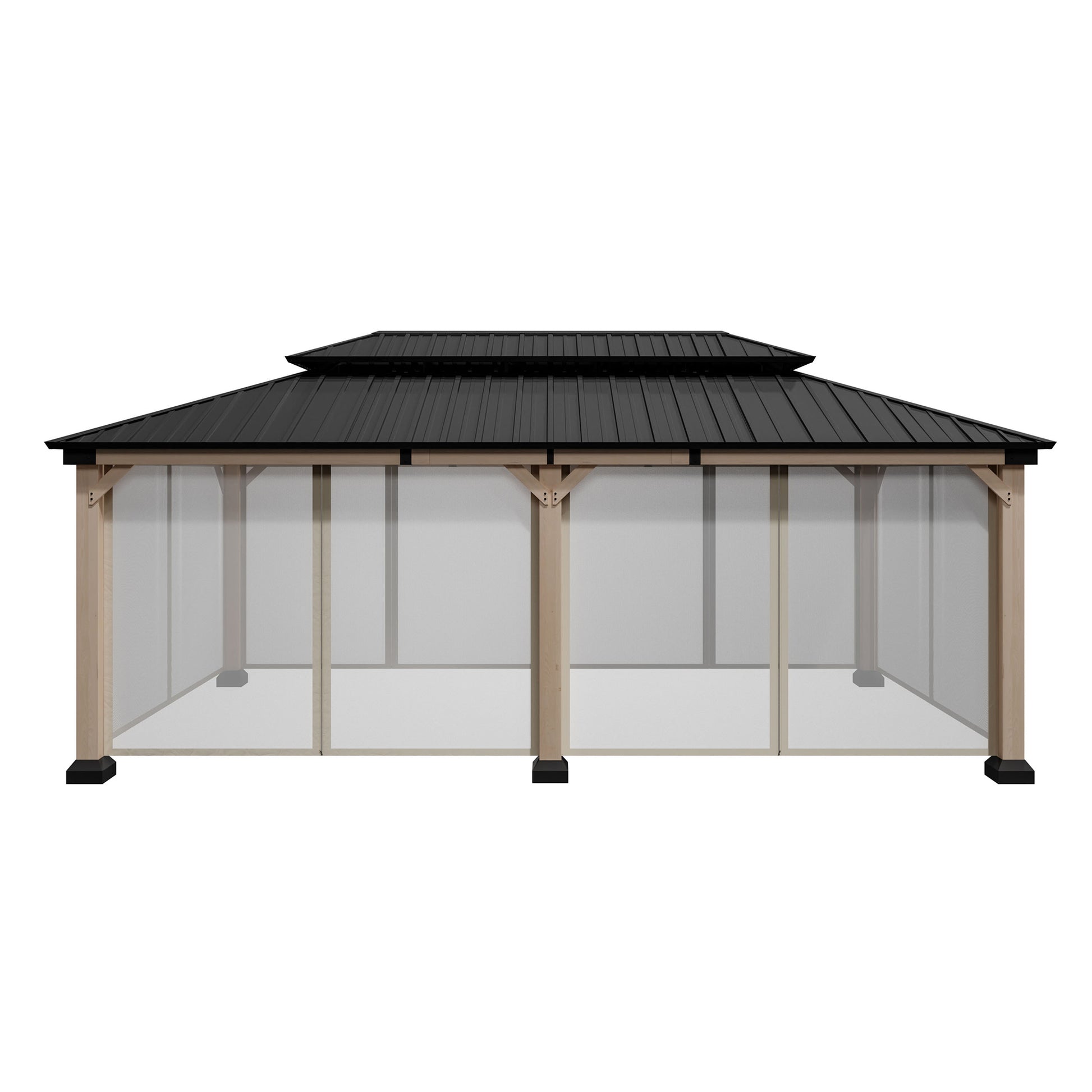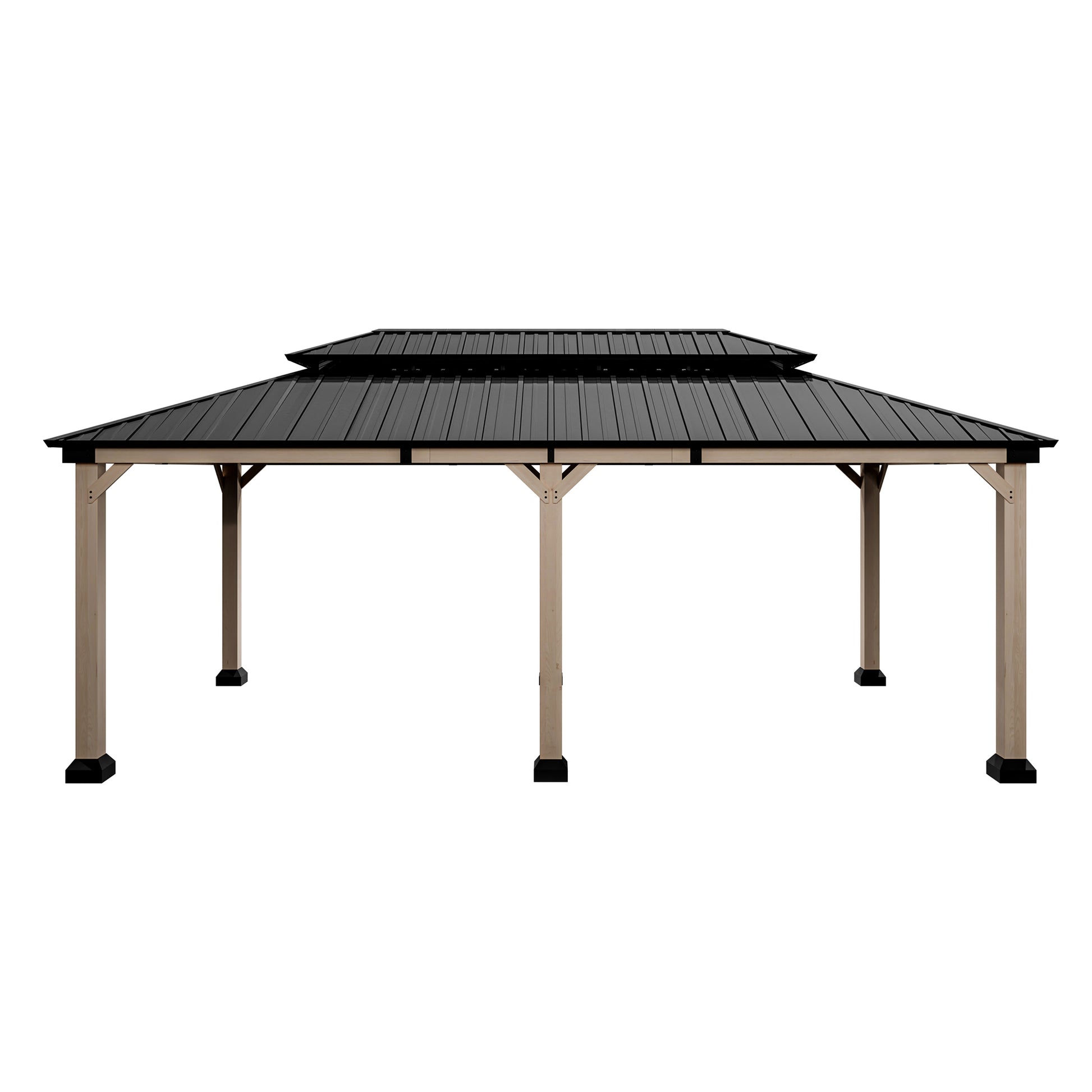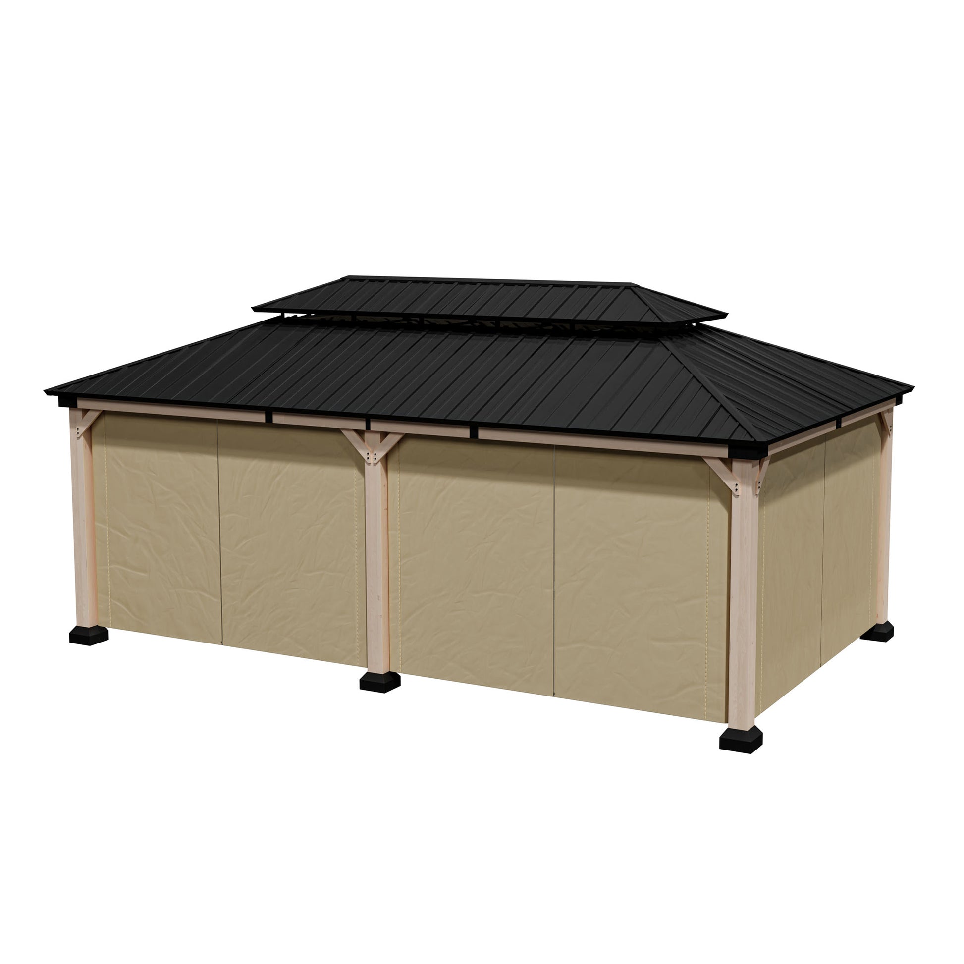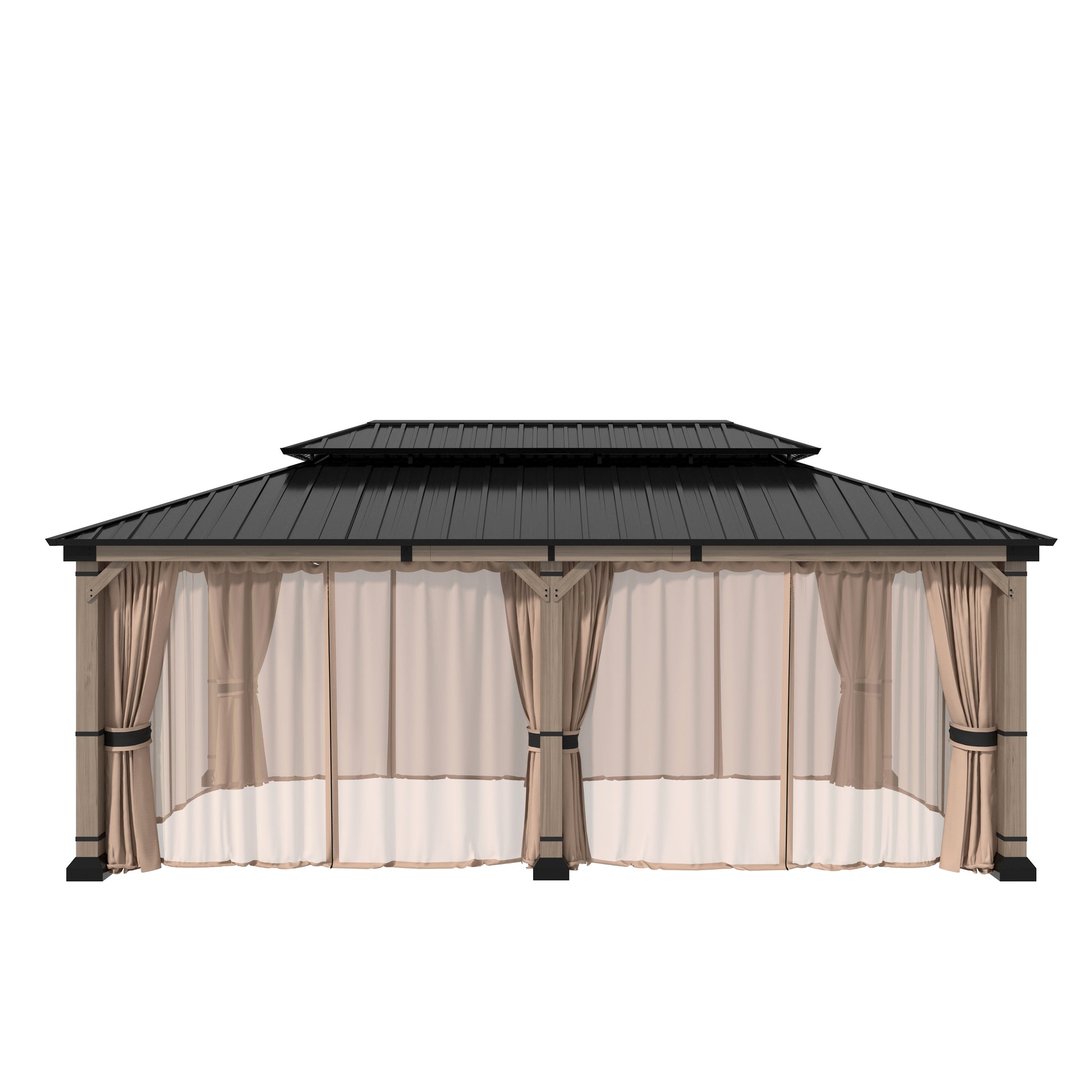 Mondawe 12 ft. x20 ft. Cedar Gazebo with a galvanized steel double canopy roof, meticulously crafted to provide an oasis of comfort in your outdoor space. The gazebo's cedar wood frame is not only sturdy but also boasts a natural beauty that enhances any outdoor setting. The wood is treated to resist corrosion, ensuring that this structure will be a lasting feature in your garden. The six cedar pillars and triangular corner braces offer exceptional support, making it a reliable choice for gatherings, no matter the weather. The galvanized steel roof is a marvel of engineering, featuring a dual-canopy design that promotes optimal airflow and provides shade from the sun and protection from the rain. Its UV-resistant properties mean that the gazebo will retain its aesthetic appeal over time, while the angled roof and overhangs ensure that water is quickly directed away, keeping the interior dry. The gazebo includes practical features such as two hooks for hanging lighting, making it safe and enjoyable even after dark. With a spacious 240 square feet of shade, this gazebo comfortably accommodates 10-12 people, making it perfect for family gatherings, barbecues, or simply lounging with friends. Additionally, the gazebo comes with four waterproof polyester curtains that can be easily attached with velcro, providing privacy and protection from the elements when needed.