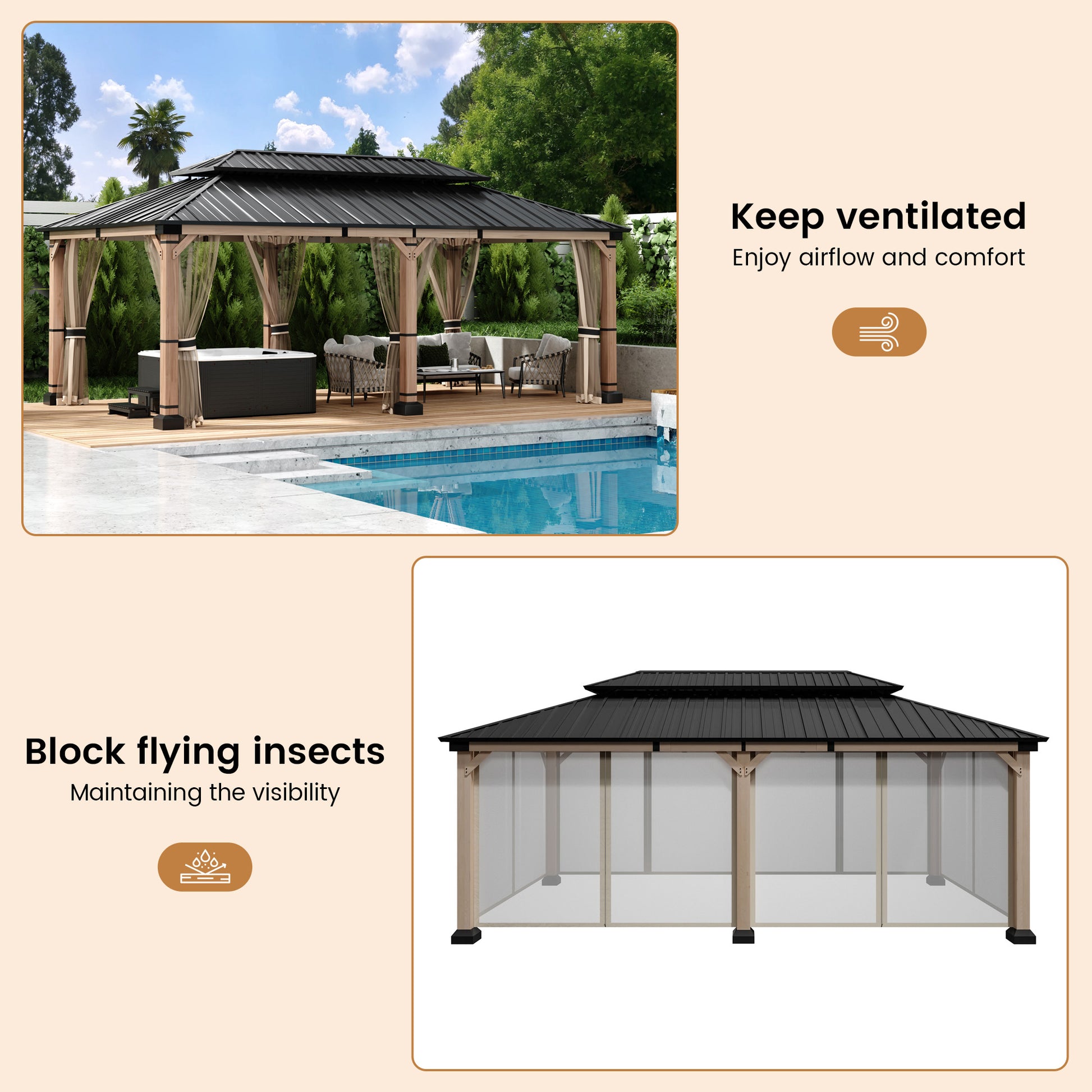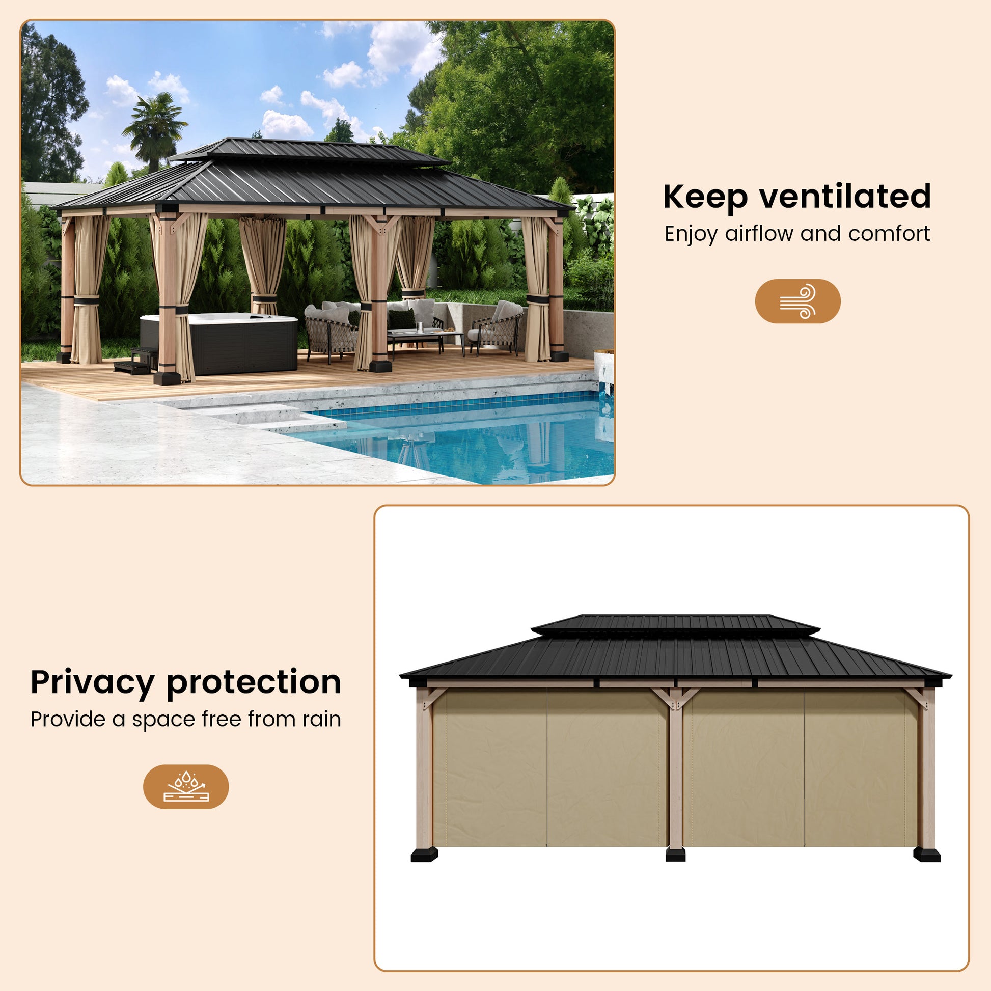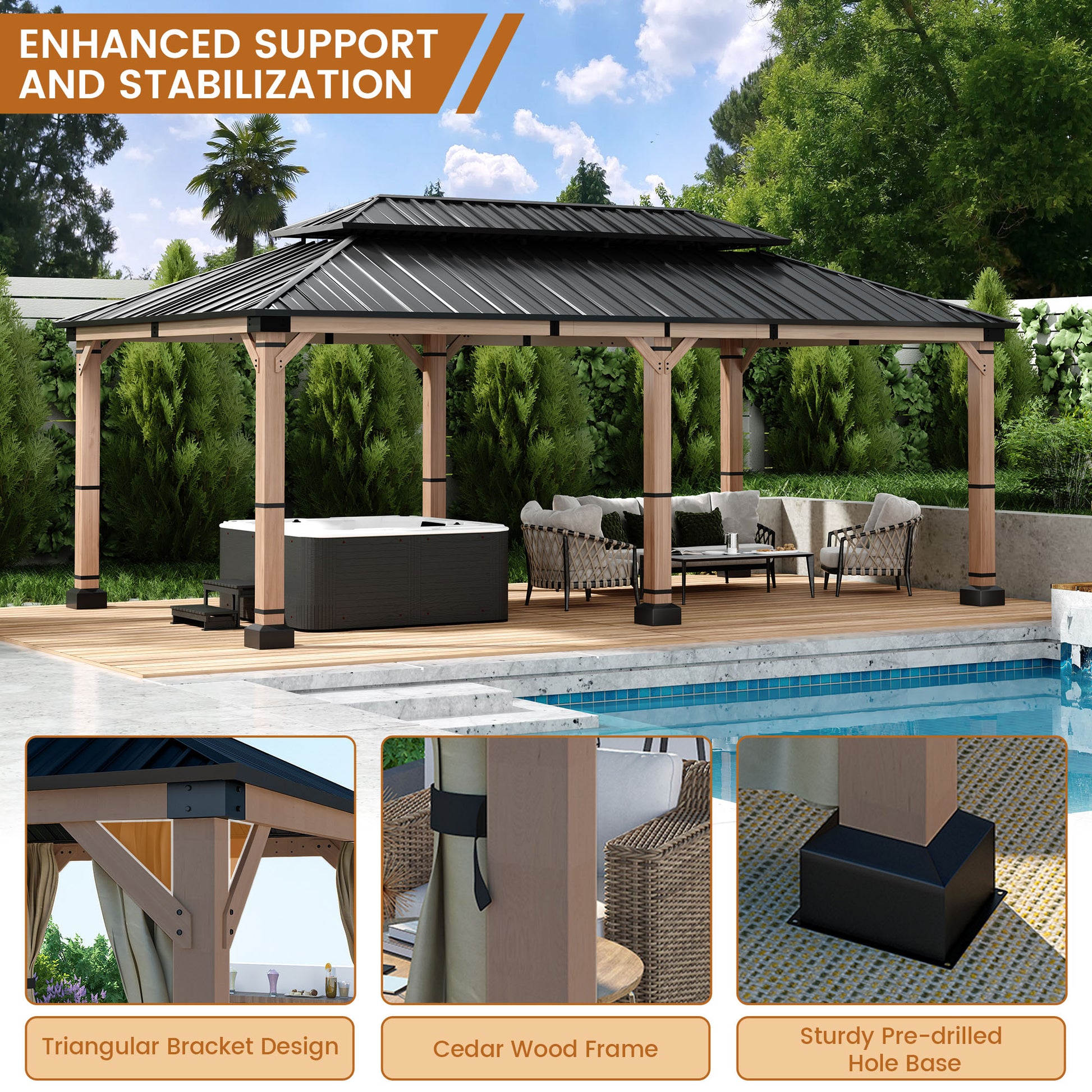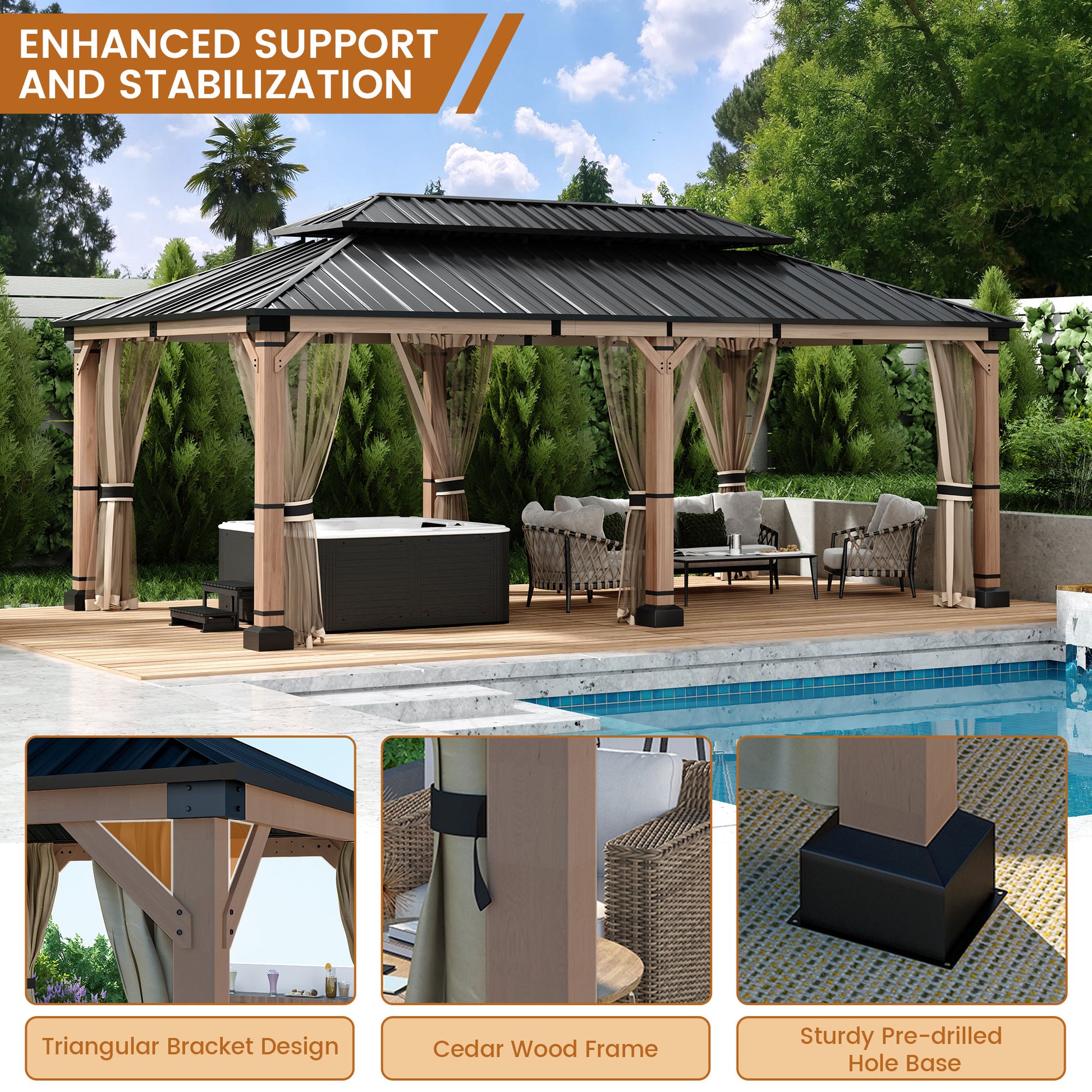 - Durable Construction: Engineered with a 12x20-foot high-quality cedar wood frame and galvanized steel double-layer gazebo, designed to withstand harsh weather conditions.