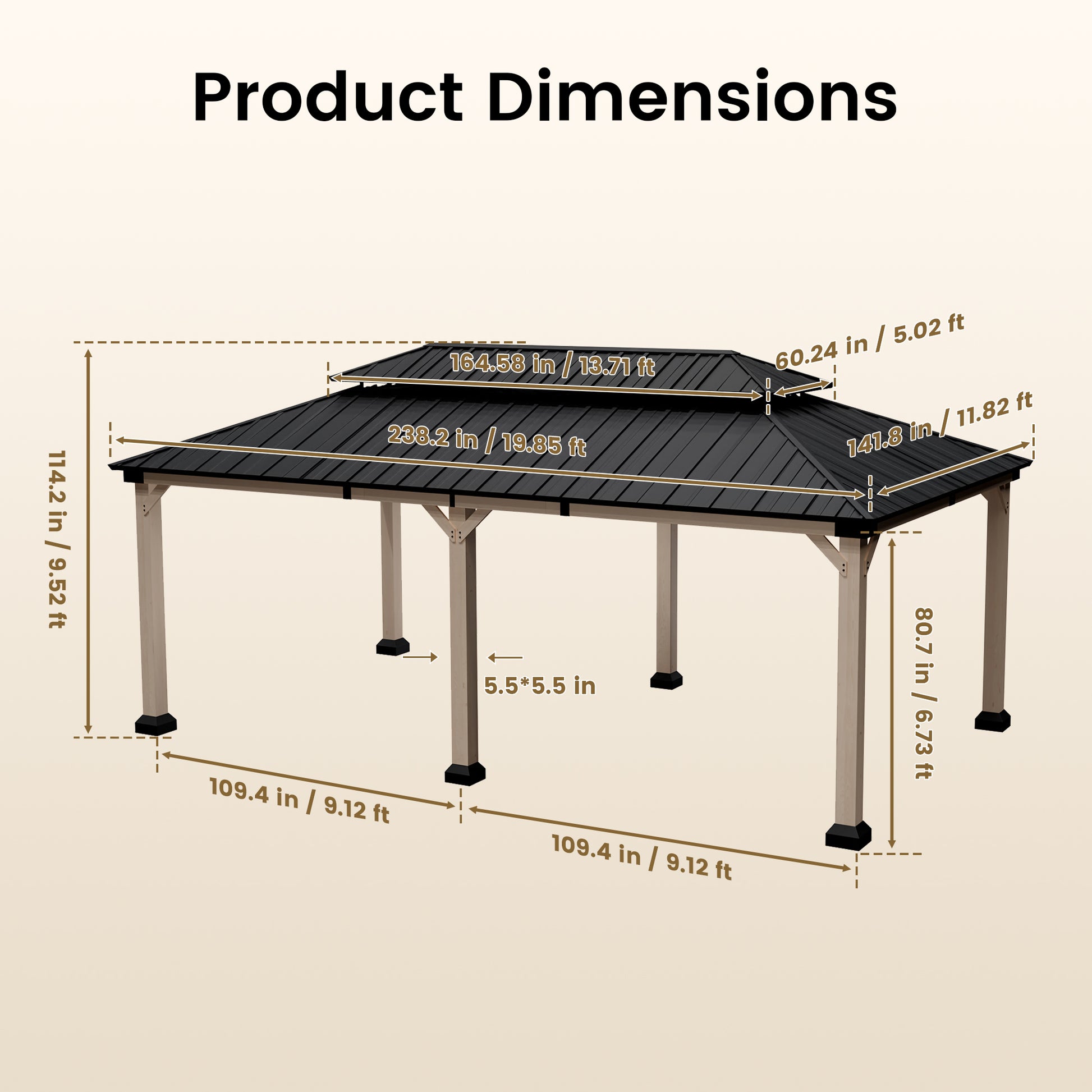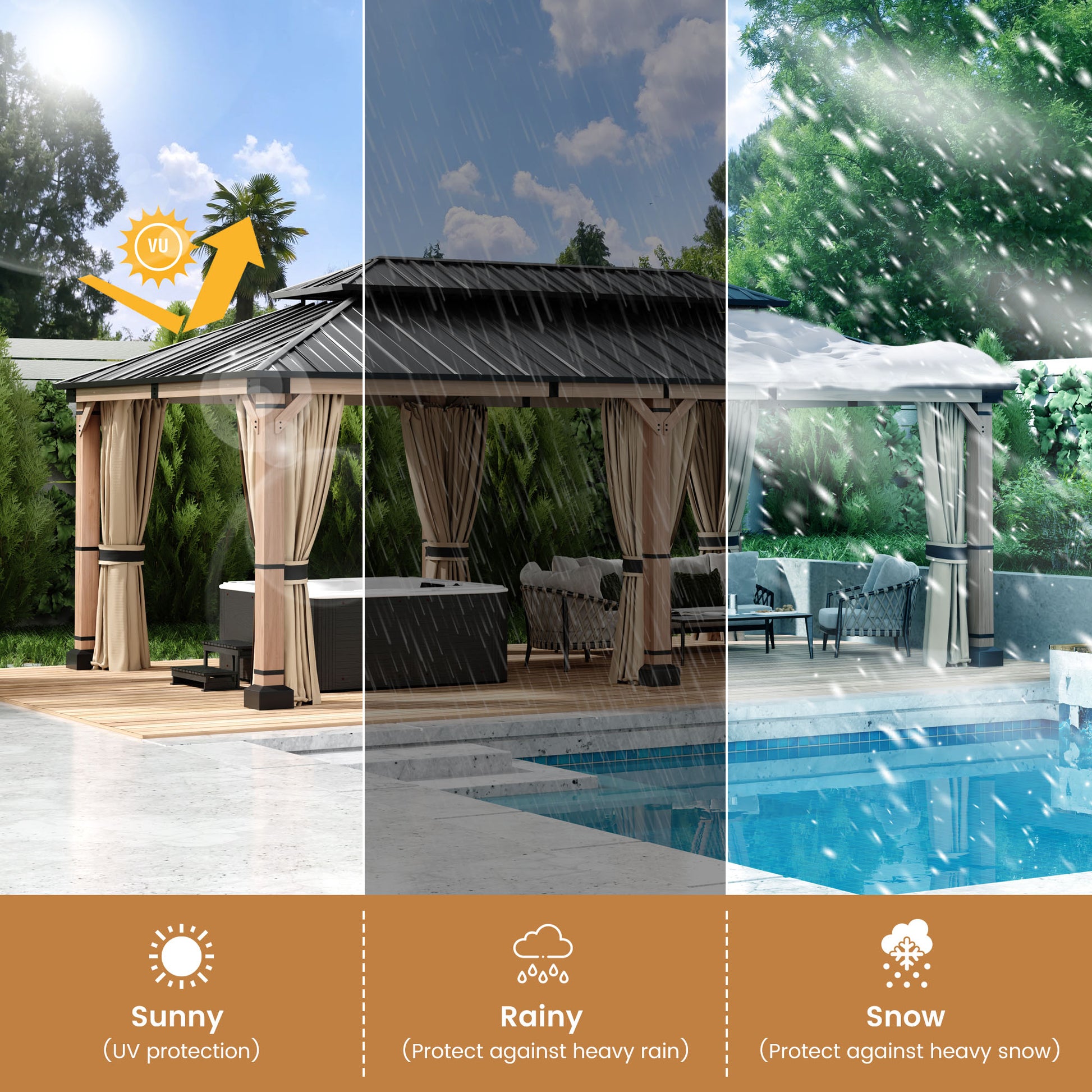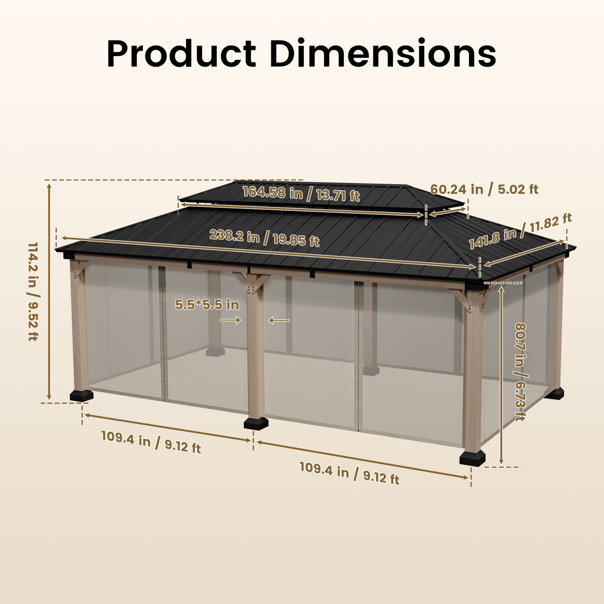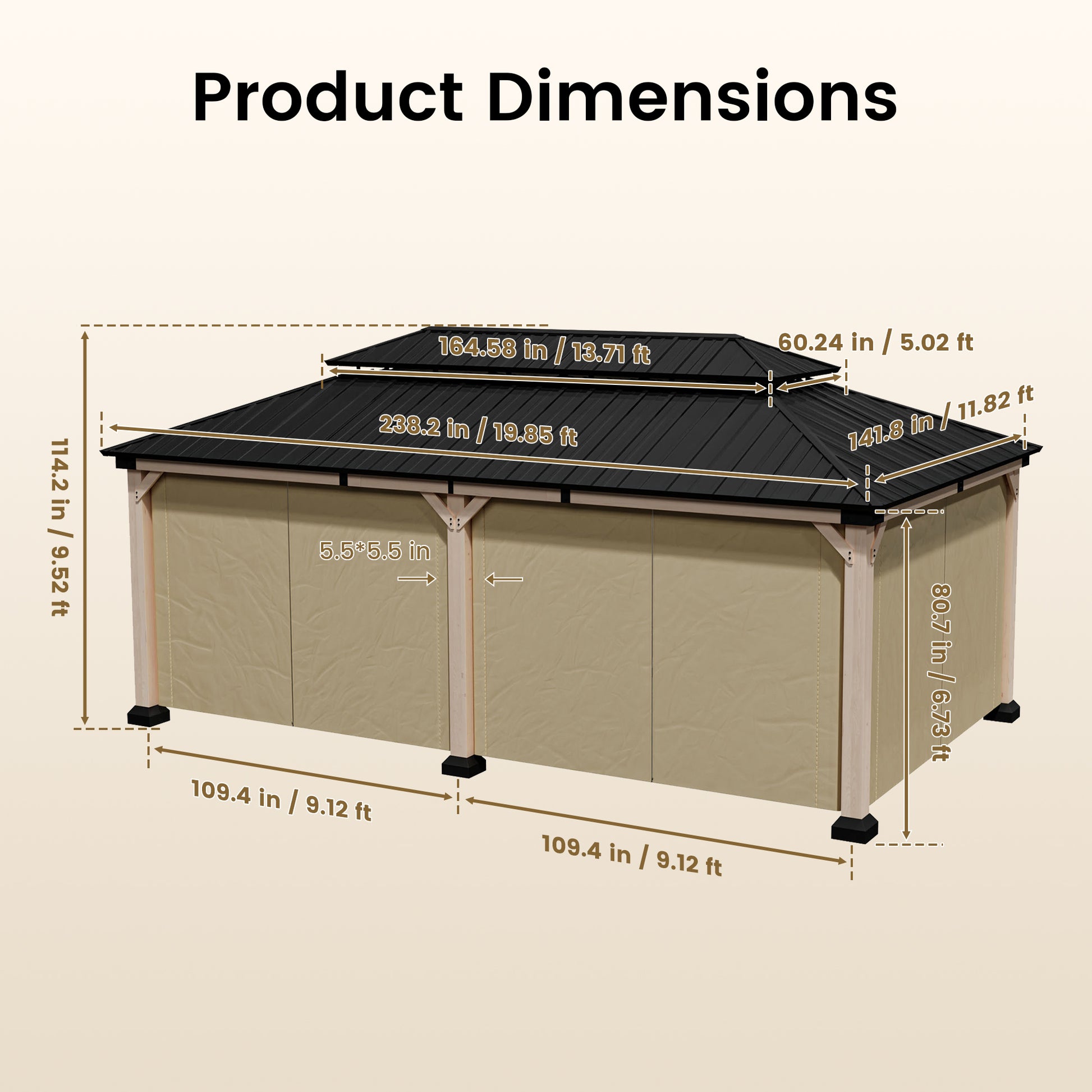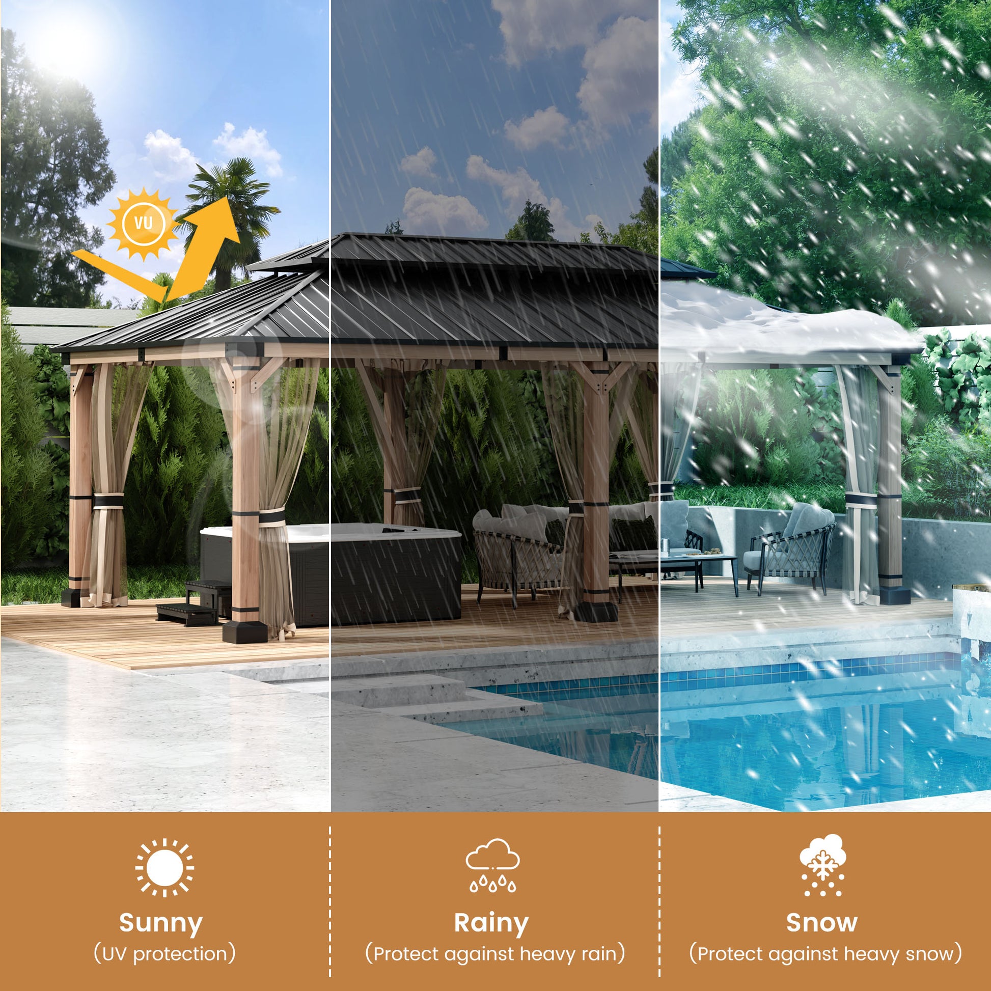 - Durable Construction: Engineered with a 12x20-foot high-quality cedar wood frame and galvanized steel double-layer gazebo, designed to withstand harsh weather conditions.