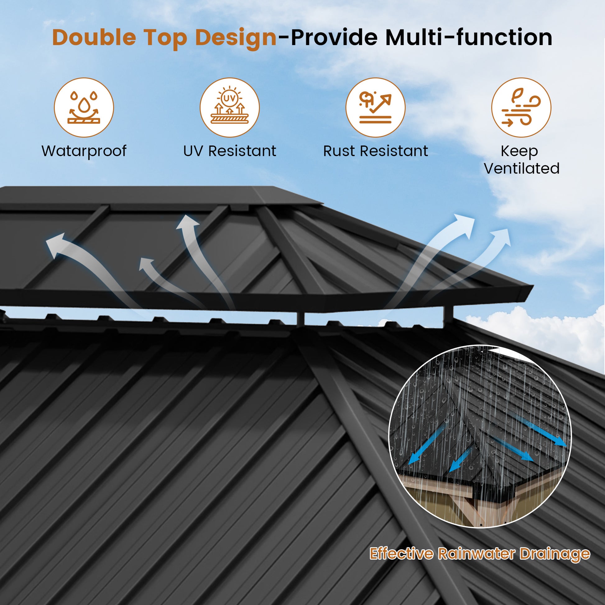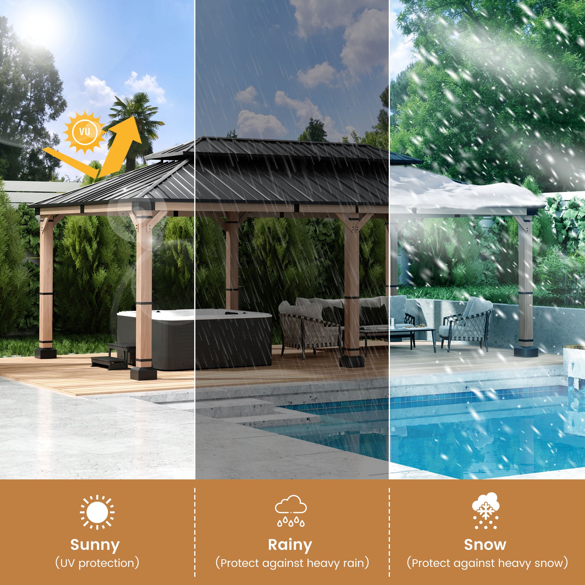- UV Protection: The galvanized steel roof is designed to block harmful UV rays and resist fading and rust, suitable for use in all weather conditions.