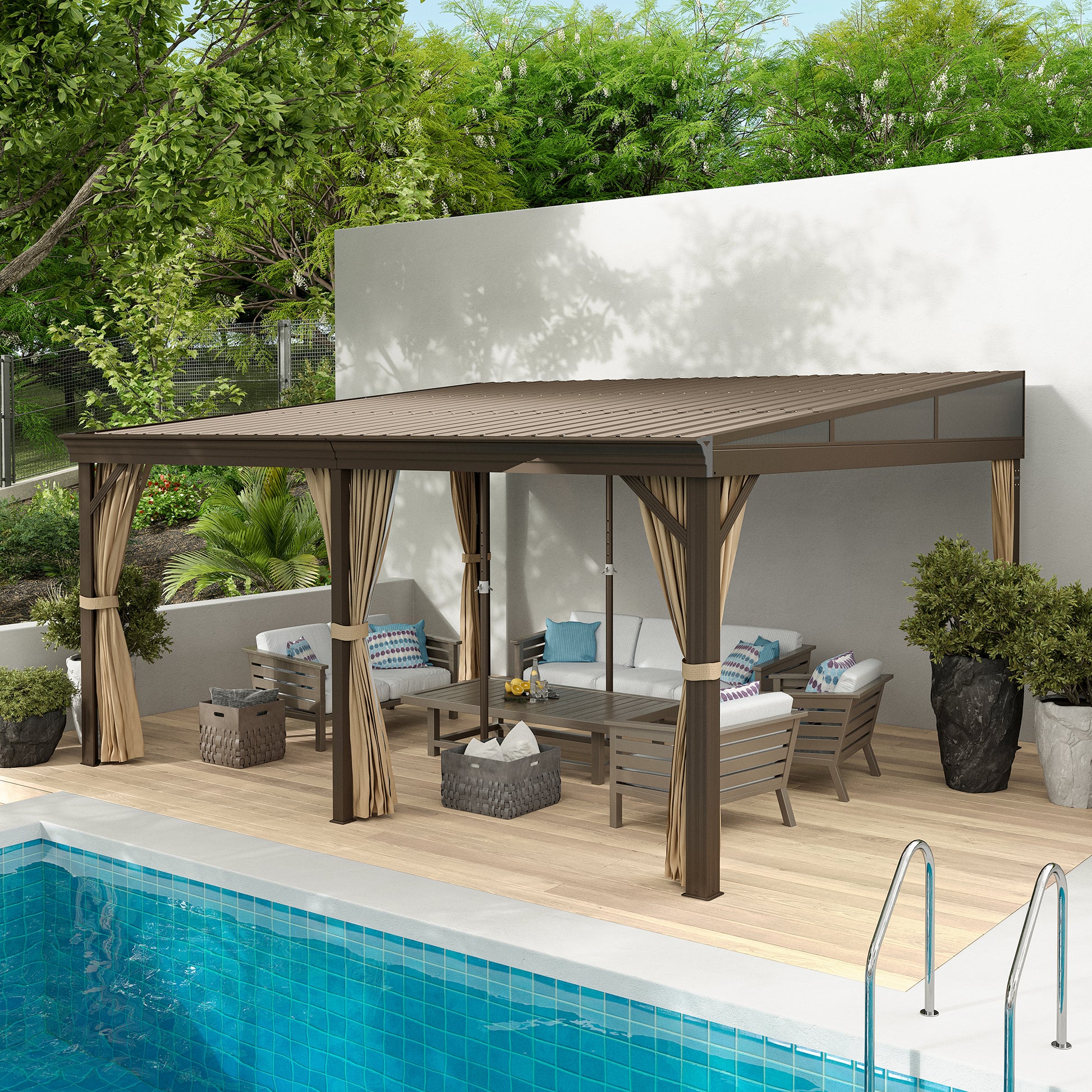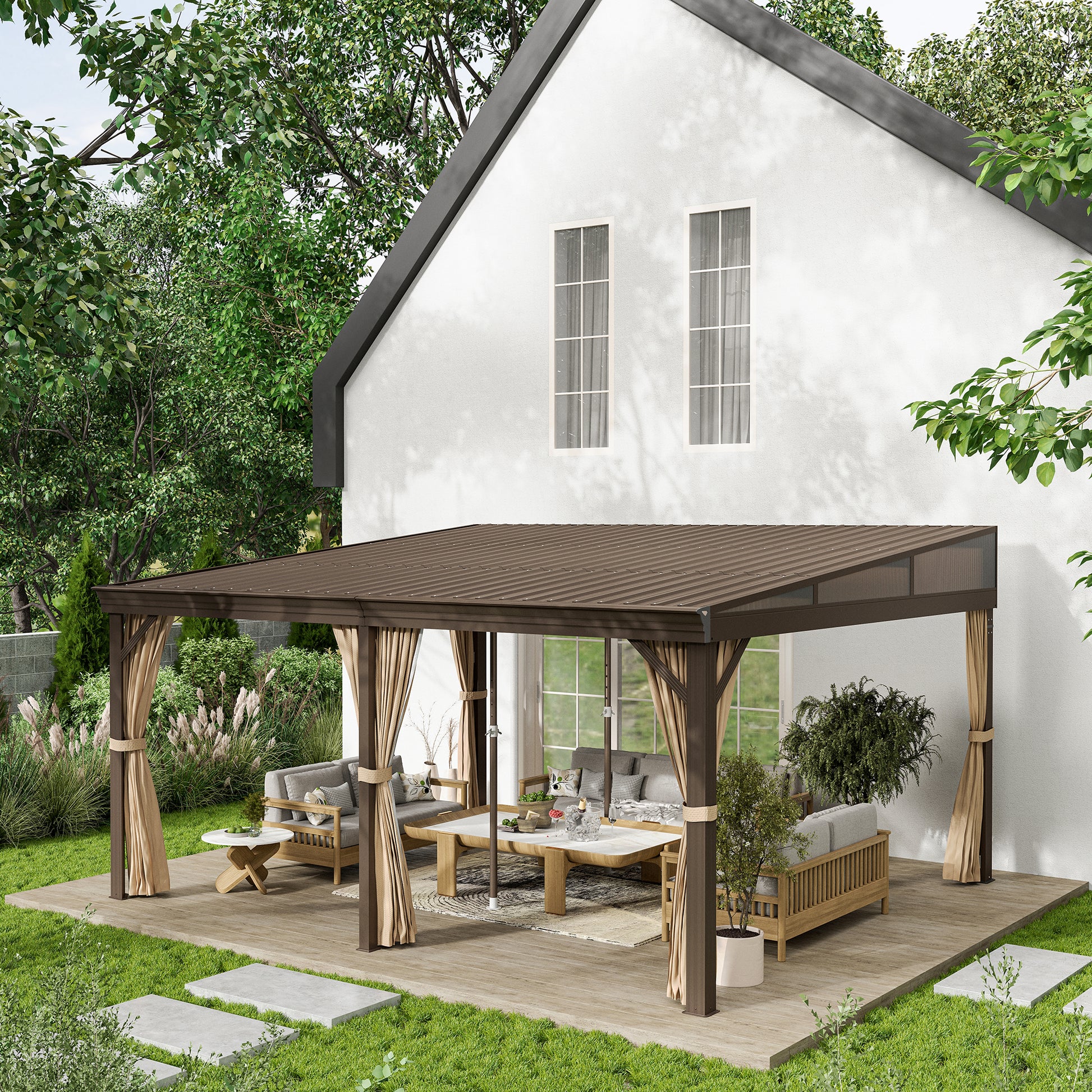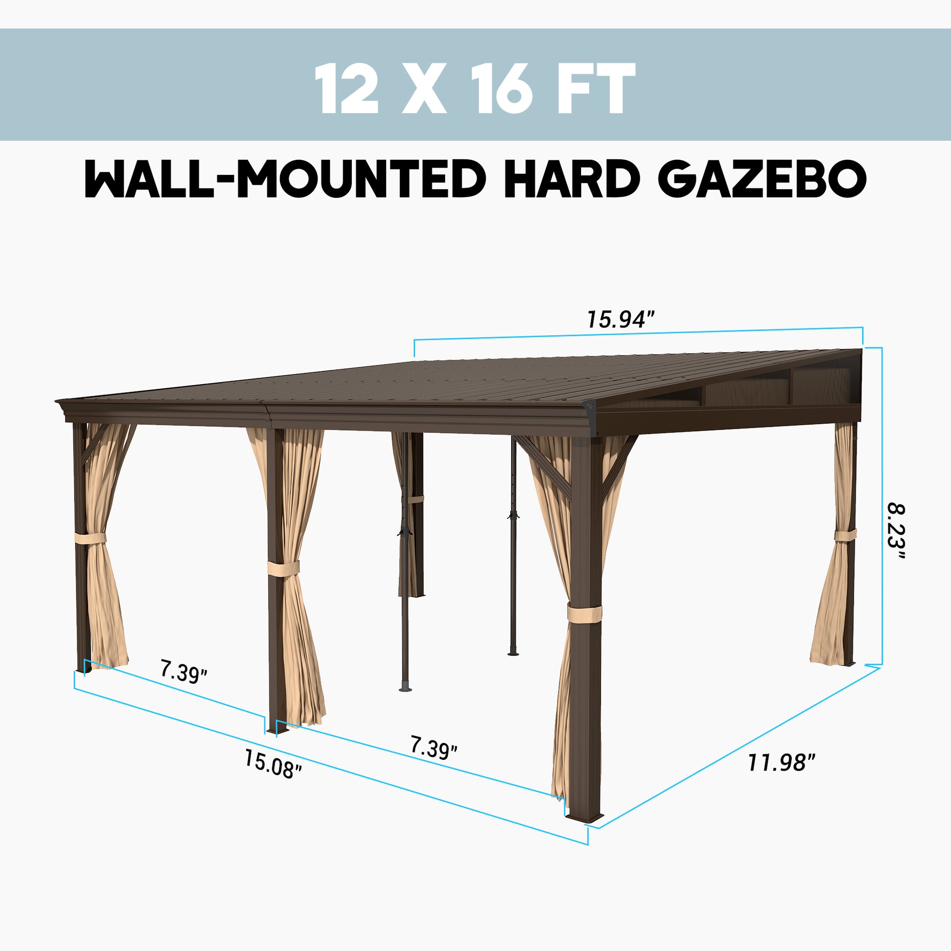 12x16FT Lean to Gazebo, Hardtop Wall Mounted Gazebo with Sloping Galvanized Steel Roof, Aluminum Frame, Drainage System, Curtains and Netting, for Patio, Deck, Garden, Backyard
