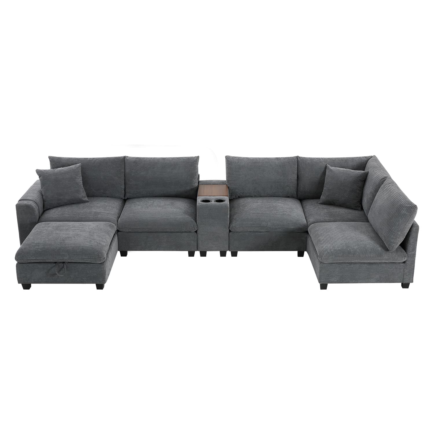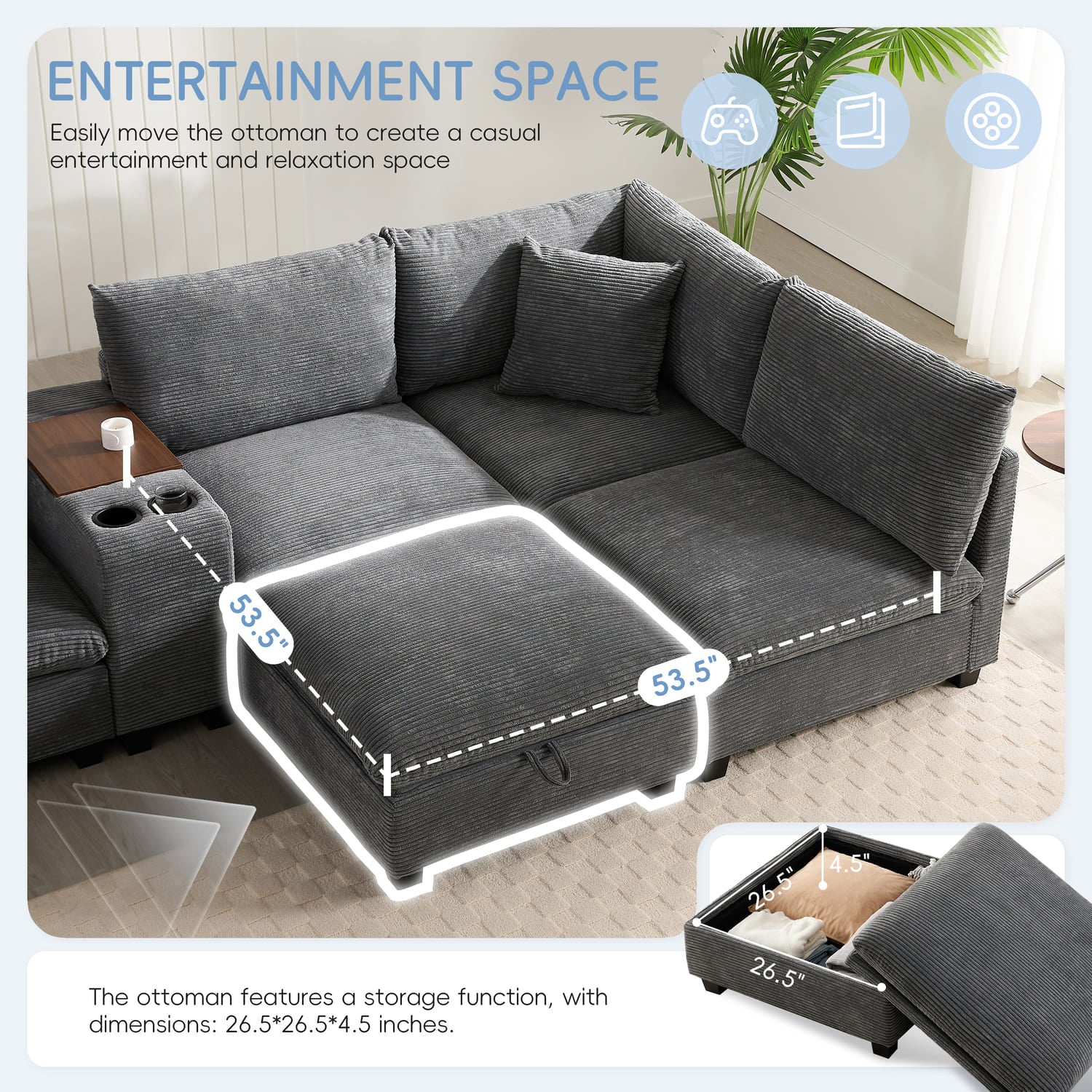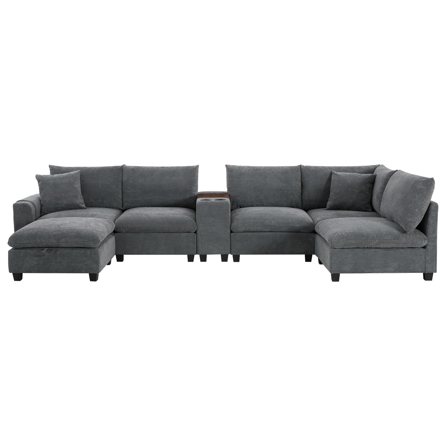 140'' Oversized Modular Sectional Sofa with Movable Storage Ottoman and Console,Removable Storage Pockets,Cup Holder,Wide Seat,USB Charger,6 Seat U Shaped Corduroy Couch for Living Room