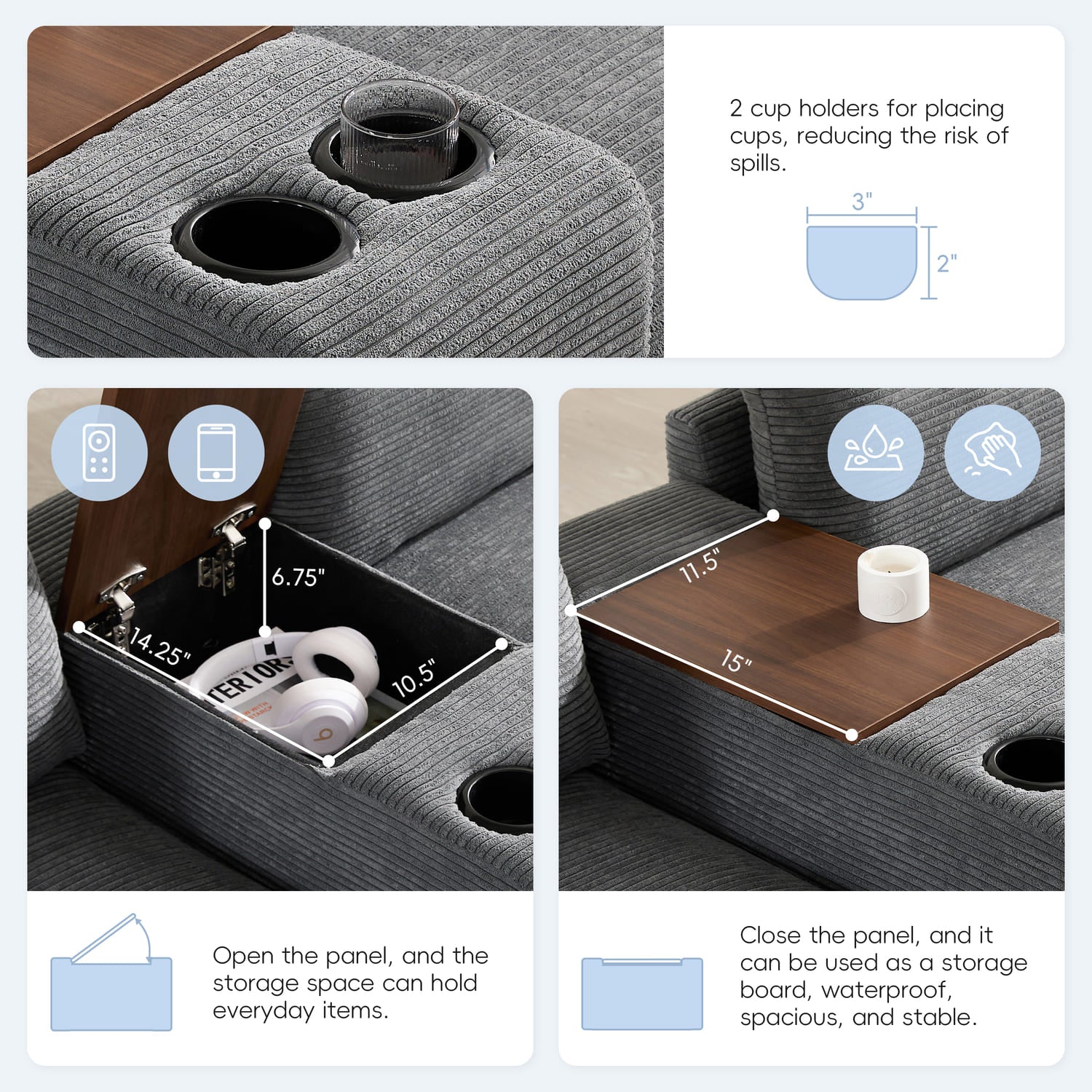 - Console with Storage and Cup Holder: The sofa includes a console with a wooden board for extra storage space and cup holders, making it an ideal place to store your personal items or hold your beverages while watching TV or entertaining guests.