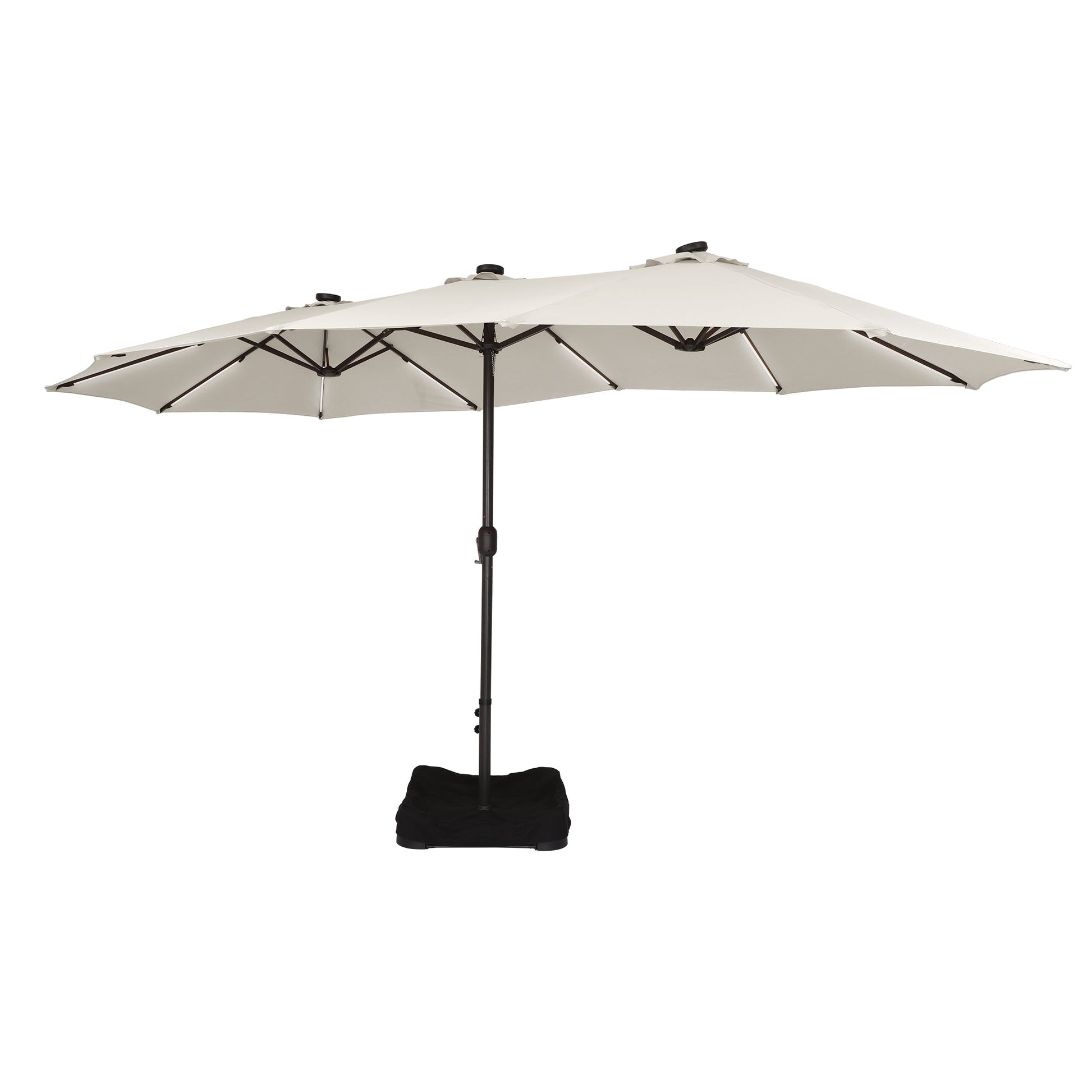 Experience the ultimate outdoor dual-head umbrella featuring detachable lights, solar-powered functionality and a sturdy steel frame. With 3 solar panels, optional sandbags and an innovative design, it provides optimal shade, ventilation and protection. This umbrella has an extra large shade space to provide a spacious shaded area for your outdoor furniture, creating a comfortable place to relax.