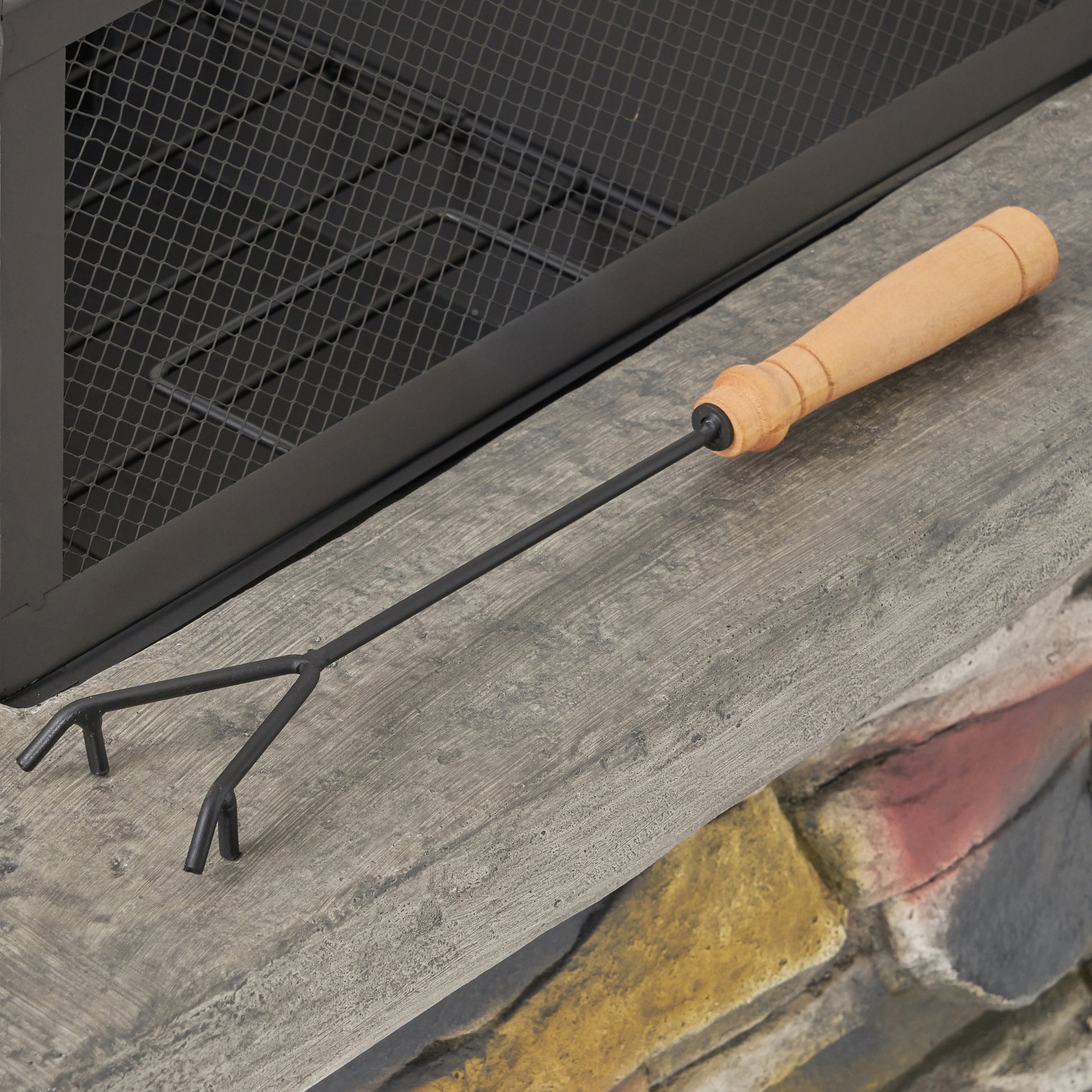 - Includes a poker tool to stoke fire and removing the mesh cover
