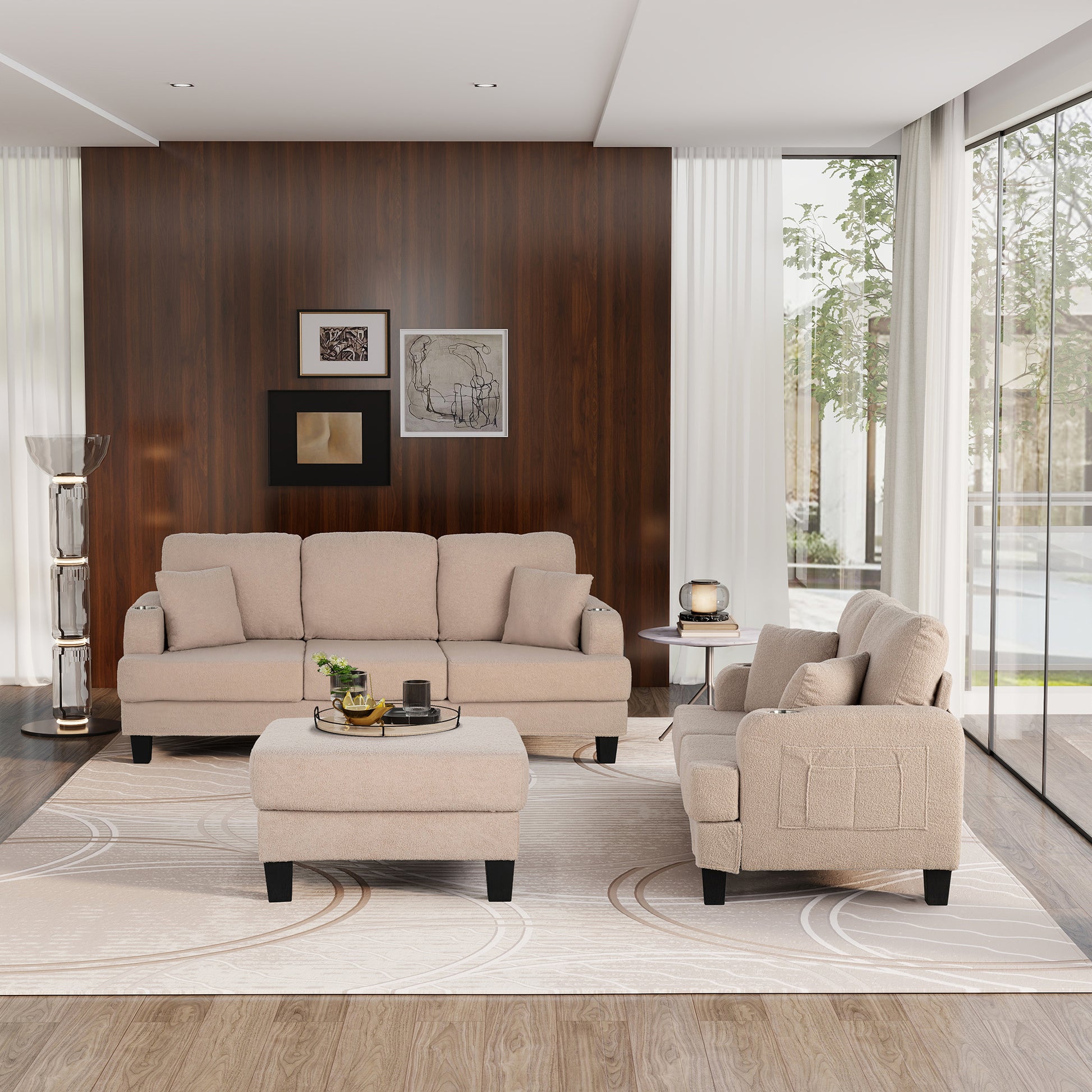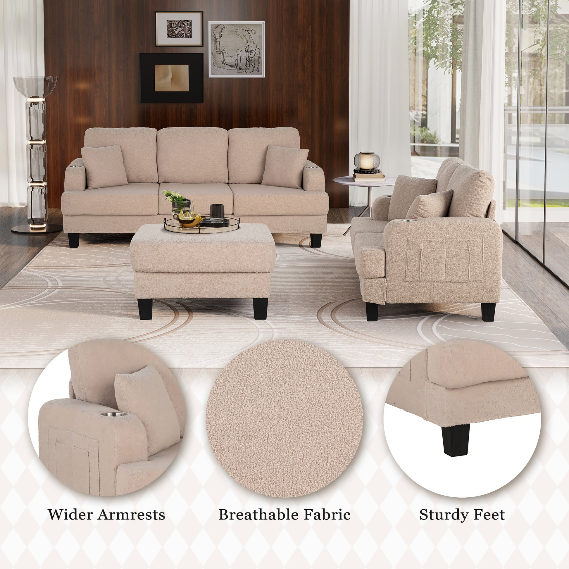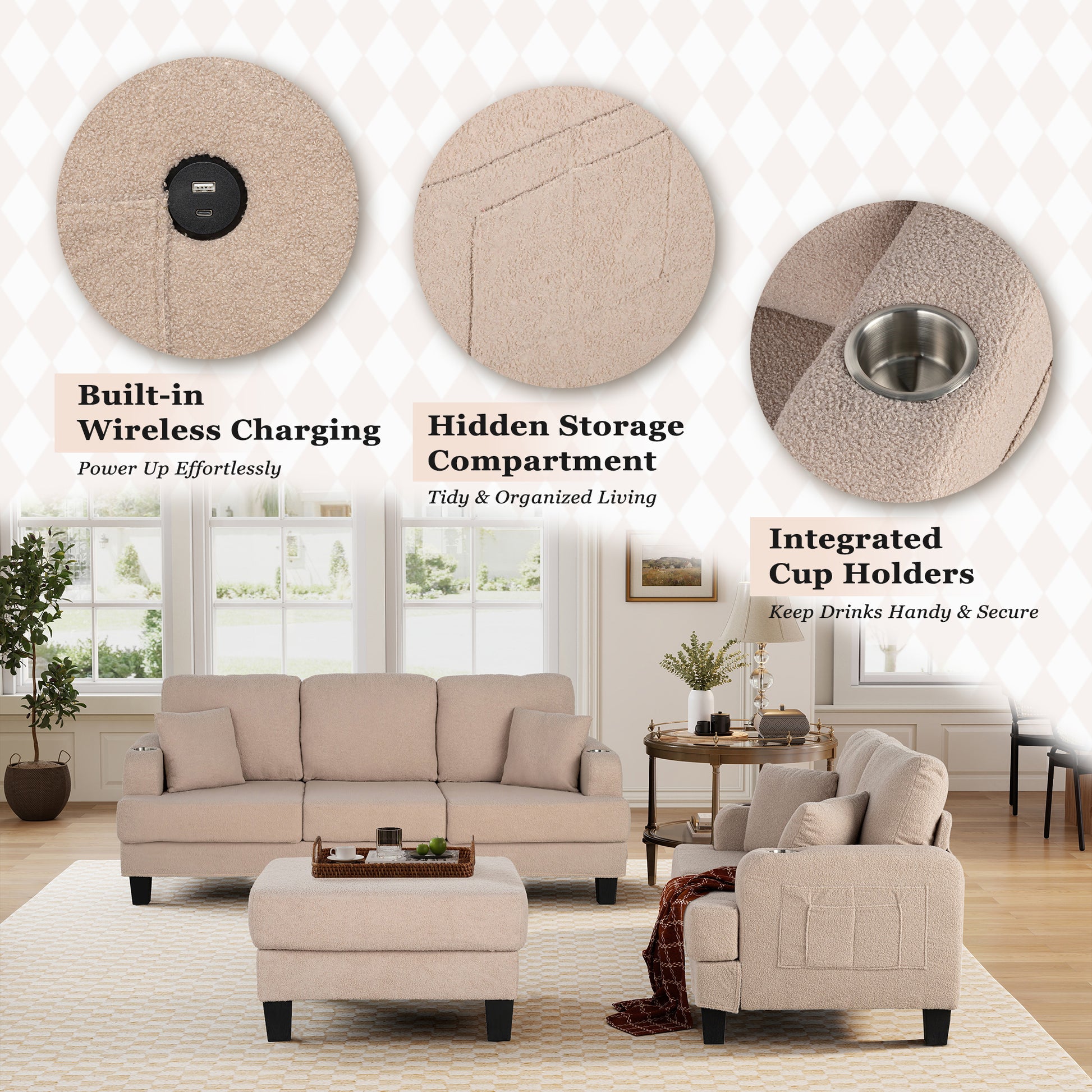 3-Piece Beige/Dark Gray Boucle Fabric Small Space Living Room Set with USB Ports and Cup Holders