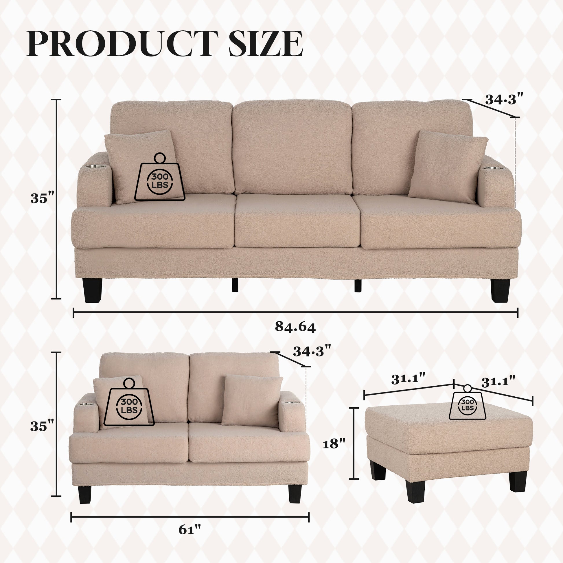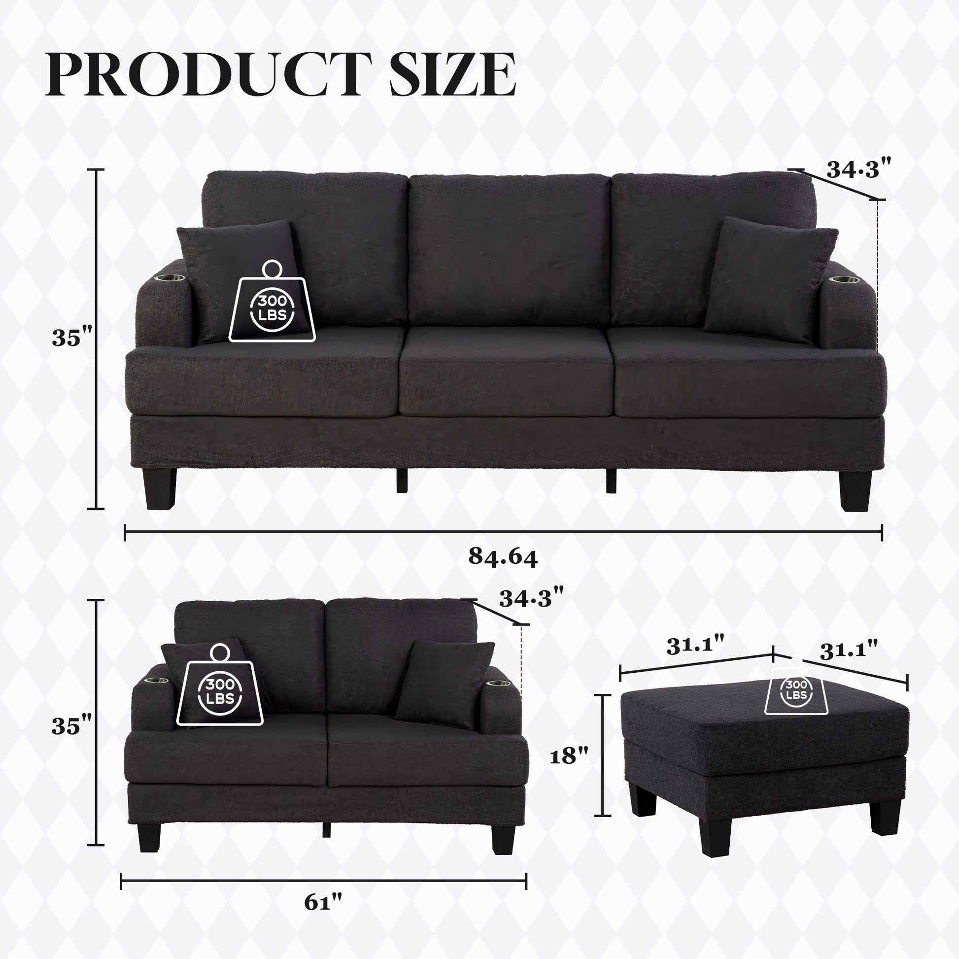 - Sofa: 35.3 in. H x 84.3 in. W x 34 in. D, loveseat: 35.3 in. H x 60 in. W x 34 in. D, ottoman: 17 in. H x 31 in. W x 31 in. D