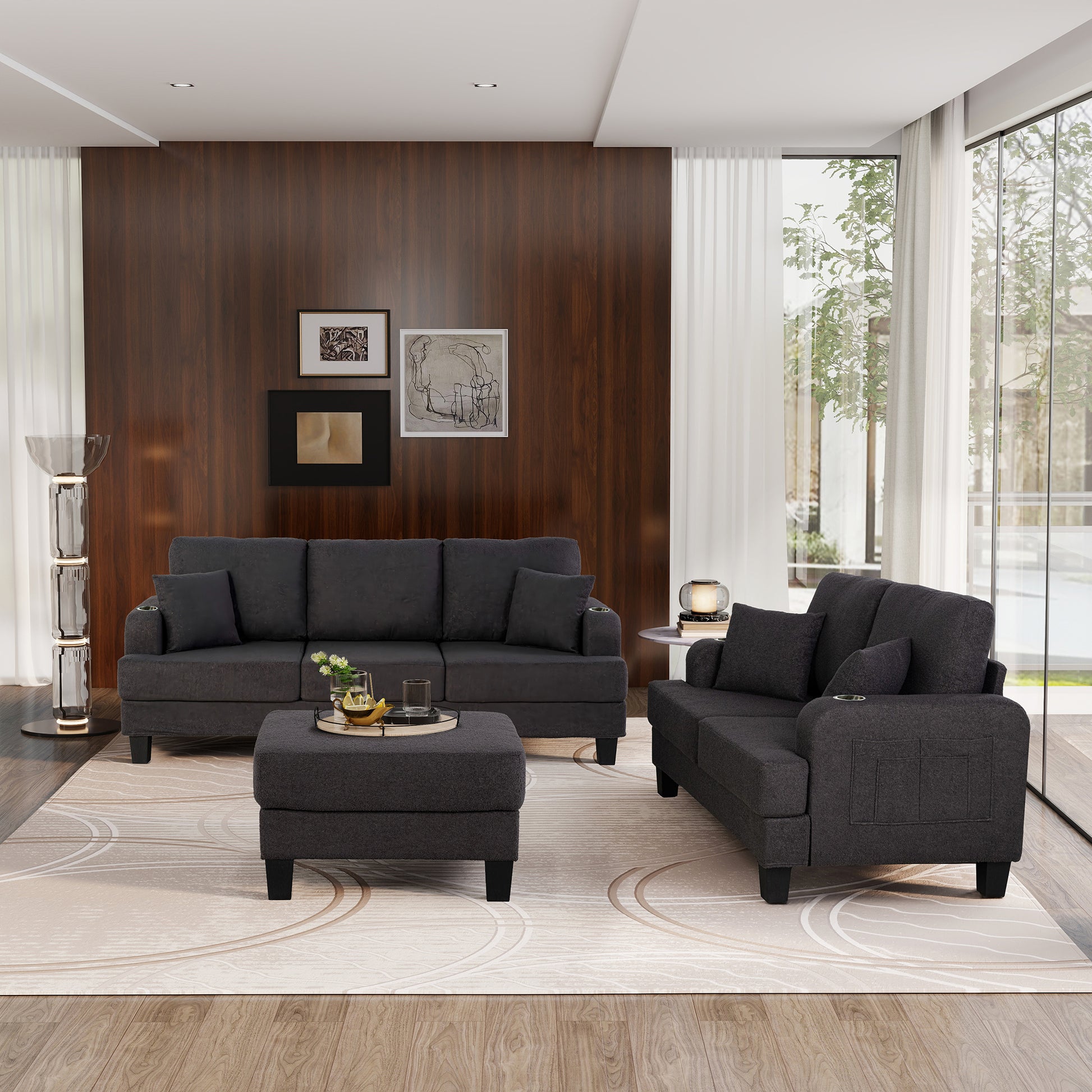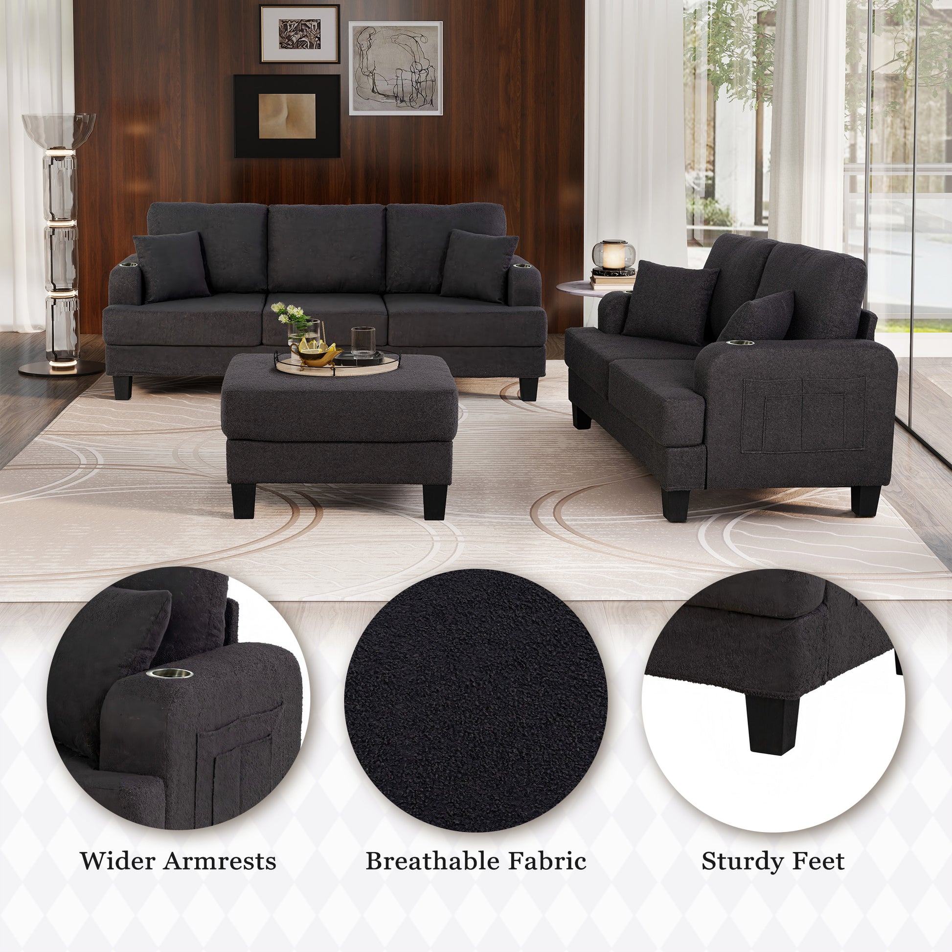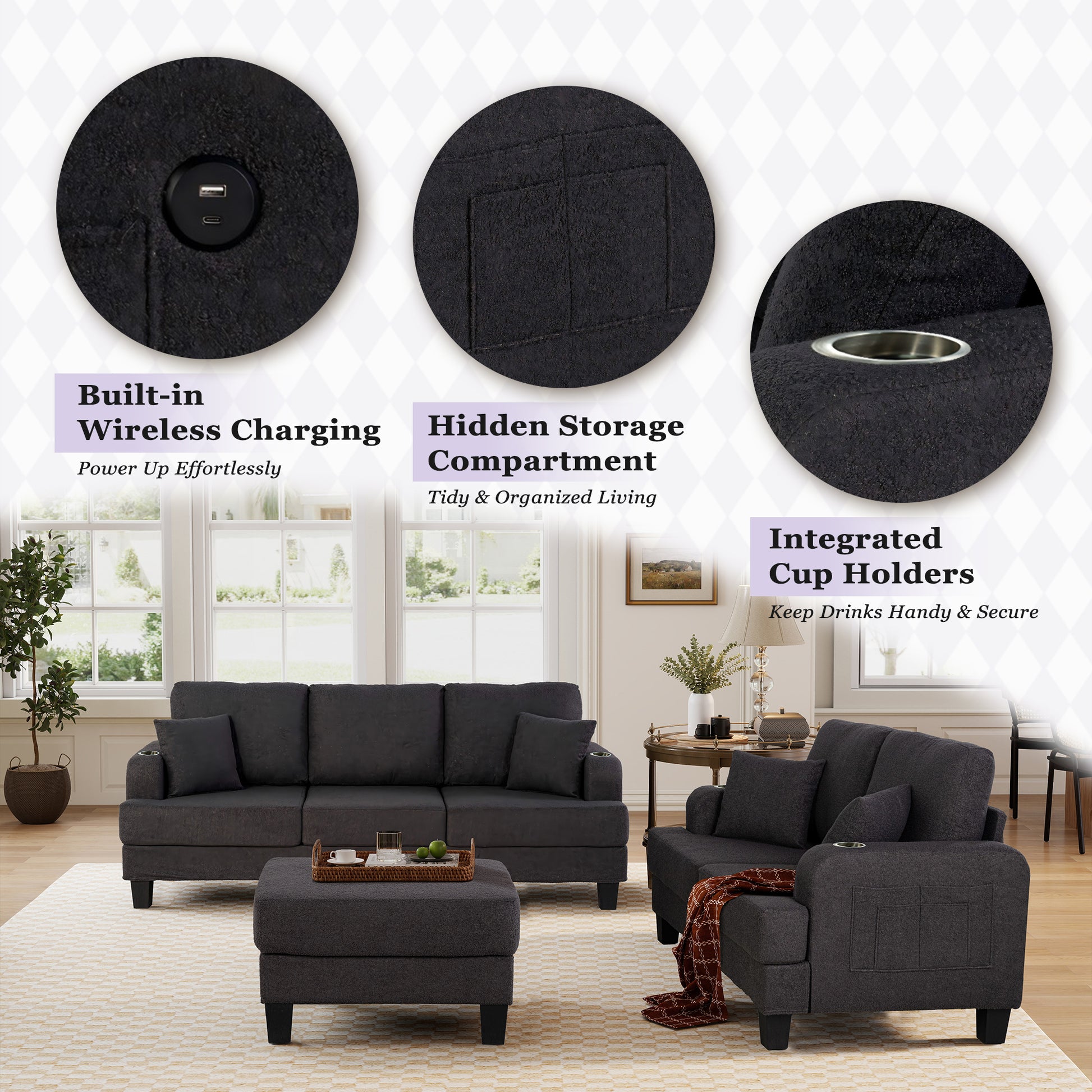 This 3-piece living room set is designed to bring comfort and convenience to small spaces without sacrificing style. Available in beige or dark gray finishes, each set includes a plush loveseat, a matching sofa, and a coordinating ottoman. The compact profile is ideal for apartments or cozy living areas, while the built-in cup holders and USB charging ports add everyday functionality. Soft cushions and tailored lines give this set a relaxed yet polished look that suits both modern and traditional interiors.