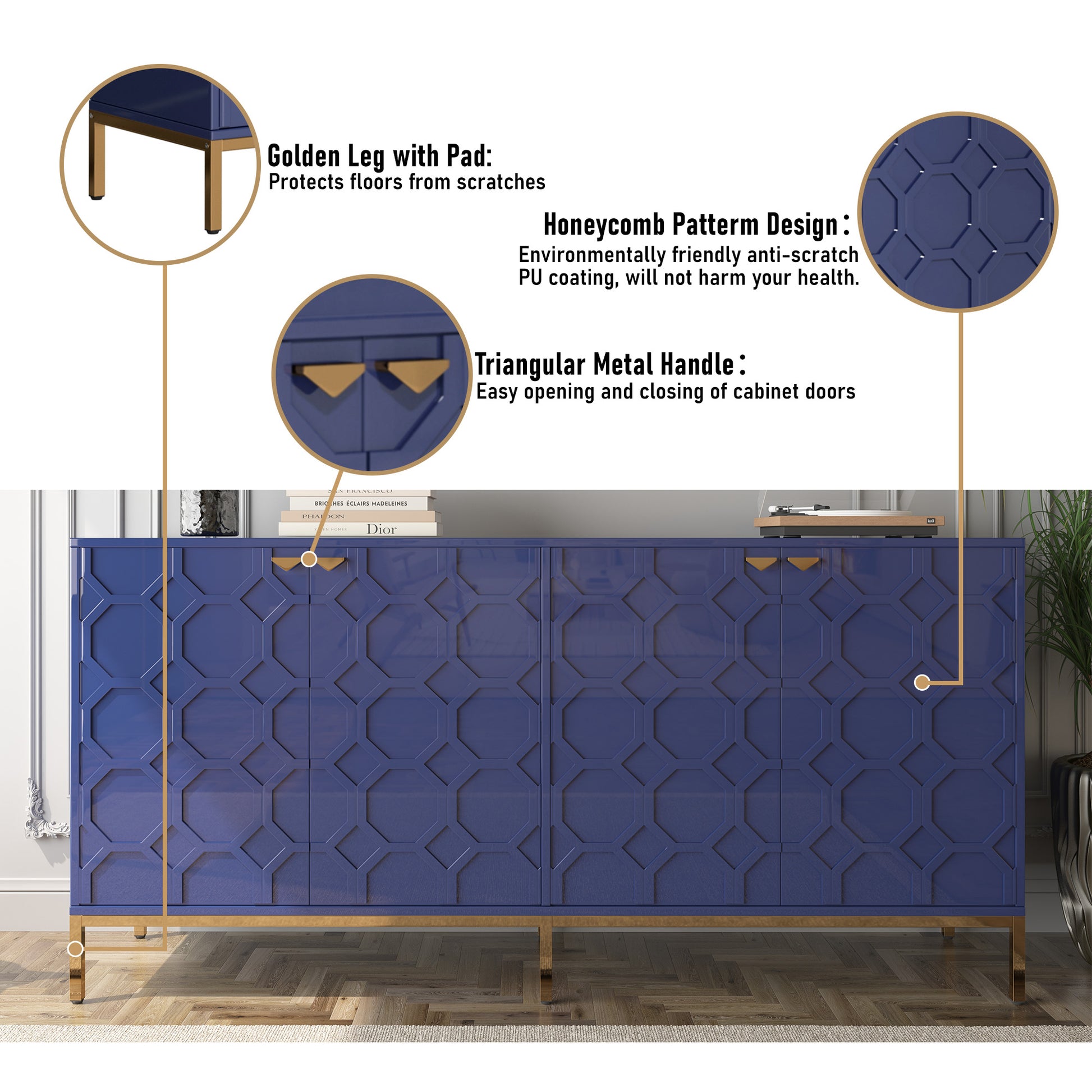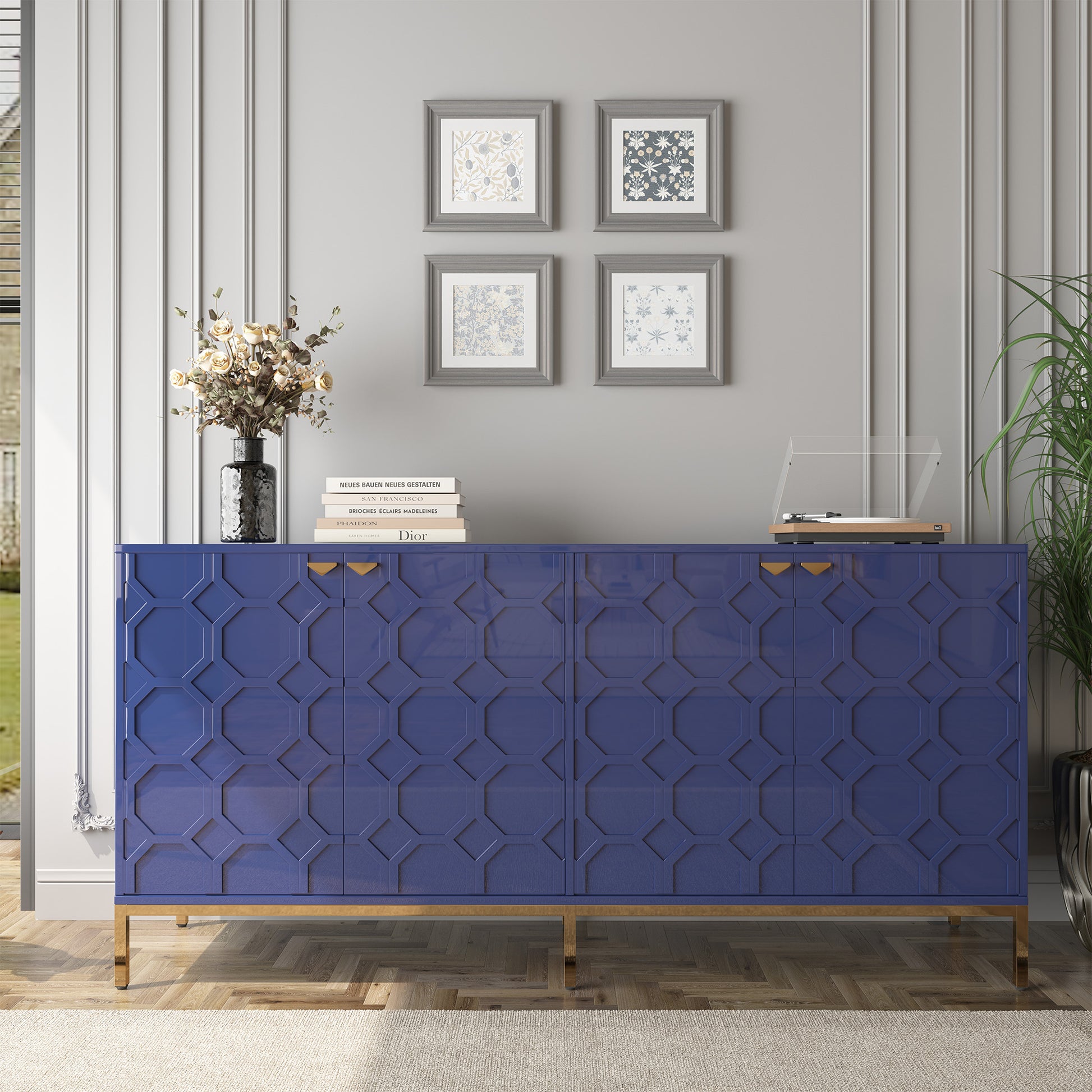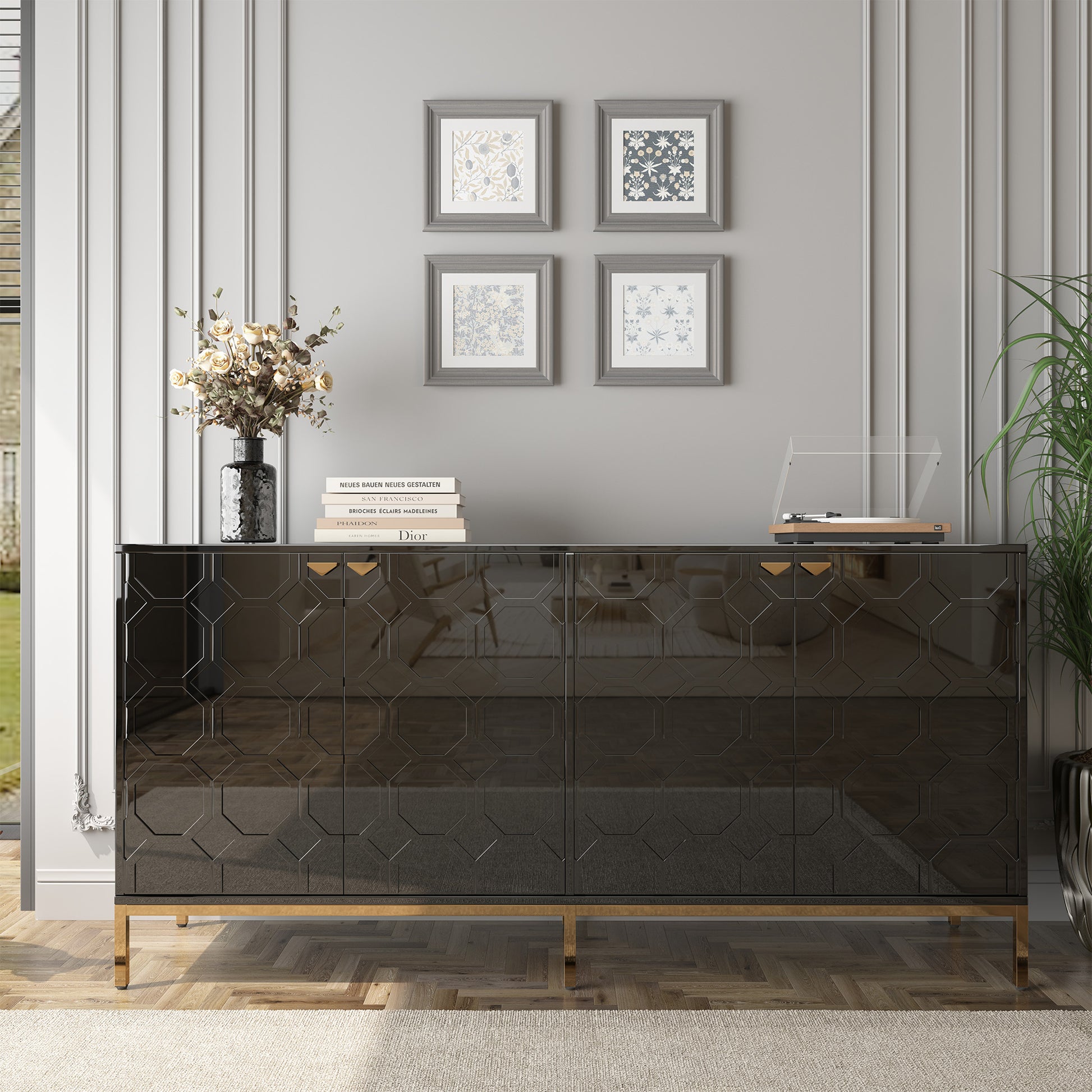 - A combination of beauty and practicality: the 4-door high gloss sideboard not only has an eye-catching appearance but also focuses on practicality. Designed with the user's storage needs and space utilization efficiency in mind, it provides easy access to storage and removal of items while enhancing the overall décor, making the dining room or home more aesthetically pleasing and comfortable.