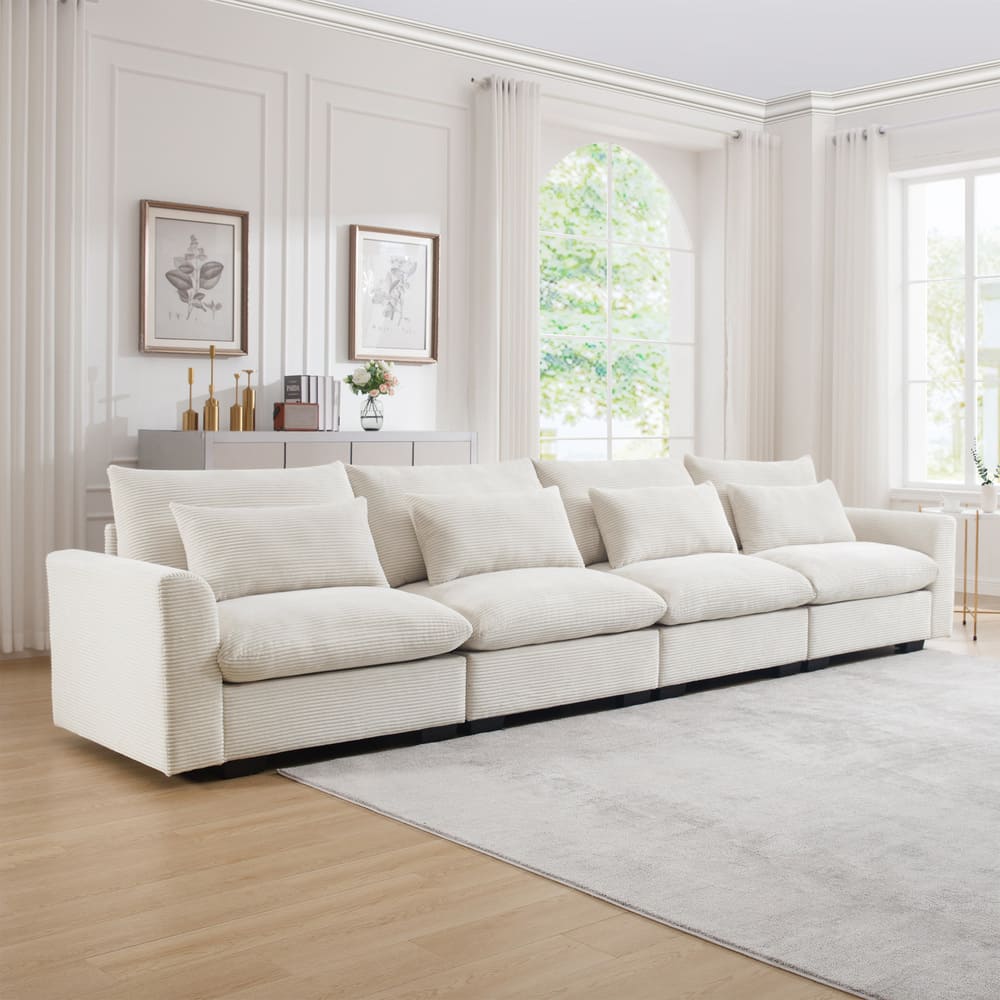 4 Seater Deep Seat Couches for Living Room, Comfy Beige Corduroy Sofas for Living Room Modern with 4 Waist Pillows