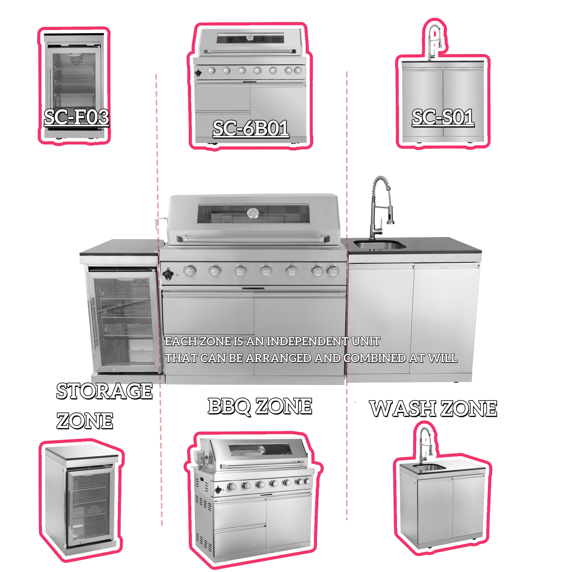 - STAINLESS STEEL CONSTRUCTION - This modular outdoor kitchen is made of 304 marine grade stainless steel, a high-quality material that is known for its durability & resistance to corrosion & rust that also adds sleek, modern, and stylish addition to your backyard or patio. High consistent heat output are made possible by the stainless steel burners, allowing you to cook a variety of food and meals with ease. The stainless steel components also make the grill easy to clean and maintain.