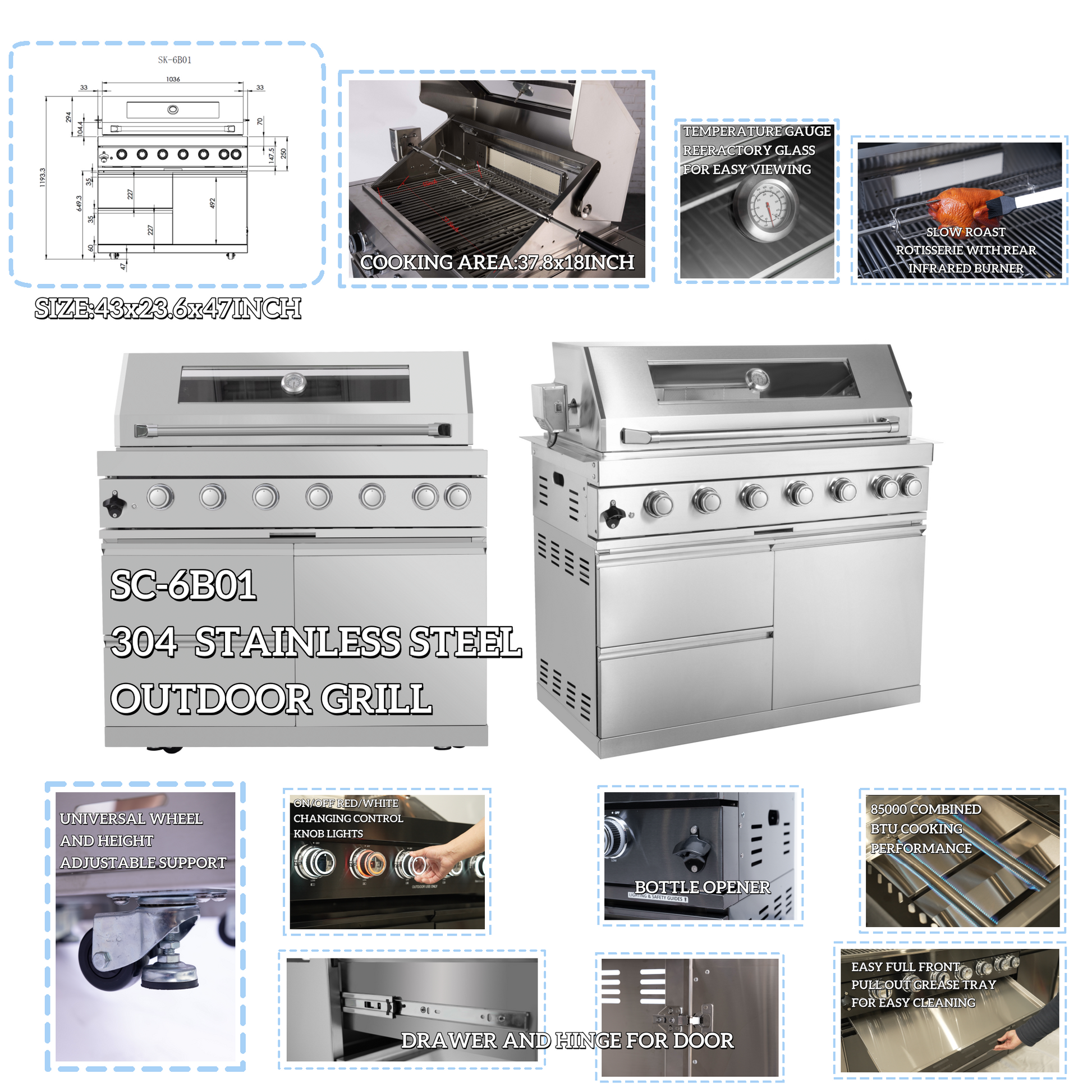 - ISLAND FEATURES -The SC2404B 96-inch island gas grill arrives almost fully assembled and features 6 tubular stainless steel high efficiency burners with a rear height-adjustable ceramic infrared rear burner and a standalone side burner that produce 85000 BTU’s of heat output. The grill also features a stainless steel warming rack, 8mm stainless steel cooking grids and a generous cooking area of 38-inches x 18-inches (684 square Inches of total cooking area).