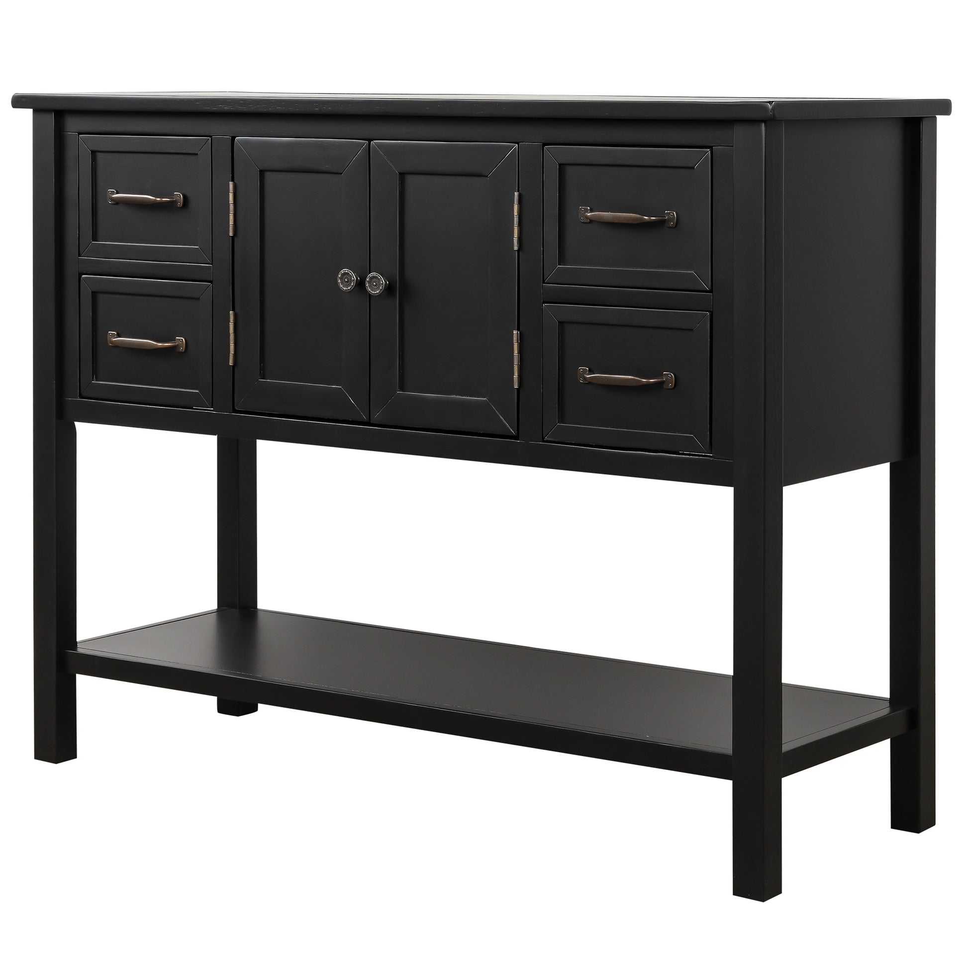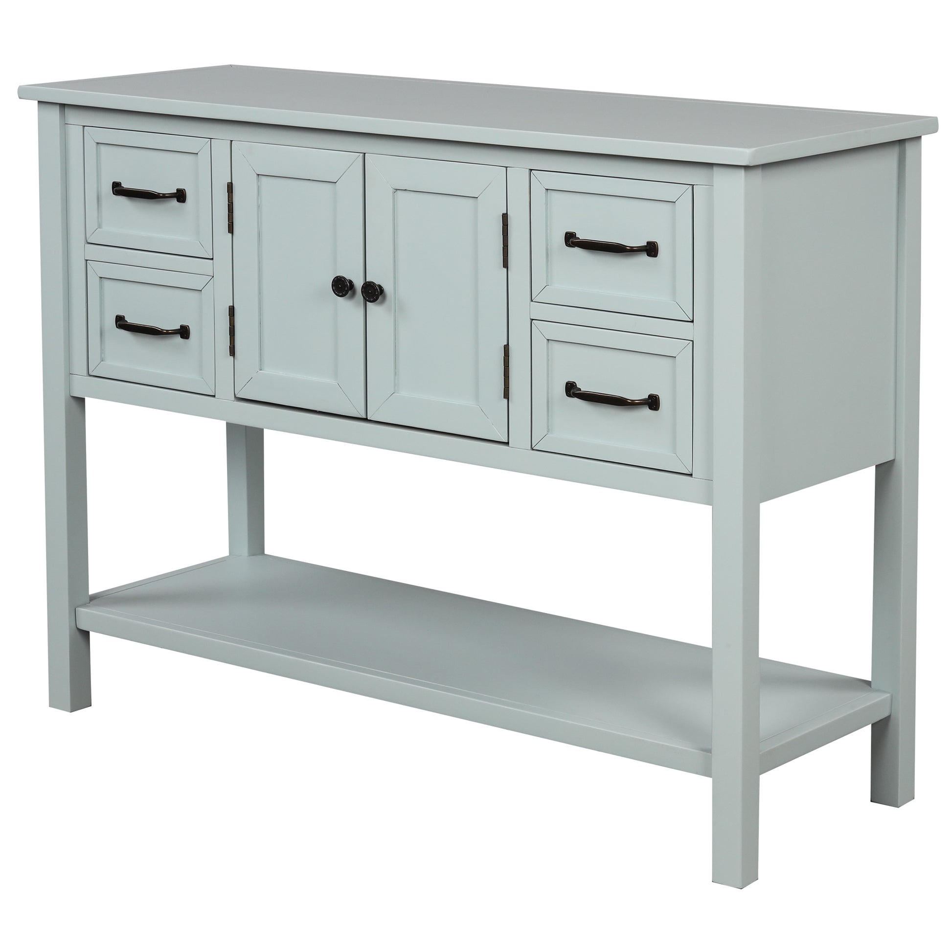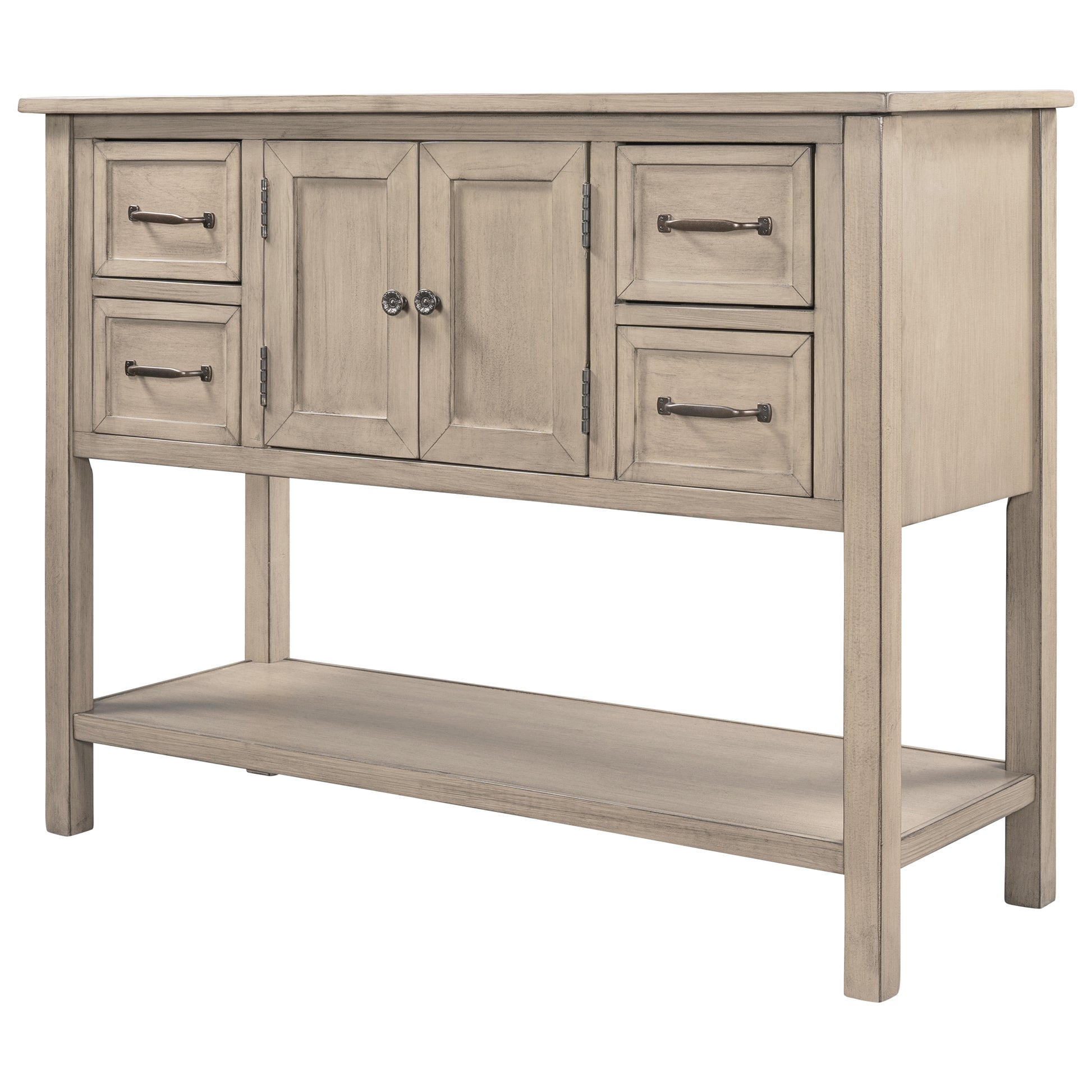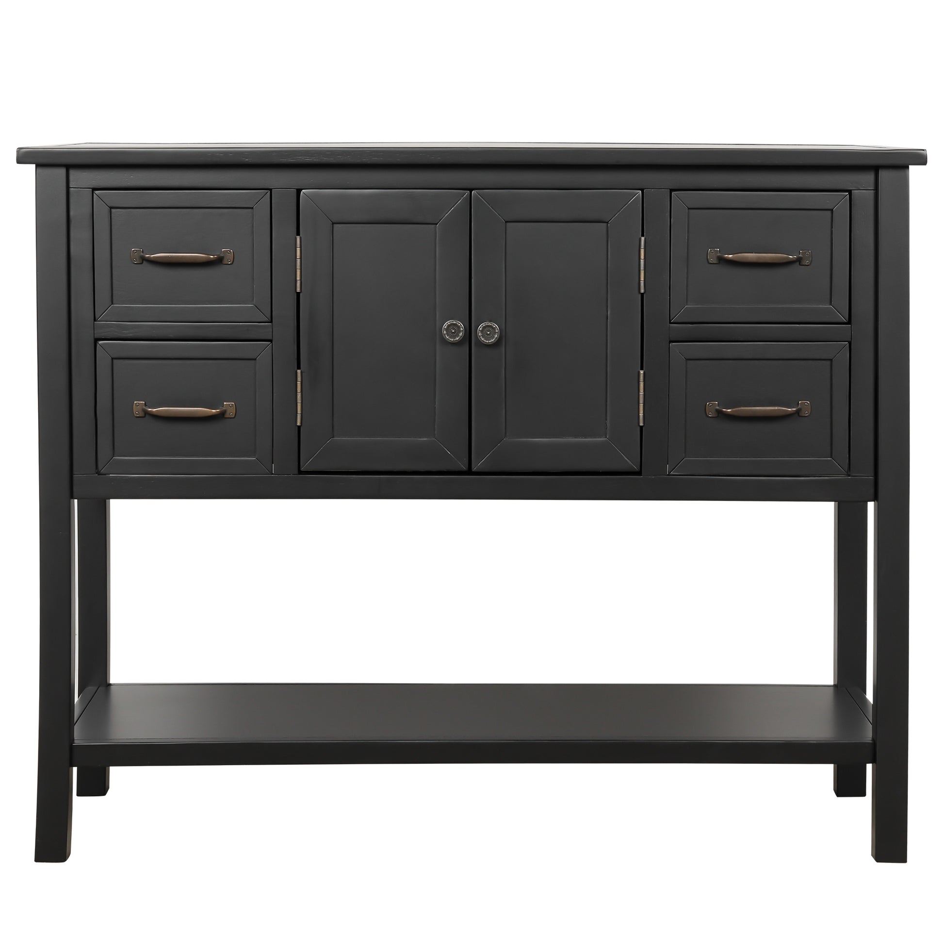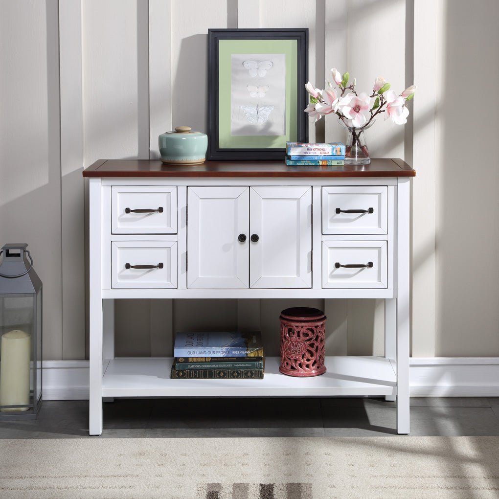 - Effortlessly fill in that blank space in your home with this console table, designed to fit all of your needs and more. Crafted with a classic vintage appearance, this table comes complete with two front facing cabinet doors that open to reveal a spacious interior, perfect for stowing away your larger necessities and keeping them out of sight. The 4 matching compact side drawers minimize clutter, offering plenty of space to hold smaller items such as keys or mail while the spacious bottom shelf is the perfect place for storage baskets, shoes and more.