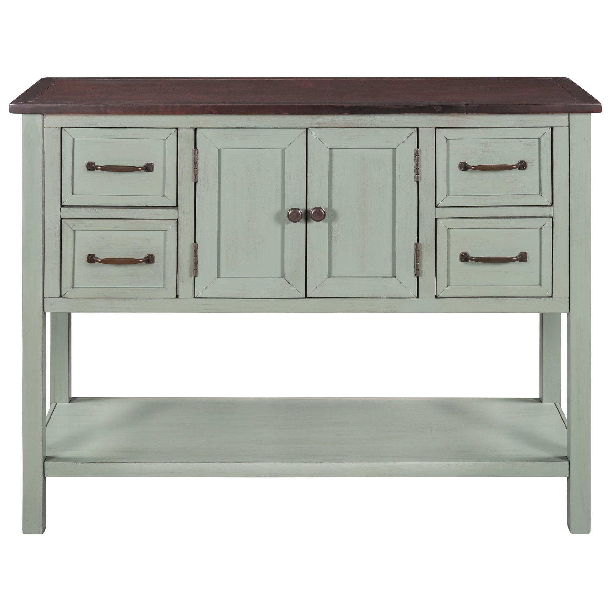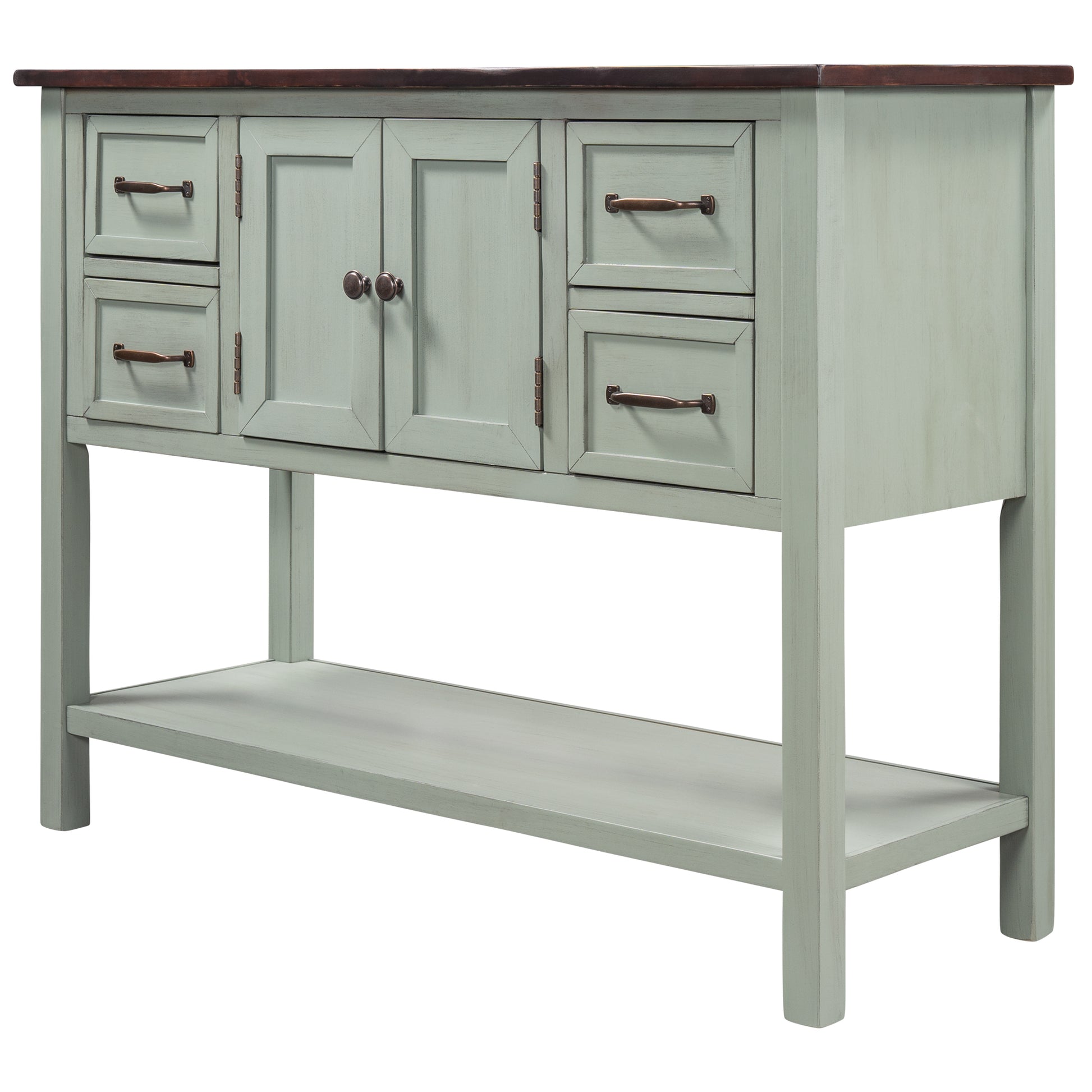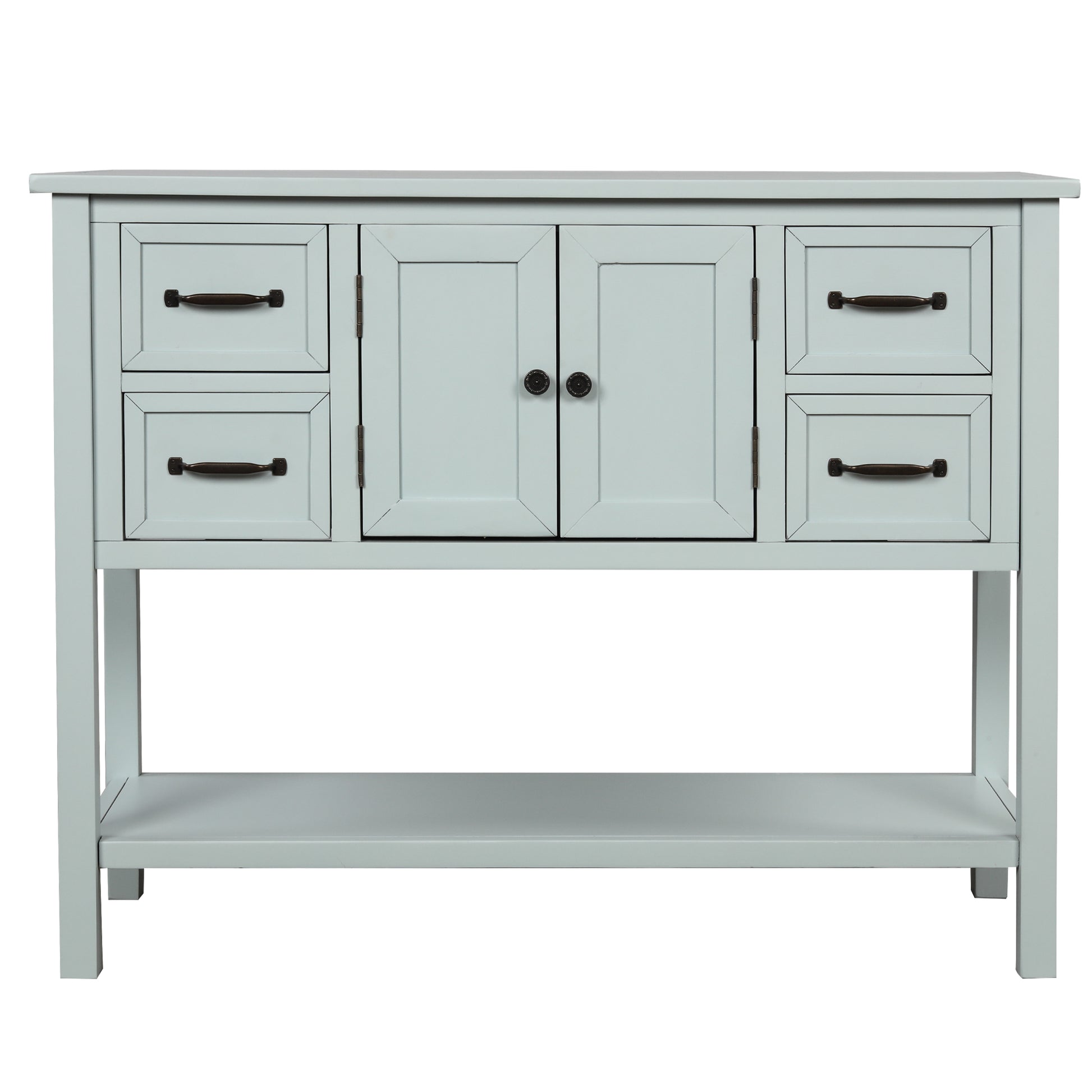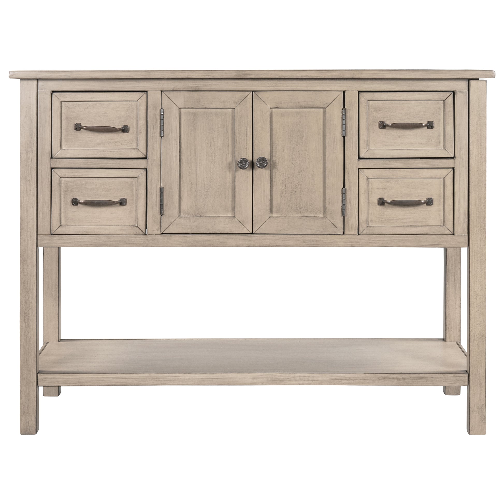 - Effortlessly fill in that blank space in your home with this console table, designed to fit all of your needs and more. Crafted with a classic vintage appearance, this table comes complete with two front facing cabinet doors that open to reveal a spacious interior, perfect for stowing away your larger necessities and keeping them out of sight. The 4 matching compact side drawers minimize clutter, offering plenty of space to hold smaller items such as keys or mail while the spacious bottom shelf is the perfect place for storage baskets, shoes and more.