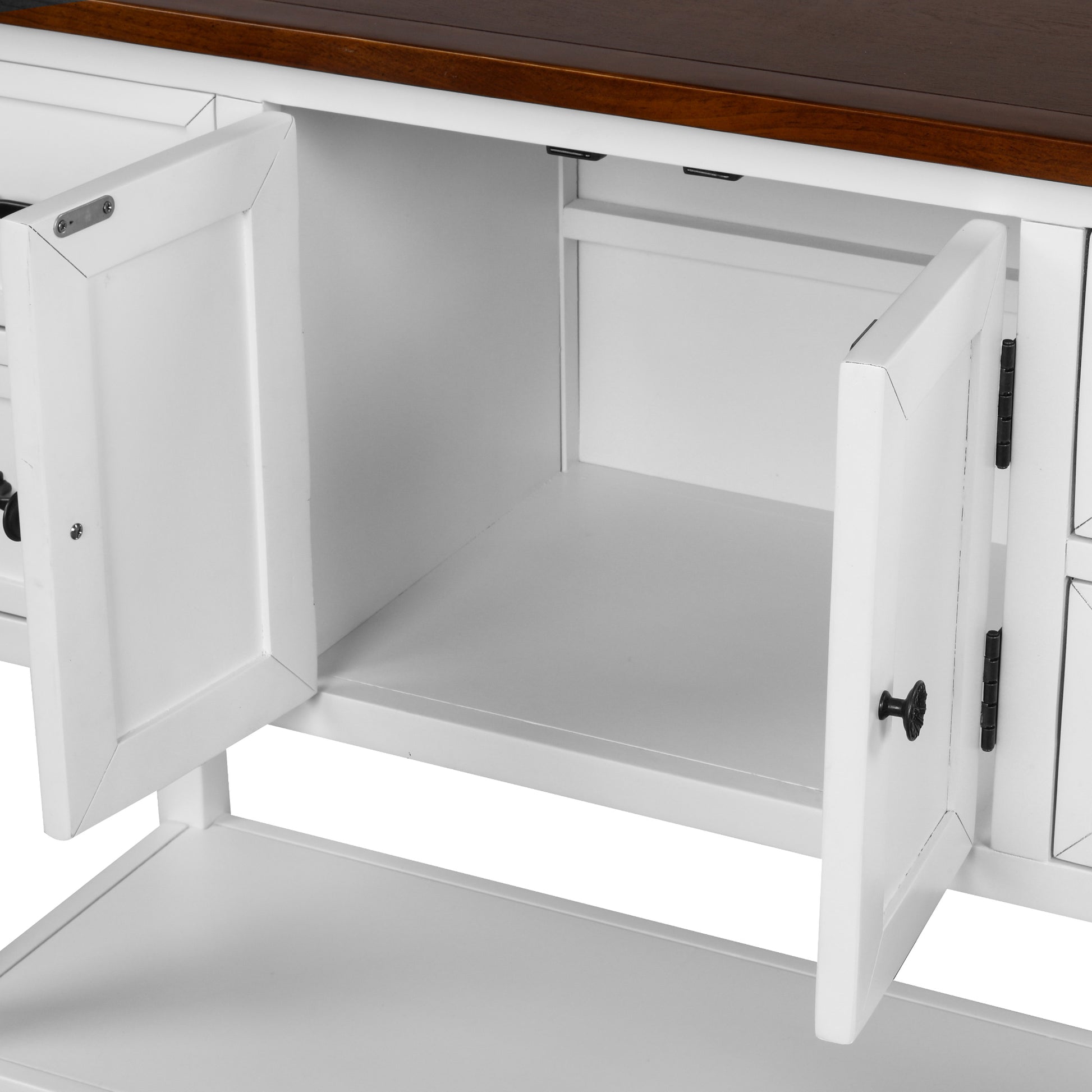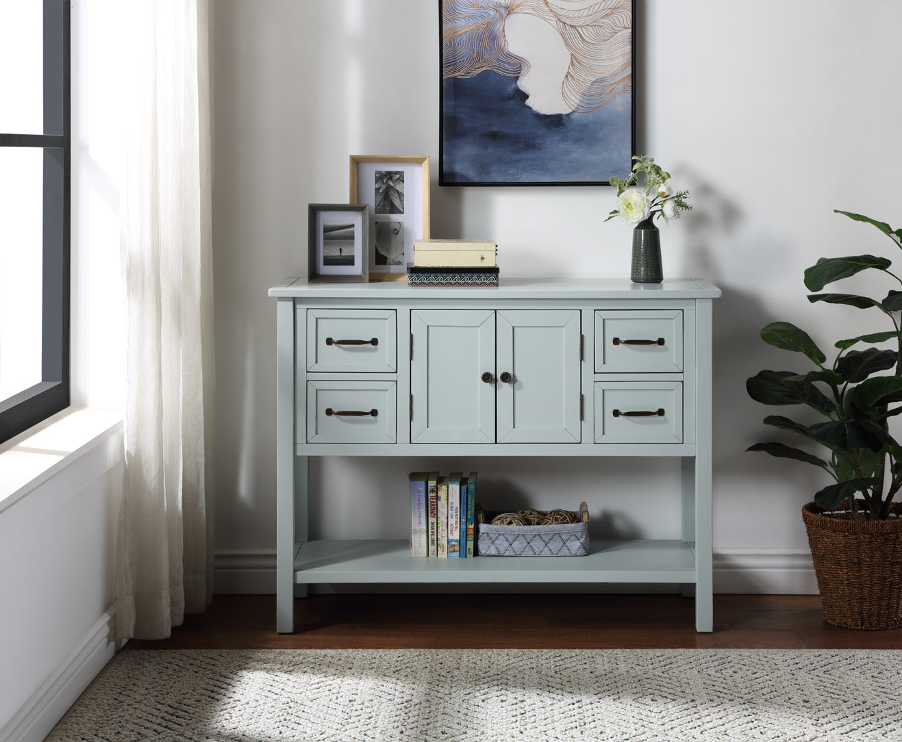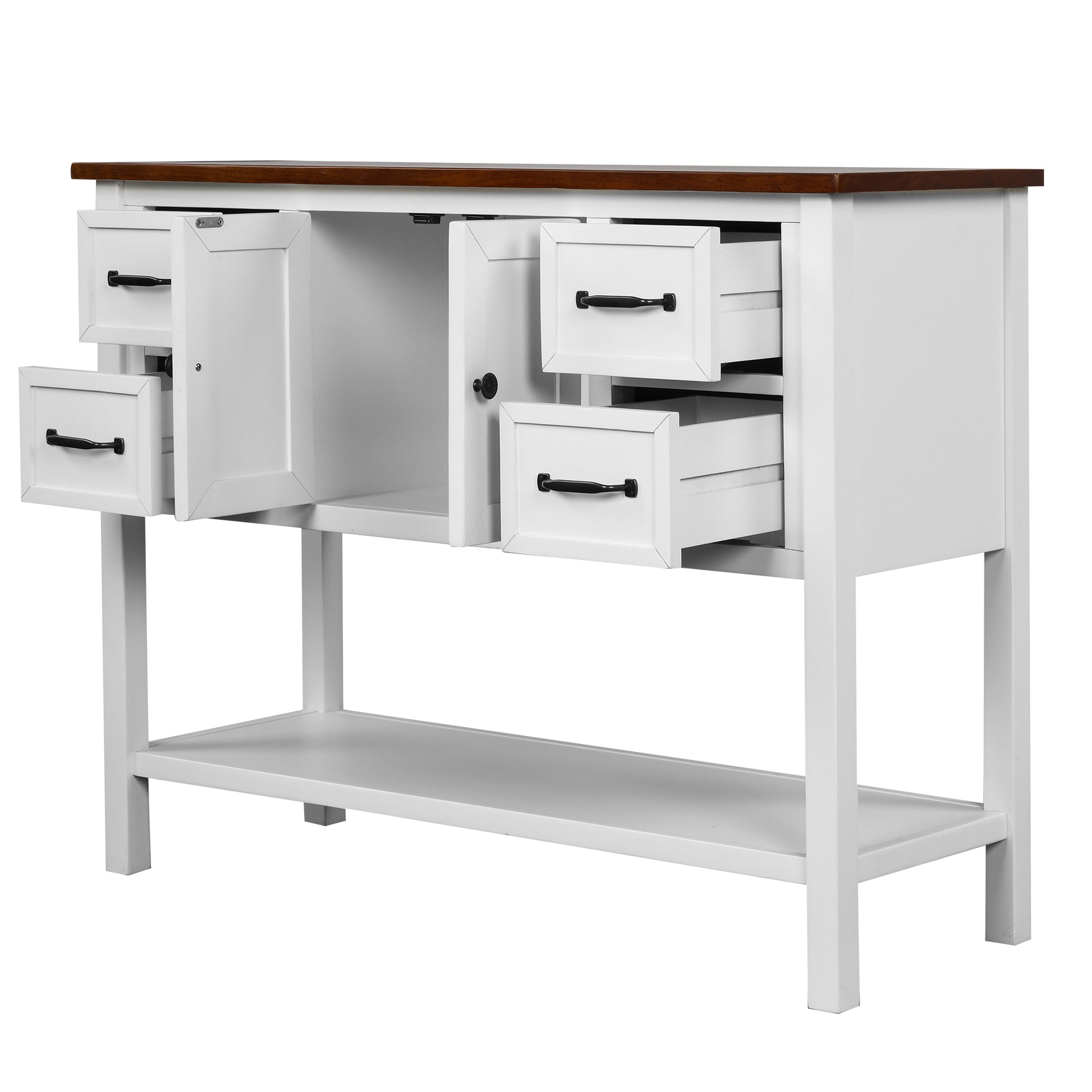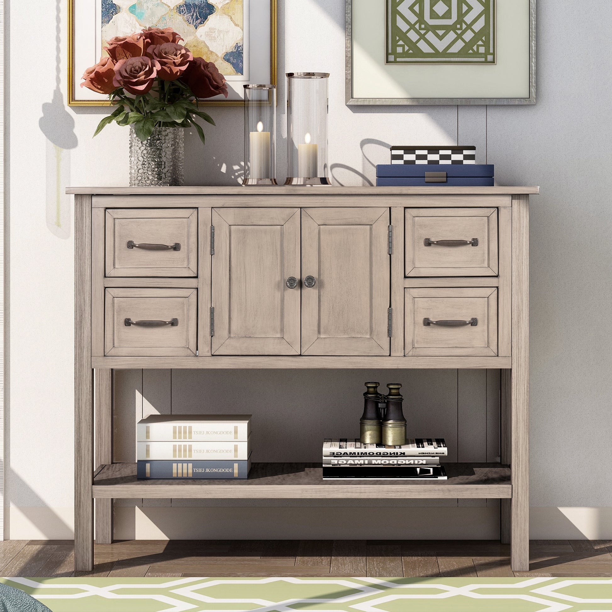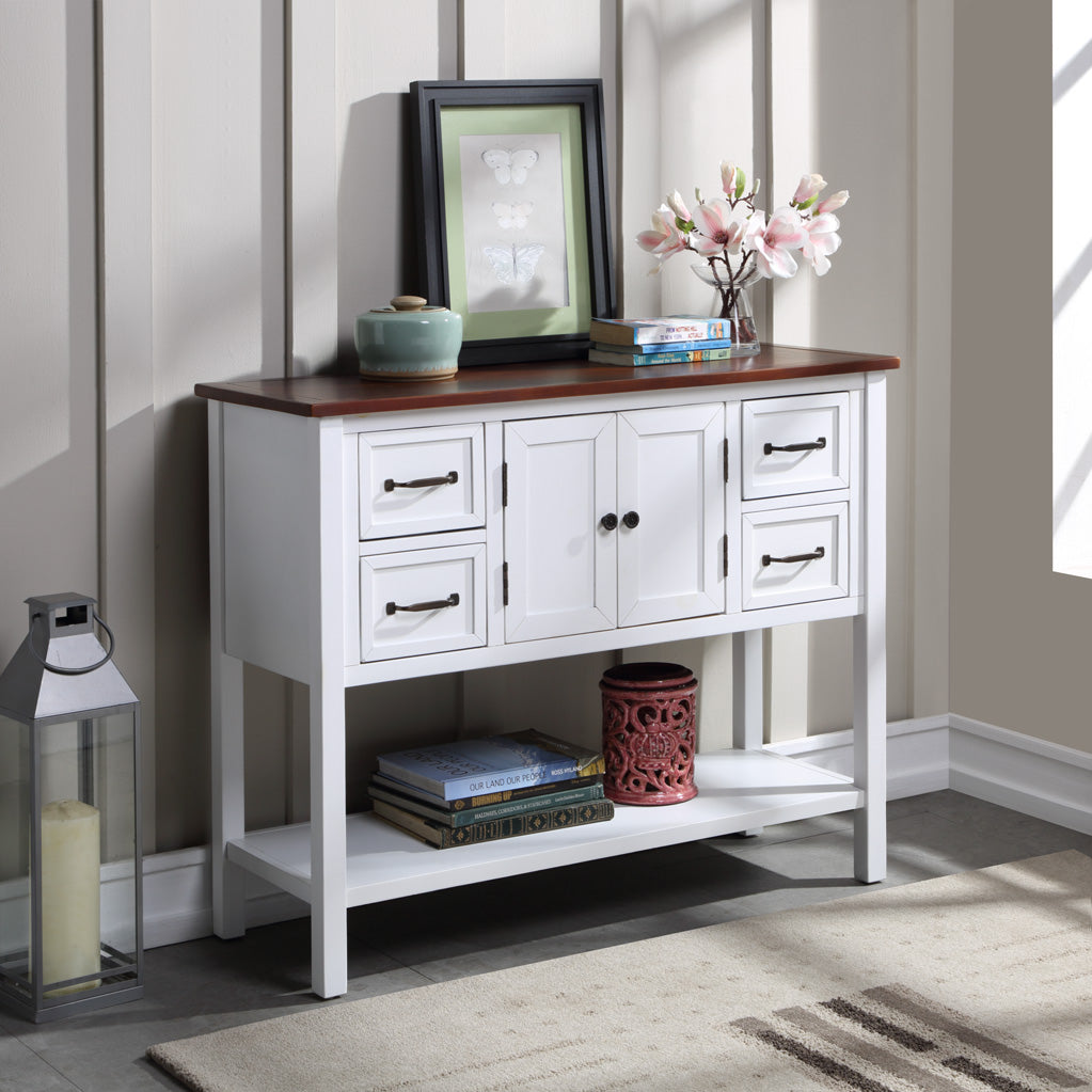 - [High Storage Capacity] �With built in shelving ranging from the front double doors to the 4 accent side drawers, users will have plenty of space to store their belongings and avoid letting clutter accumulate on the console table.