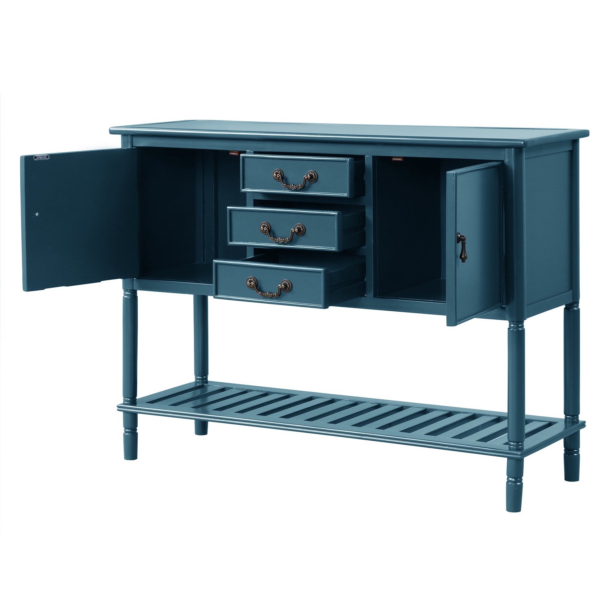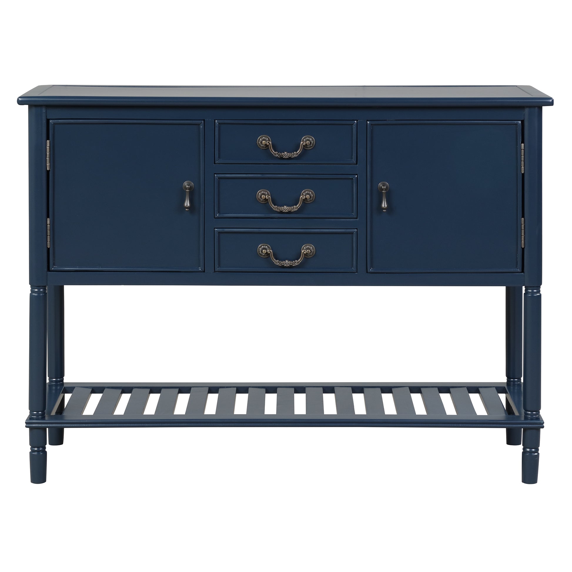 - Our console table is functional designed, meet diversifying storage demands. There are three drawers and two cabinets to provide sufficient storage space for your files, daily necessities, sundries and keep organized. The bottom shelf can support dictionaries, books, or pot culture, etc. Top board can place your favorite photos, vase, decorations, lamps or other knickknacks.