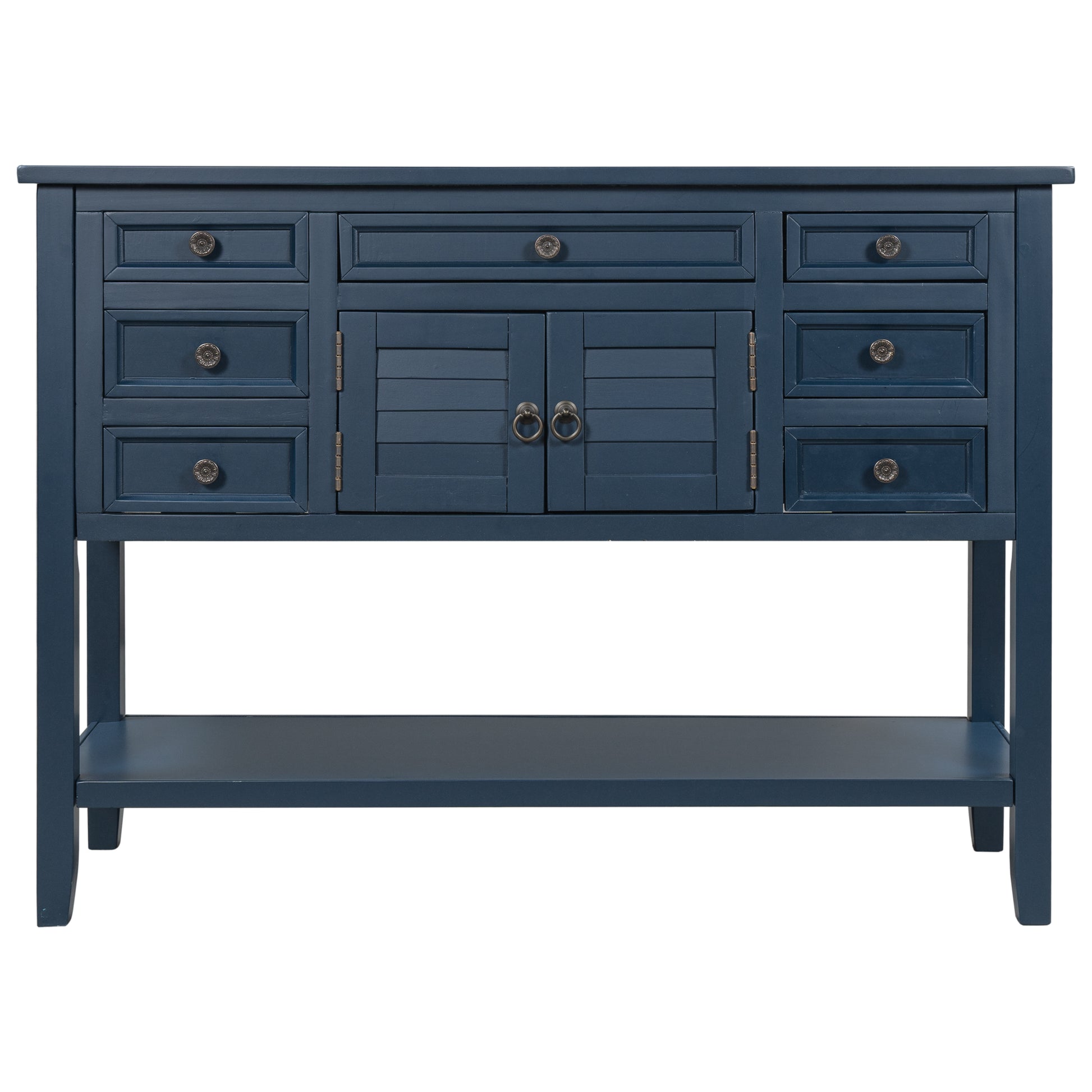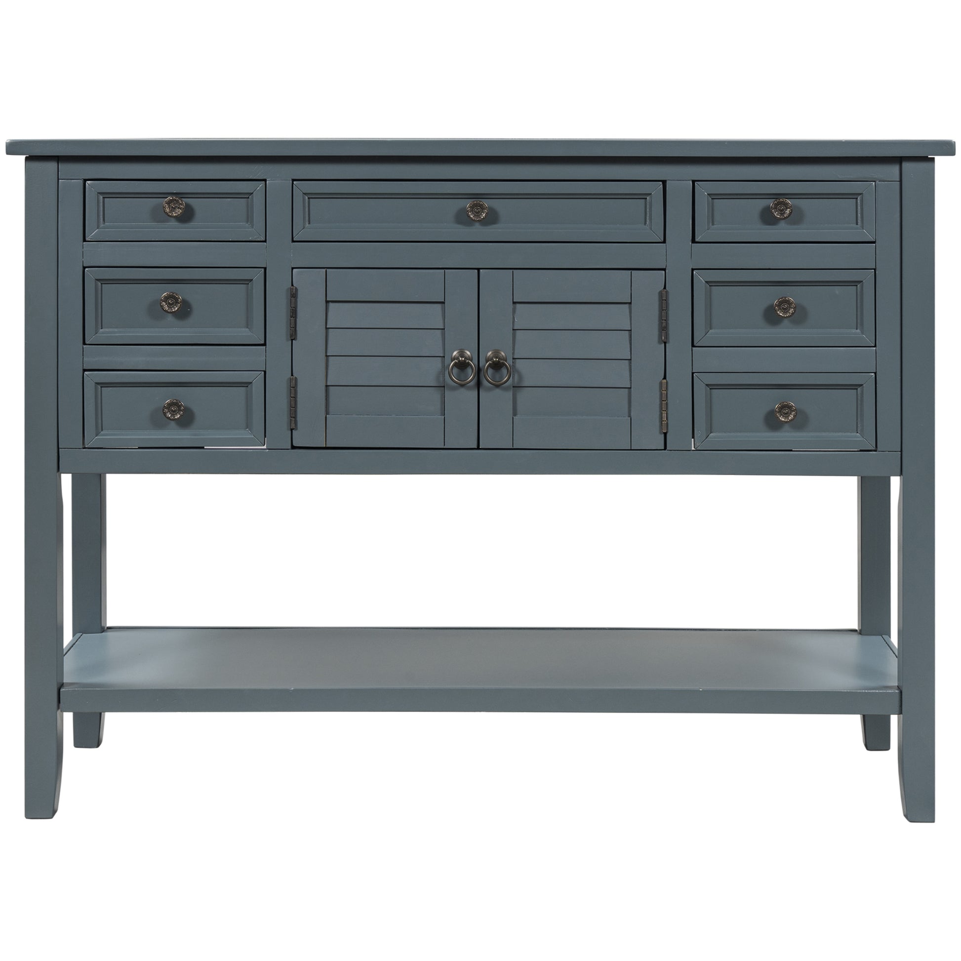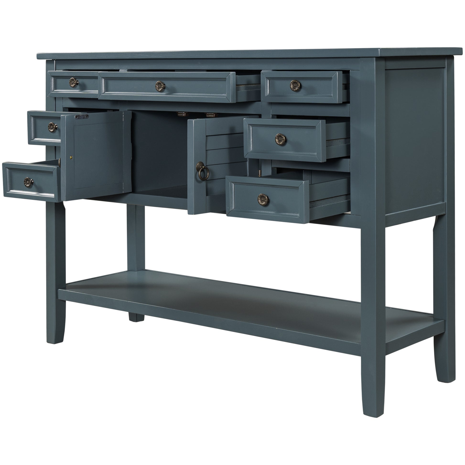 - Effortlessly fill in that blank space in your home with this console table, designed to fit all of your needs and more. Crafted with a classic vintage appearance, this table comes complete with two front facing cabinet doors that open to reveal a spacious interior, perfect for stowing away your larger necessities and keeping them out of sight. The 6 matching compact side drawers and 1 middle drawer minimize clutter, offering plenty of space to hold smaller items such as keys or mail while the spacious bottom shelf is the perfect place for storage baskets, shoes and more. Crafted with thick Pine and MDF wood slabs and accented with quality iron handles, this piece is manufactured for quality and exudes a high-end appeal that will leave your guests.
