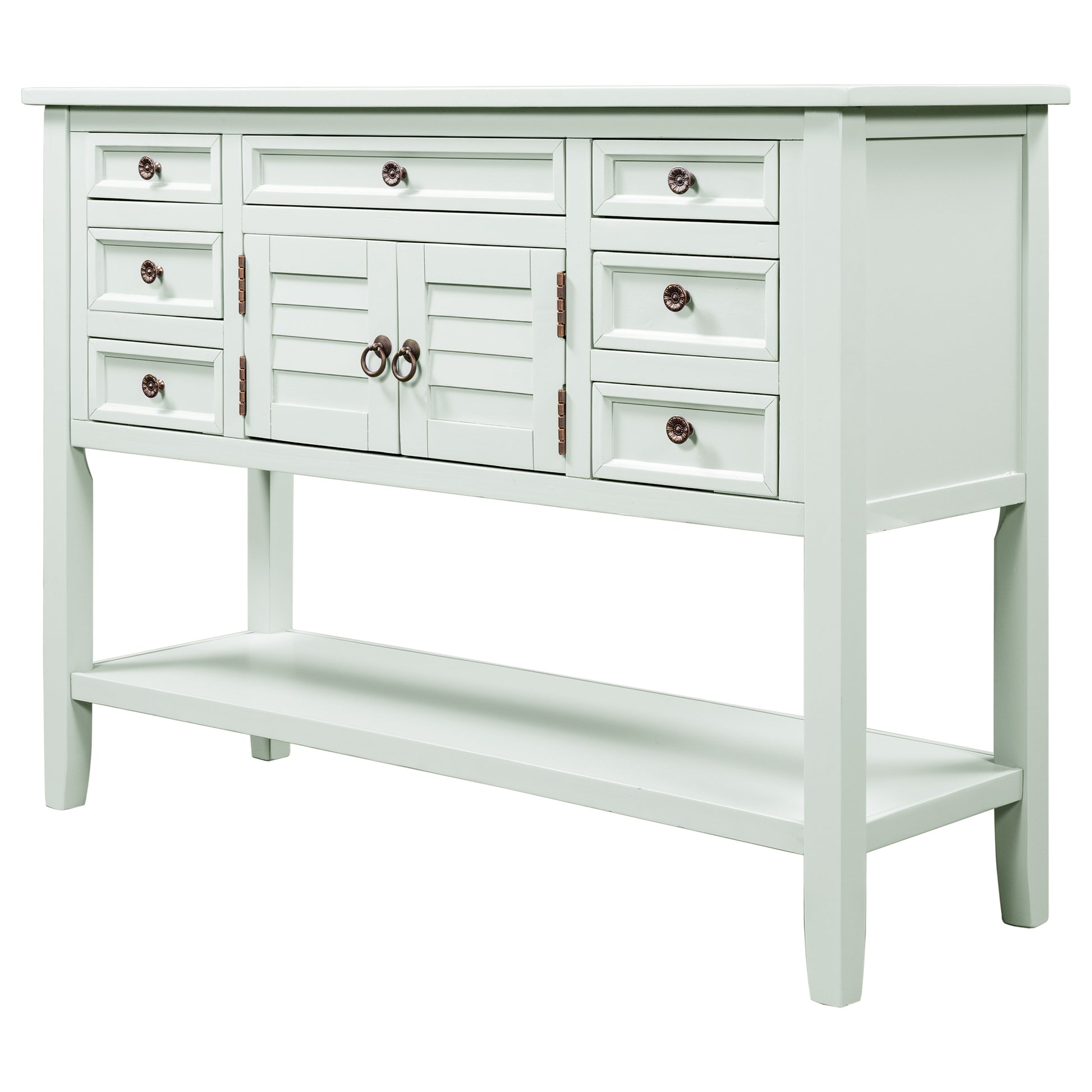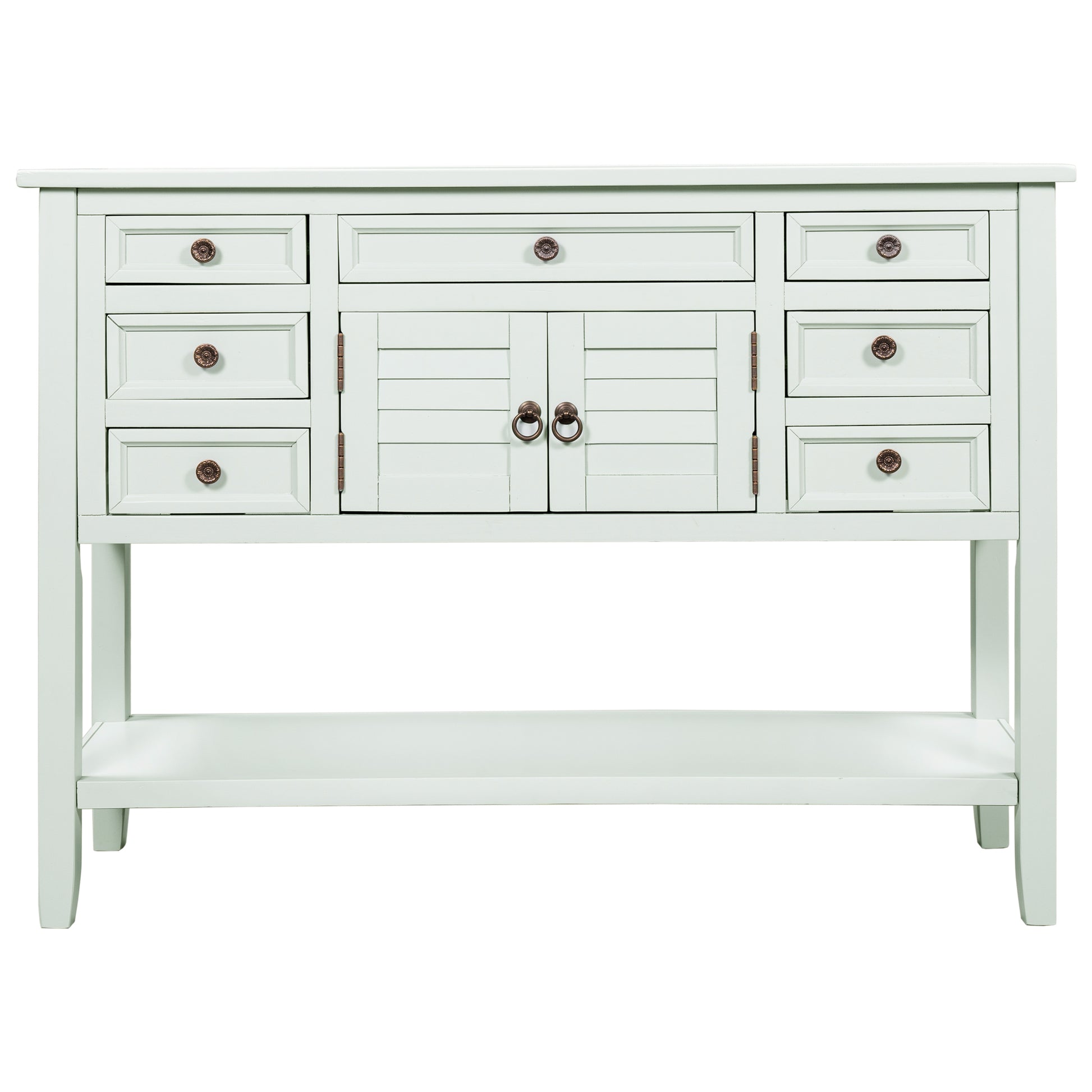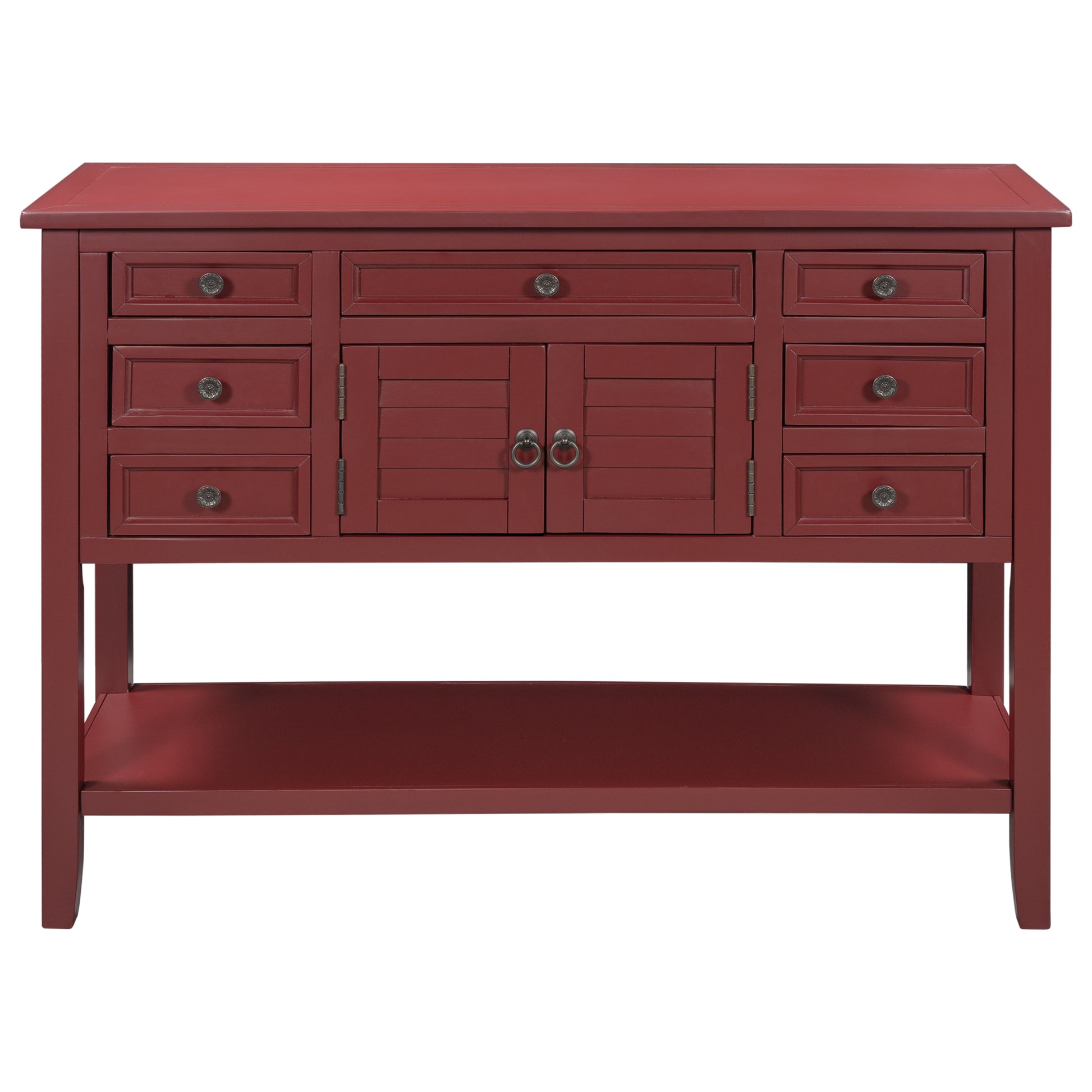 - Effortlessly fill in that blank space in your home with this console table, designed to fit all of your needs and more. Crafted with a classic vintage appearance, this table comes complete with two front facing cabinet doors that open to reveal a spacious interior, perfect for stowing away your larger necessities and keeping them out of sight. The 6 matching compact side drawers and 1 middle drawer minimize clutter, offering plenty of space to hold smaller items such as keys or mail while the spacious bottom shelf is the perfect place for storage baskets, shoes and more. Crafted with thick Pine and MDF wood slabs and accented with quality iron handles, this piece is manufactured for quality and exudes a high-end appeal that will leave your guests.