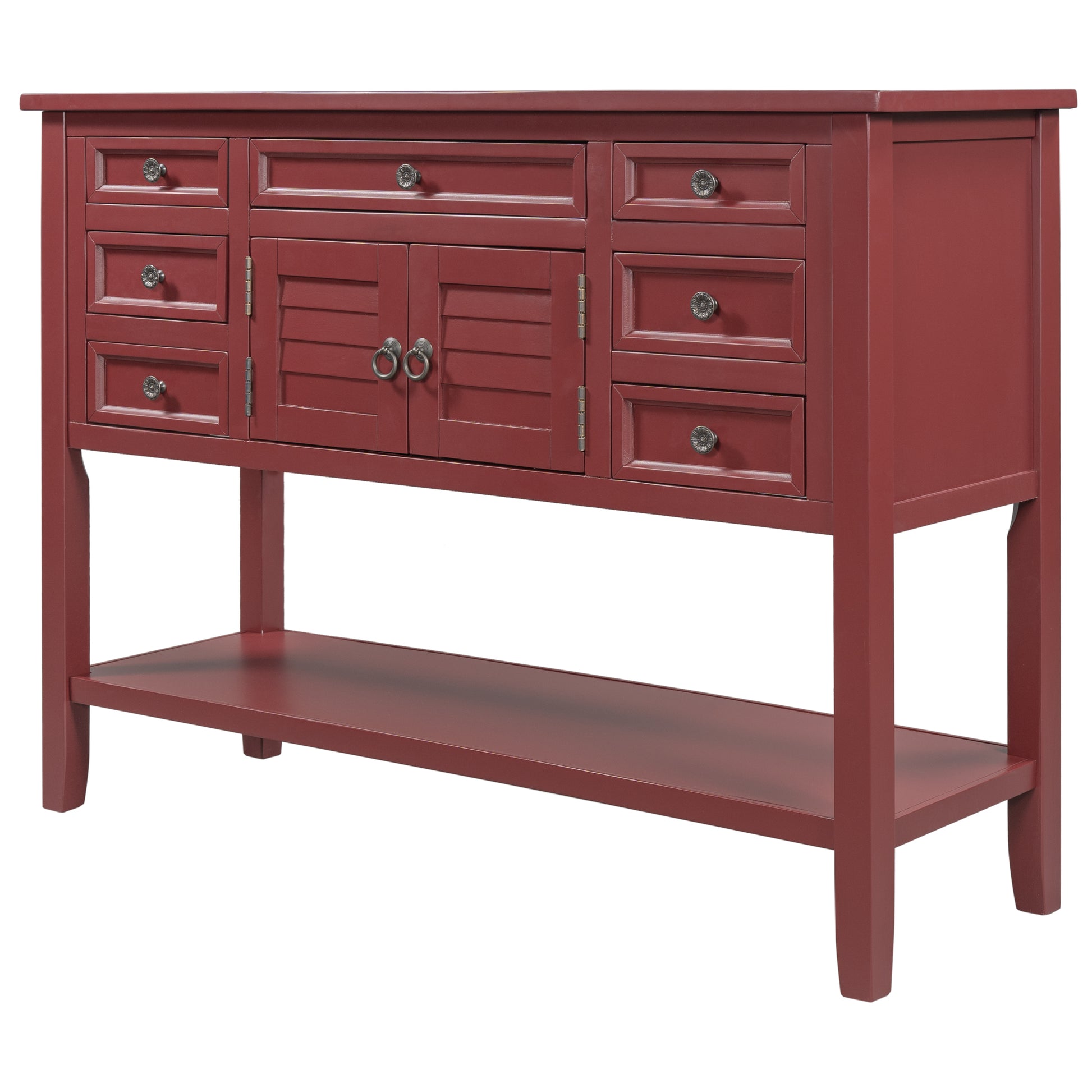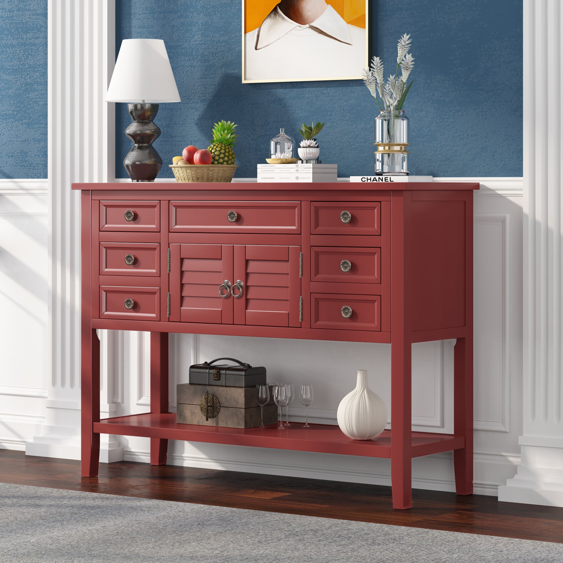 - High Storage Capacity:With built in shelving ranging from the front double doors to the 7 accent drawers, users will have plenty of space to store their belongings and avoid letting clutter accumulate on the console table.