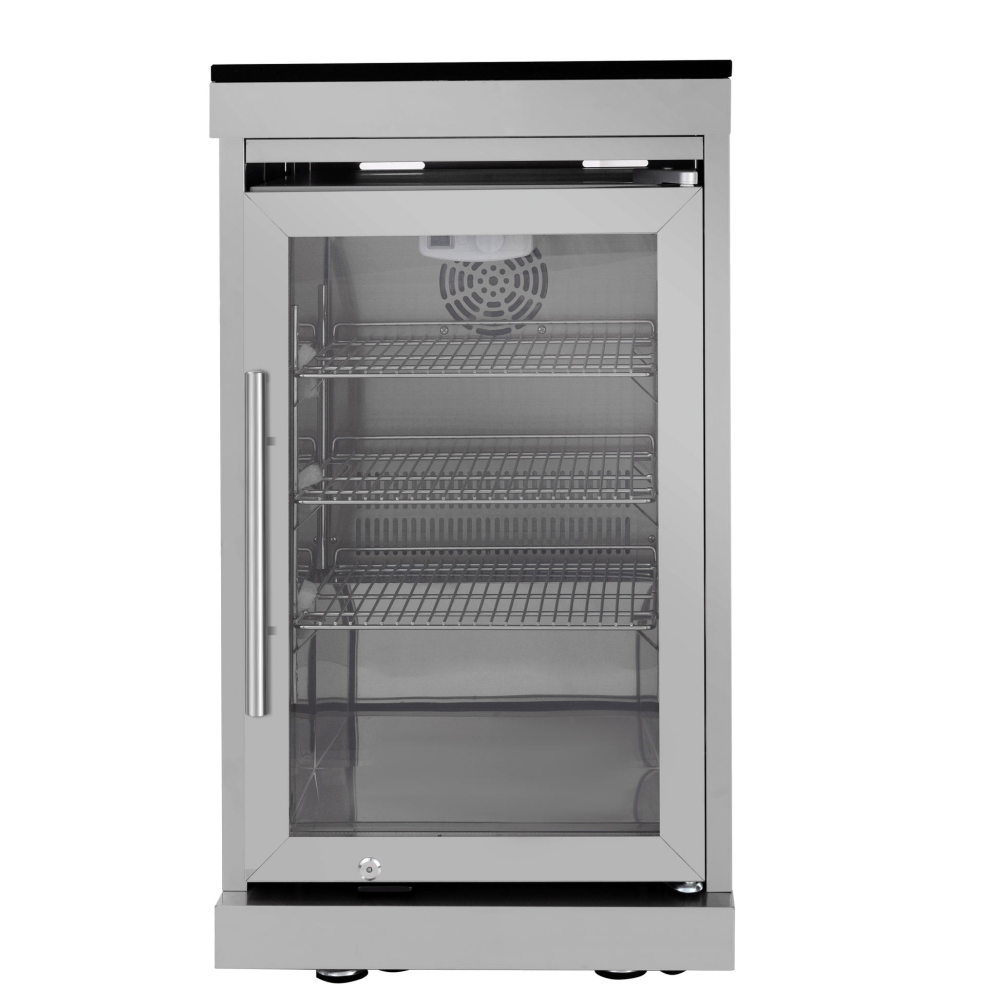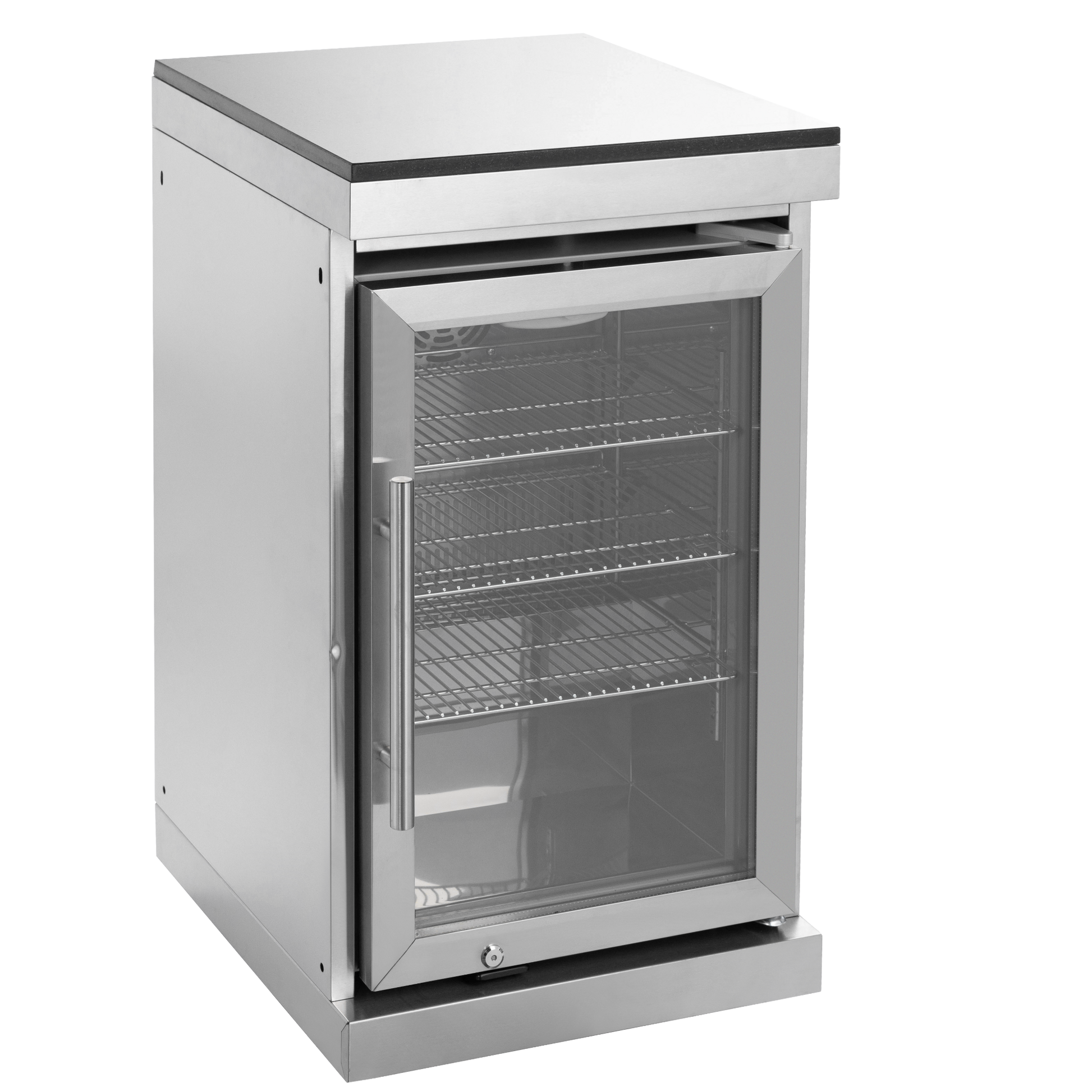 - REFRIGERATOR FEATURES - The outdoor rated ONRUN refrigerator is made with heavy duty 304 stainless steel construction for durability and resistance to the elements. It comes with a stylish glass door for easy viewing of contents and interior blue lighting as well to improve visibility and overall user experience. Additional features include temperature control, adjustable shelves, and a lockable door to secure contents and prevent unauthorized access. Dimensions - 18 1/2” x 18” x 26 1/2”