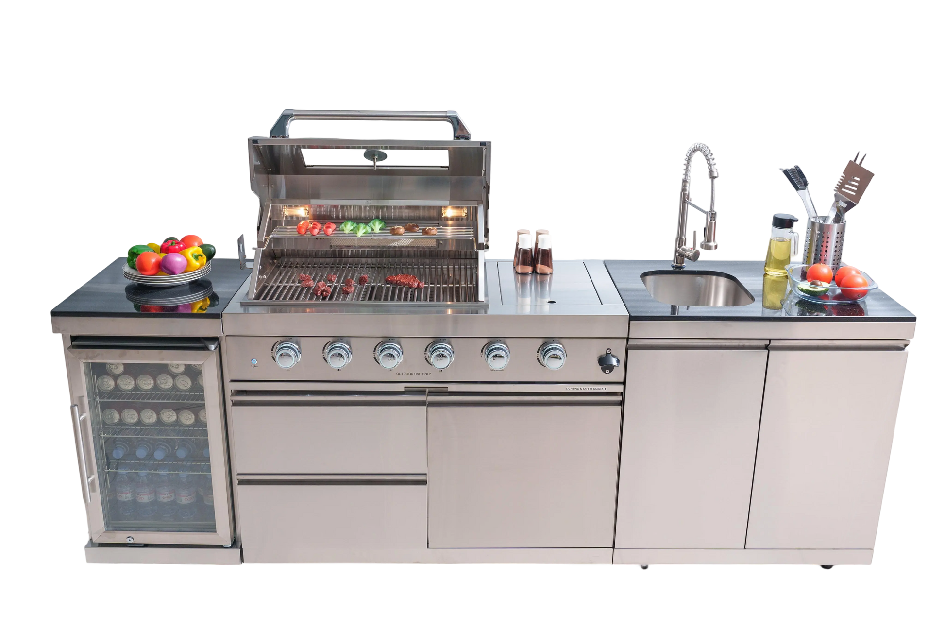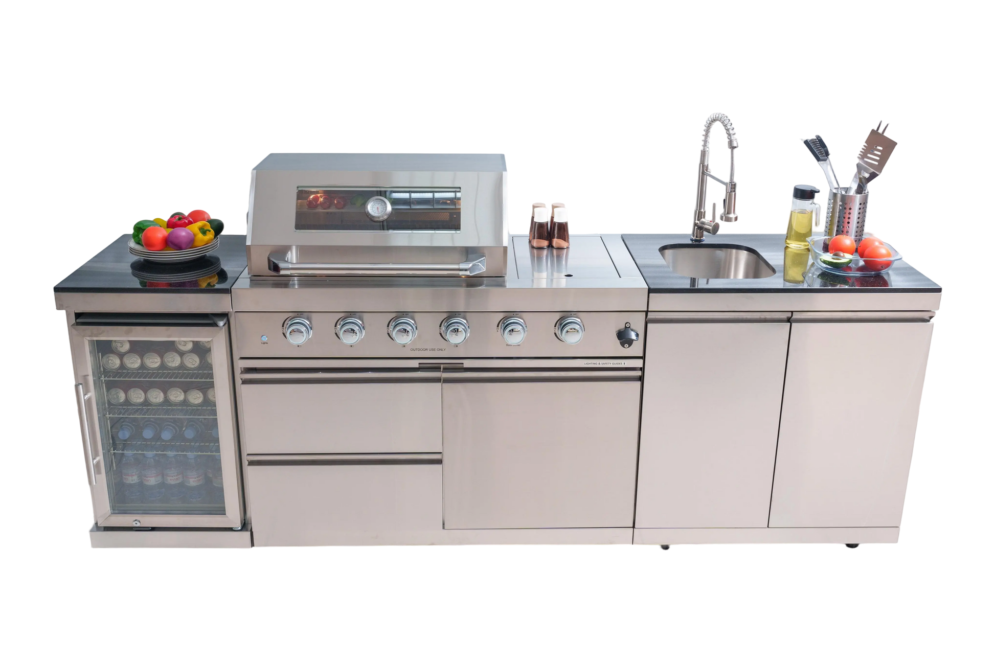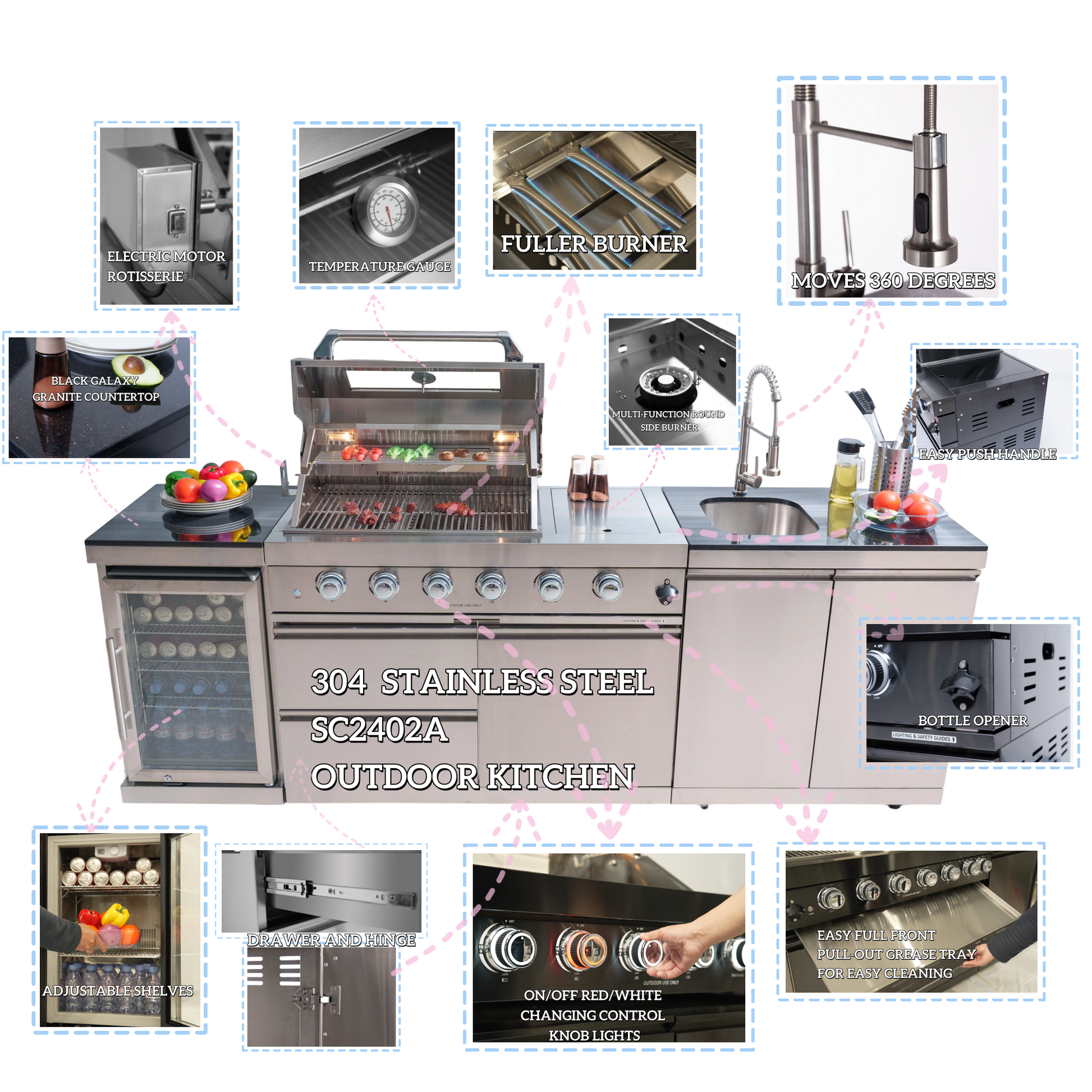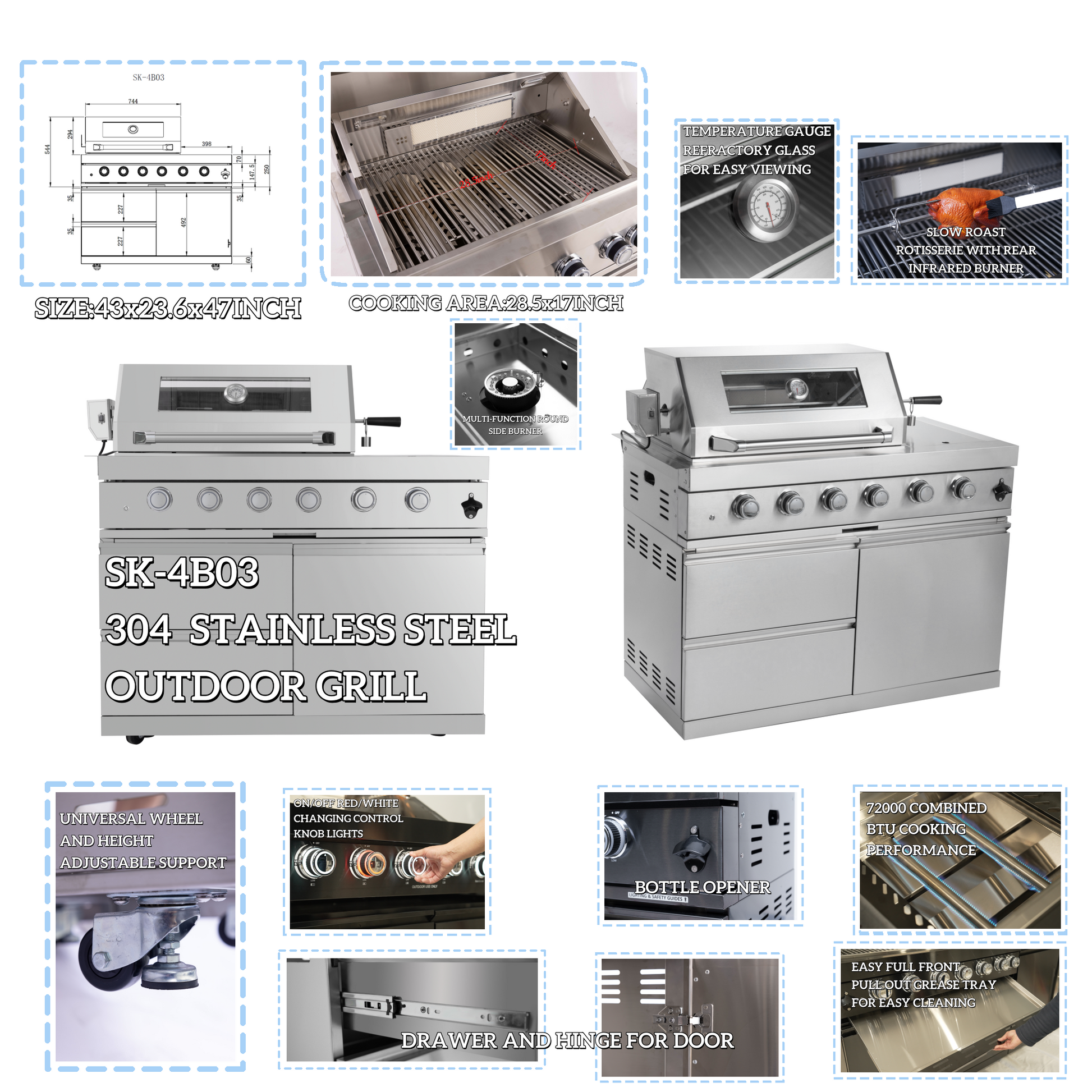 - ADDITIONAL FEATURES - A double lined grill hood with temperature gauge is standard for maximum heat retention. The grill has two cooking surface halogen lights, On/off red/white changing control knob lights, a bottle opener, electronic ignition, easy access full front pull-out grease tray for easy cleaning, black granite countertops, plus storage drawers and cabinets. Your outdoor kitchen will also come with gliding castor wheels for smooth and easy-to-maneuver movement and increased stability.