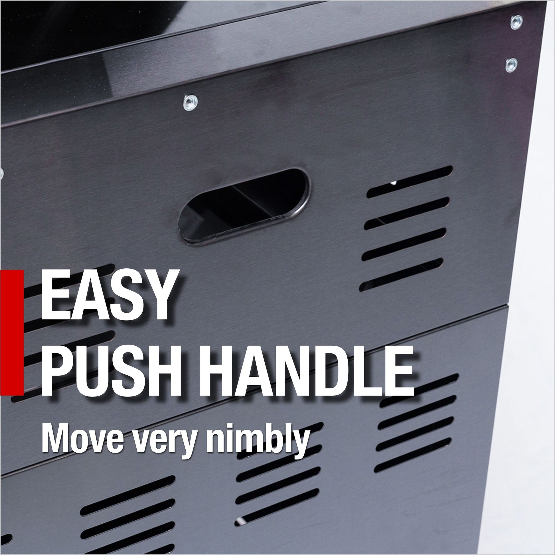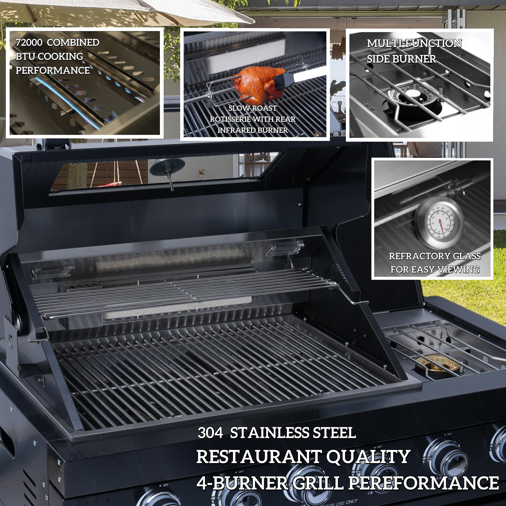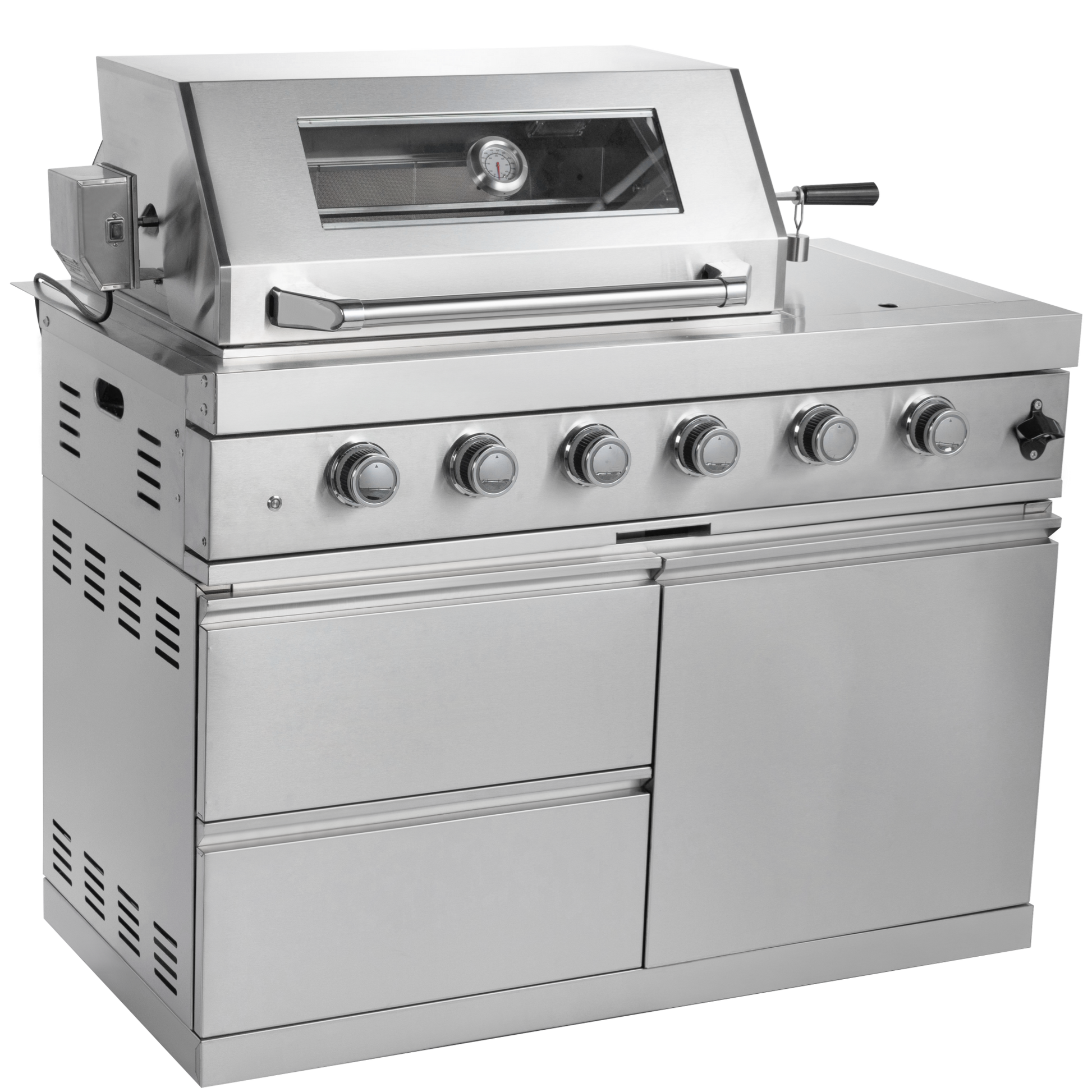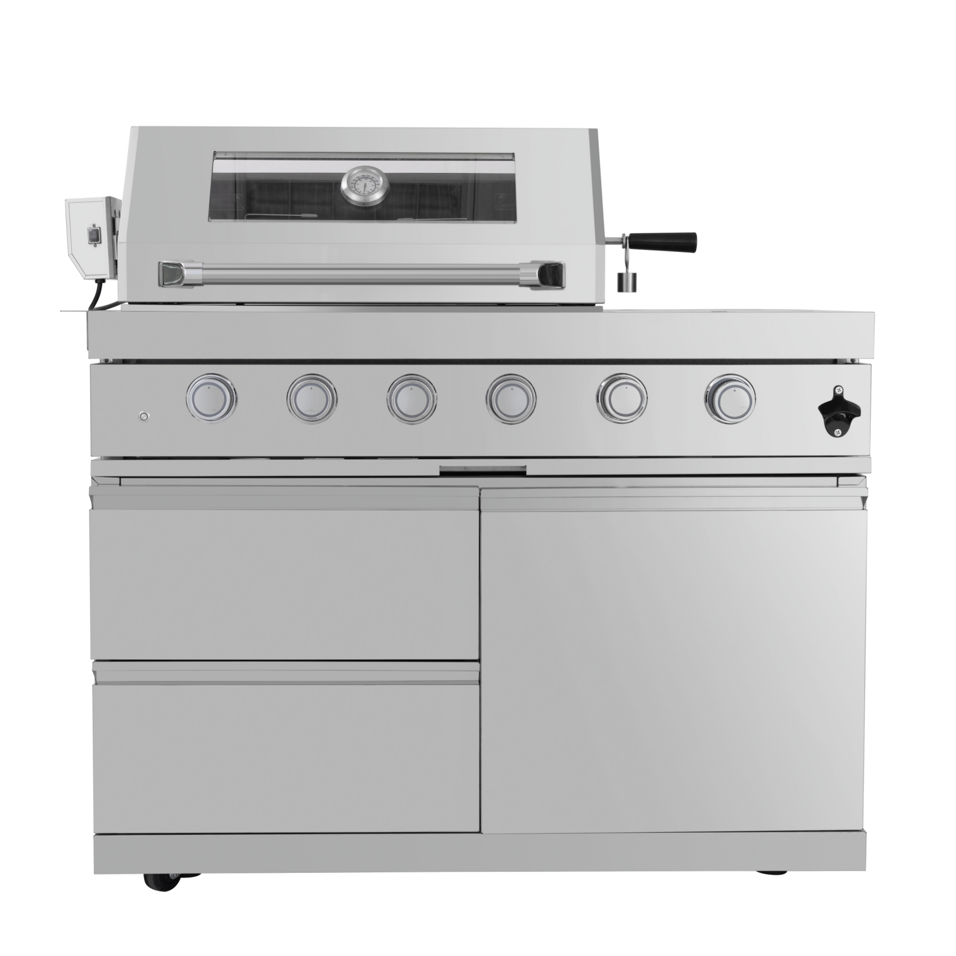 - ADDITIONAL FEATURES - A double lined grill hood with temperature gauge is standard for maximum heat retention. The grill has two cooking surface halogen lights, On/off red/white changing control knob lights, a bottle opener, electronic ignition, easy access full front pull-out grease tray for easy cleaning, black granite countertops, plus storage drawers and cabinets. Your outdoor kitchen will also come with gliding castor wheels for smooth and easy-to-maneuver movement and increased stability.