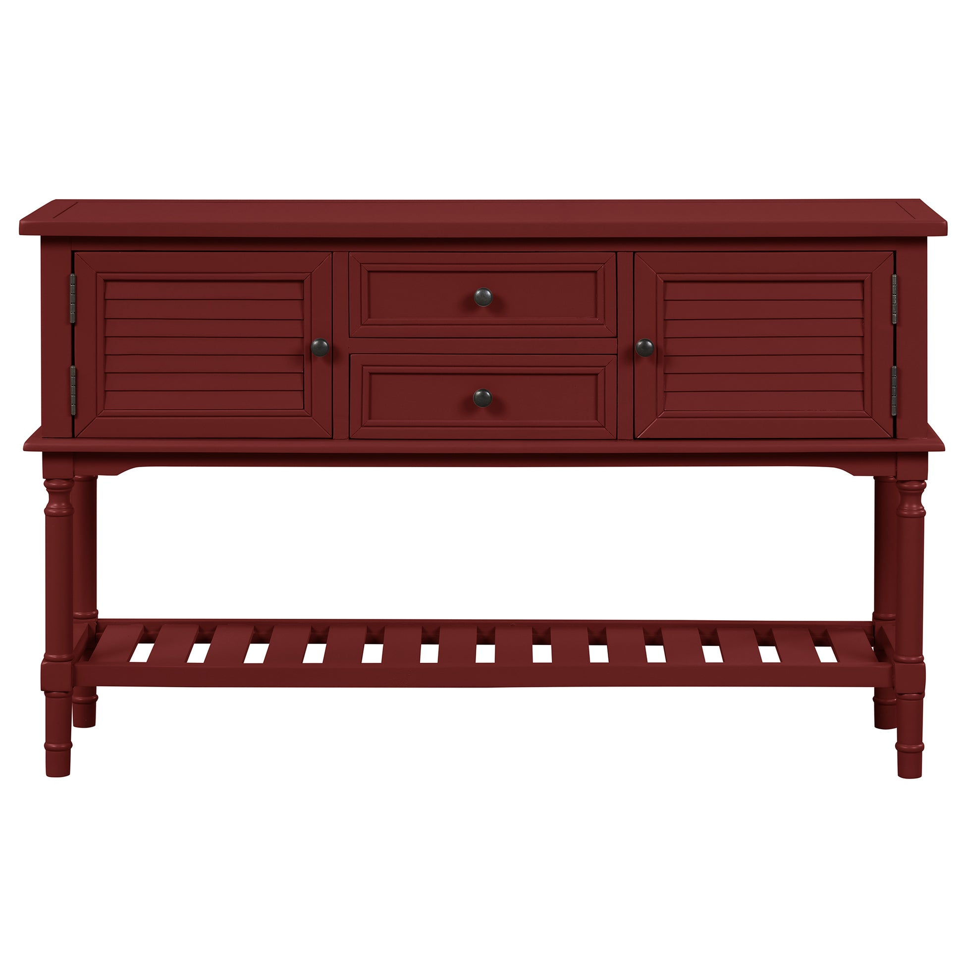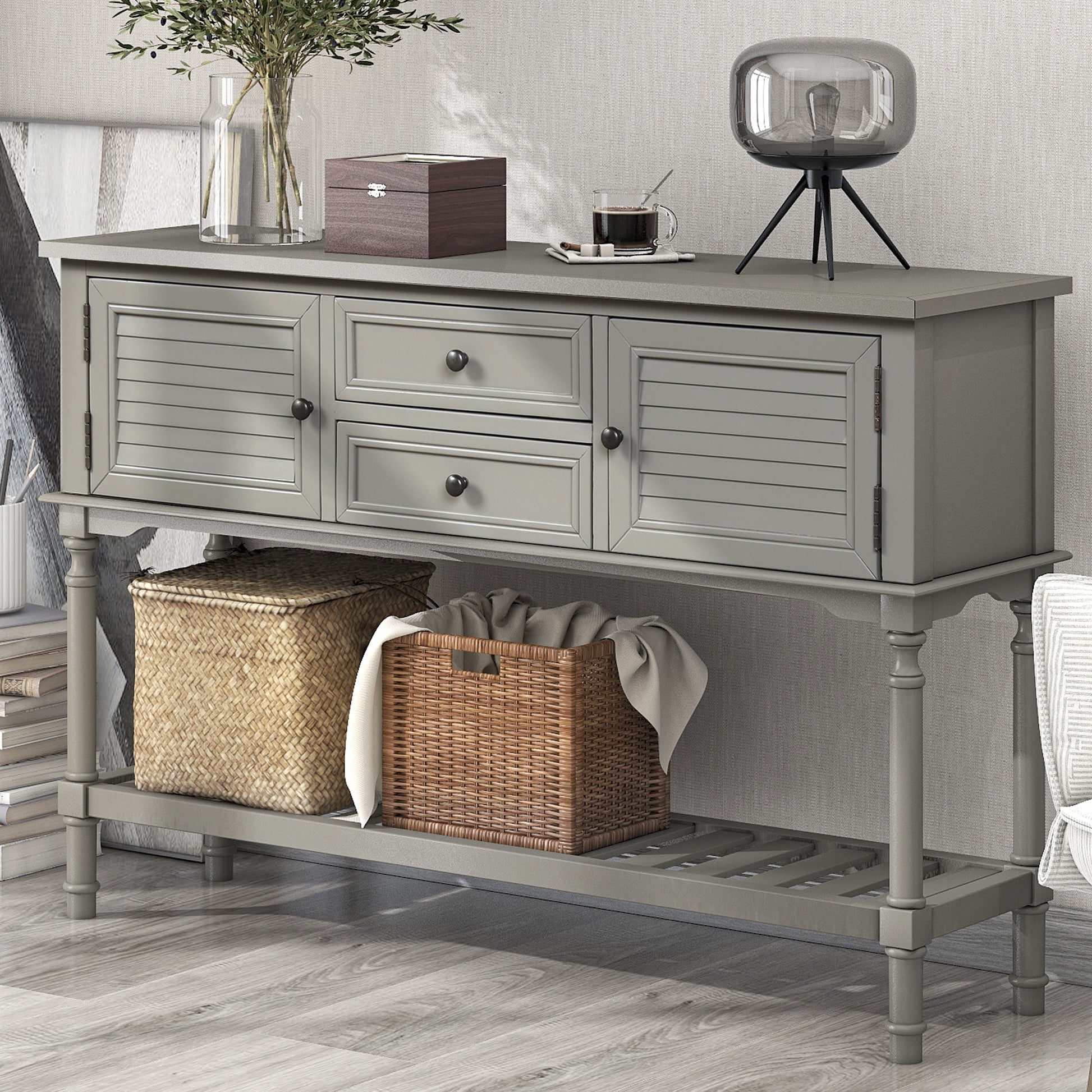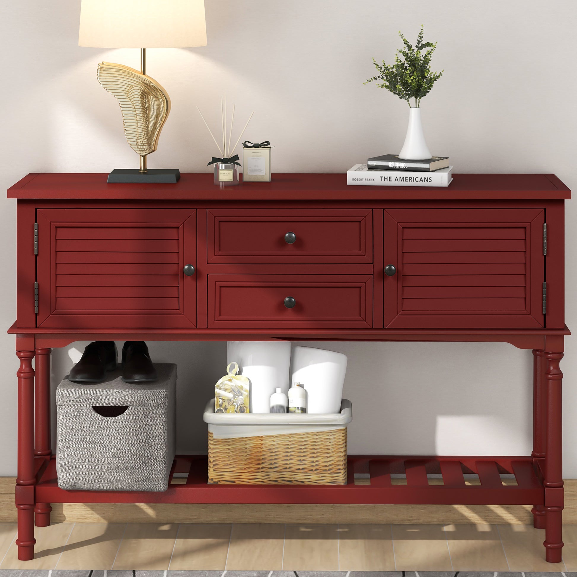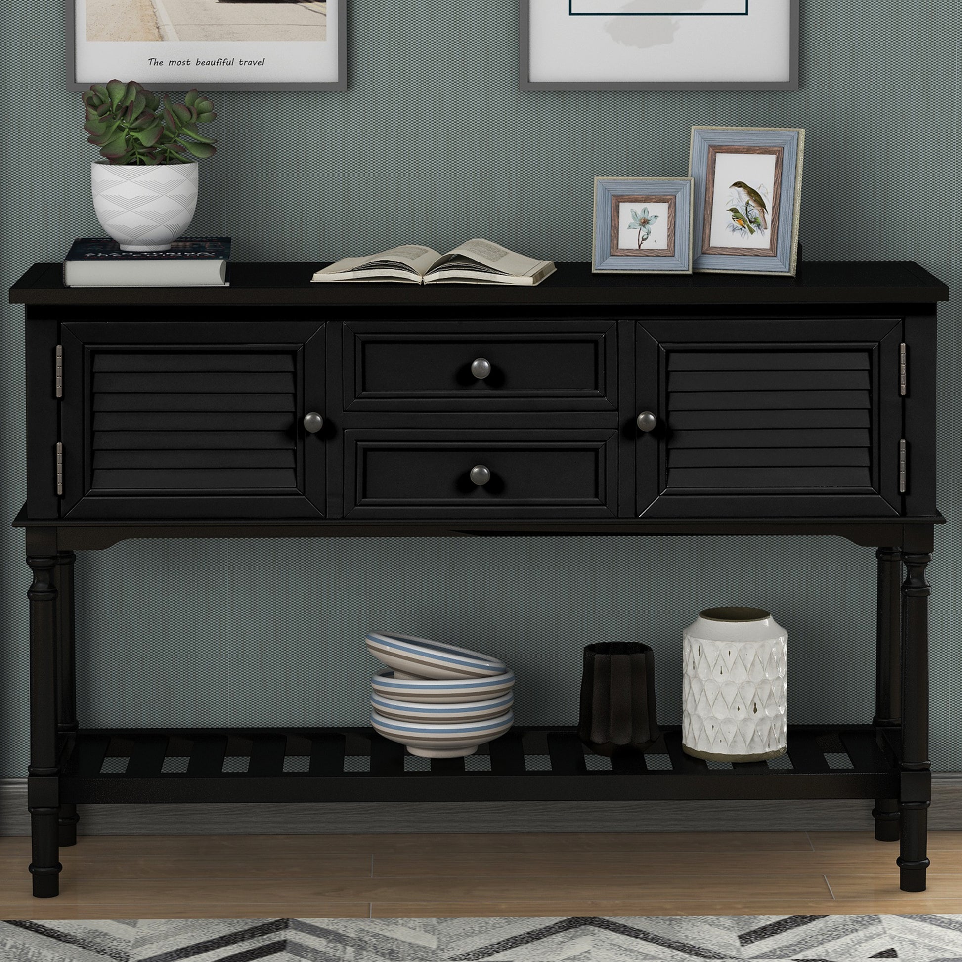 - If you want to bring the retro atmosphere to your living area, this classic simple style console table is the best choice! The multifunctional design is to meet your variety of needs. Crafted with solid pine wood and high-quality MDF, it comes complete with two drawers and two cabinets that open to hold your daily necessities and keep them away from your eyes. And the spacious shelf is the wonderful place for storage baskets, sundries, books, and daily necessities. There are vintage carved round Antimon handles for the drawers and cabinets. This table is suitable for living room, bed room, stairs area, and next to sofa. Your guests will talk about it actively.