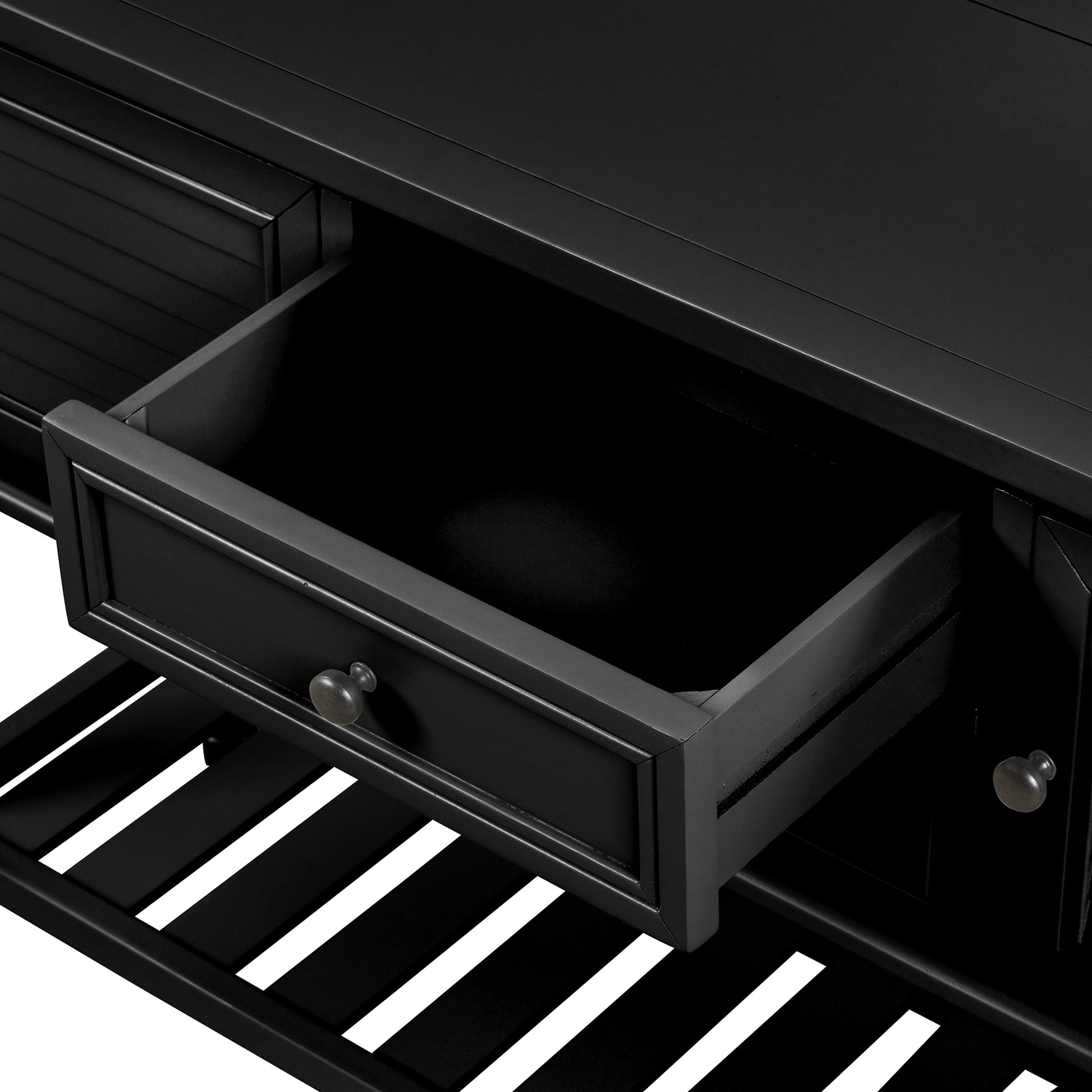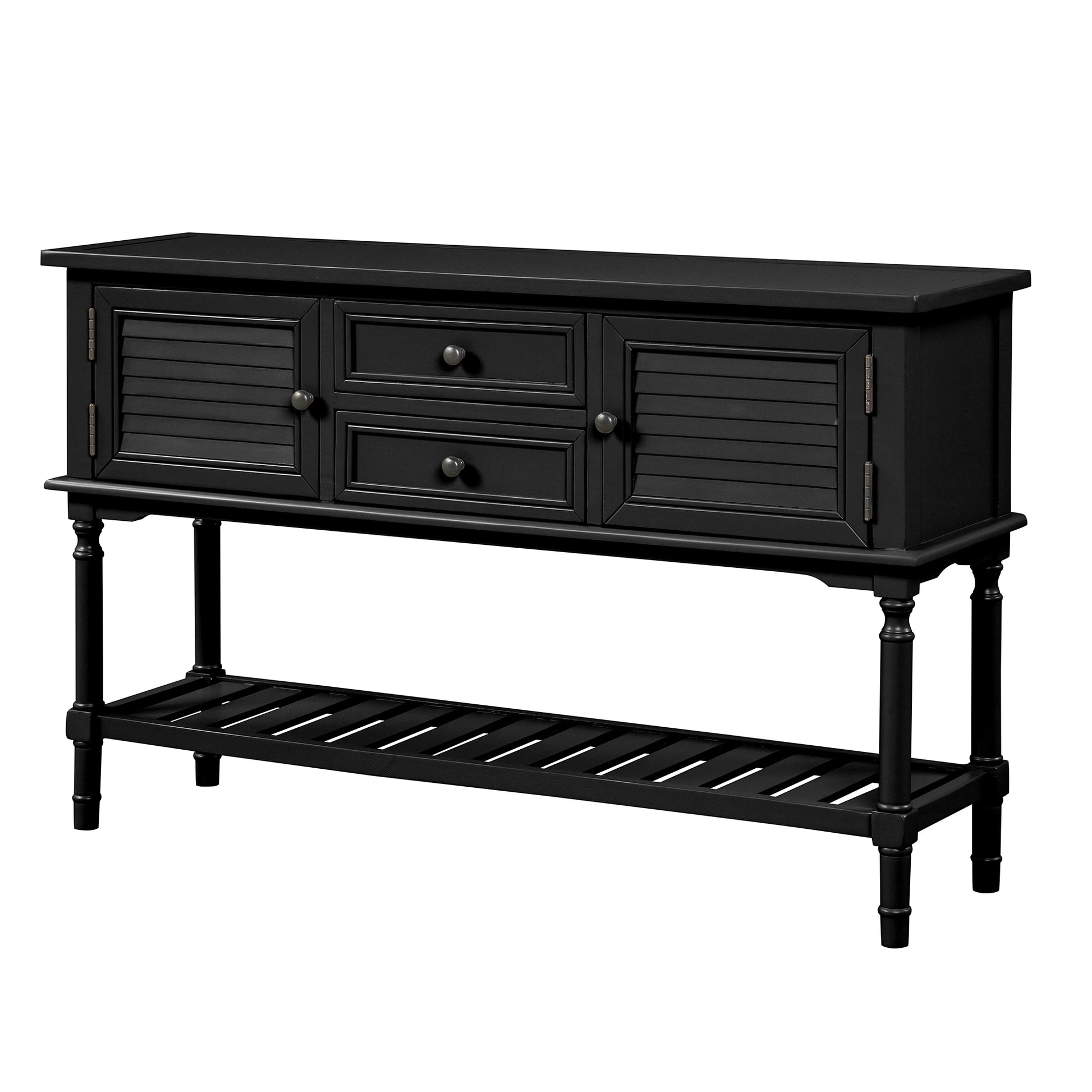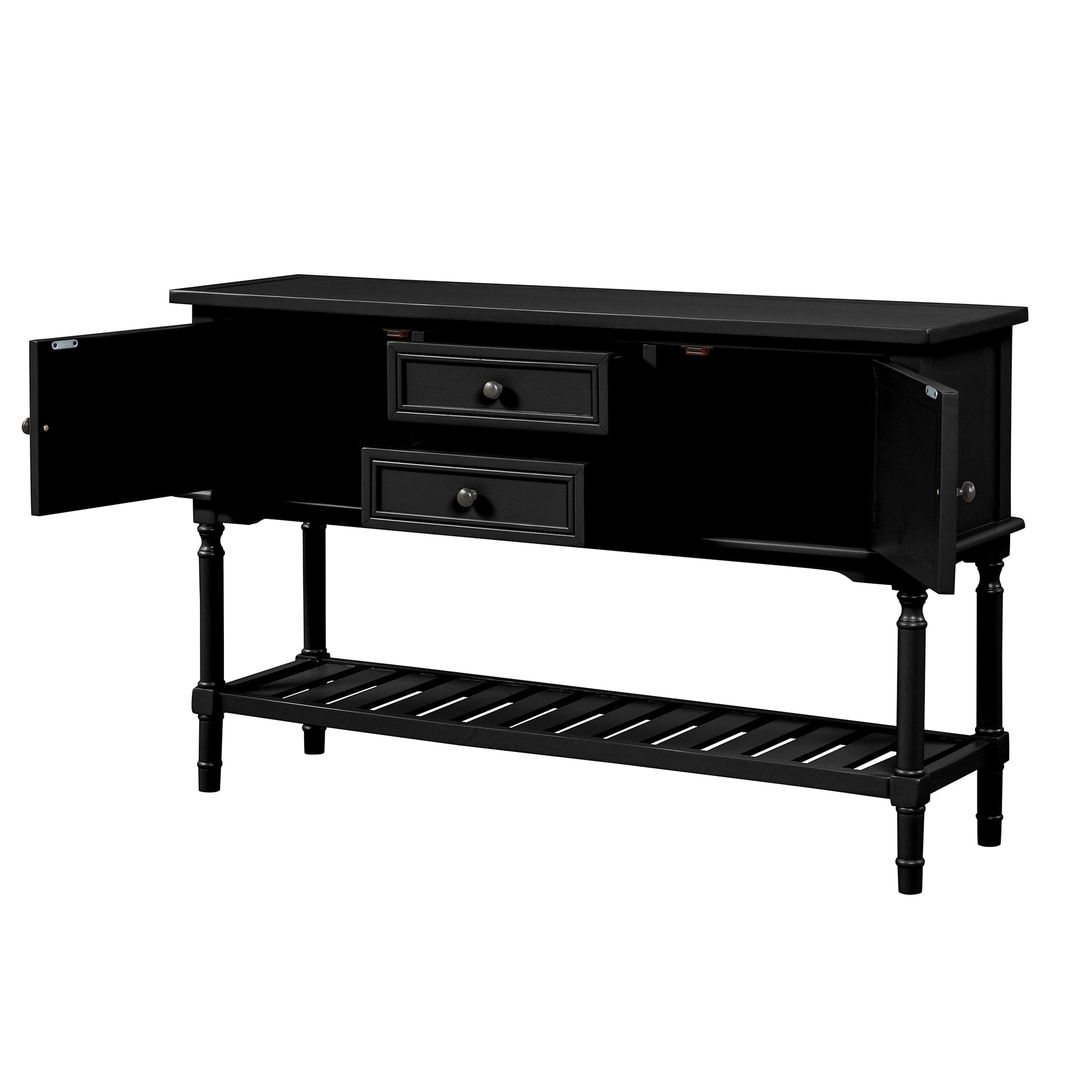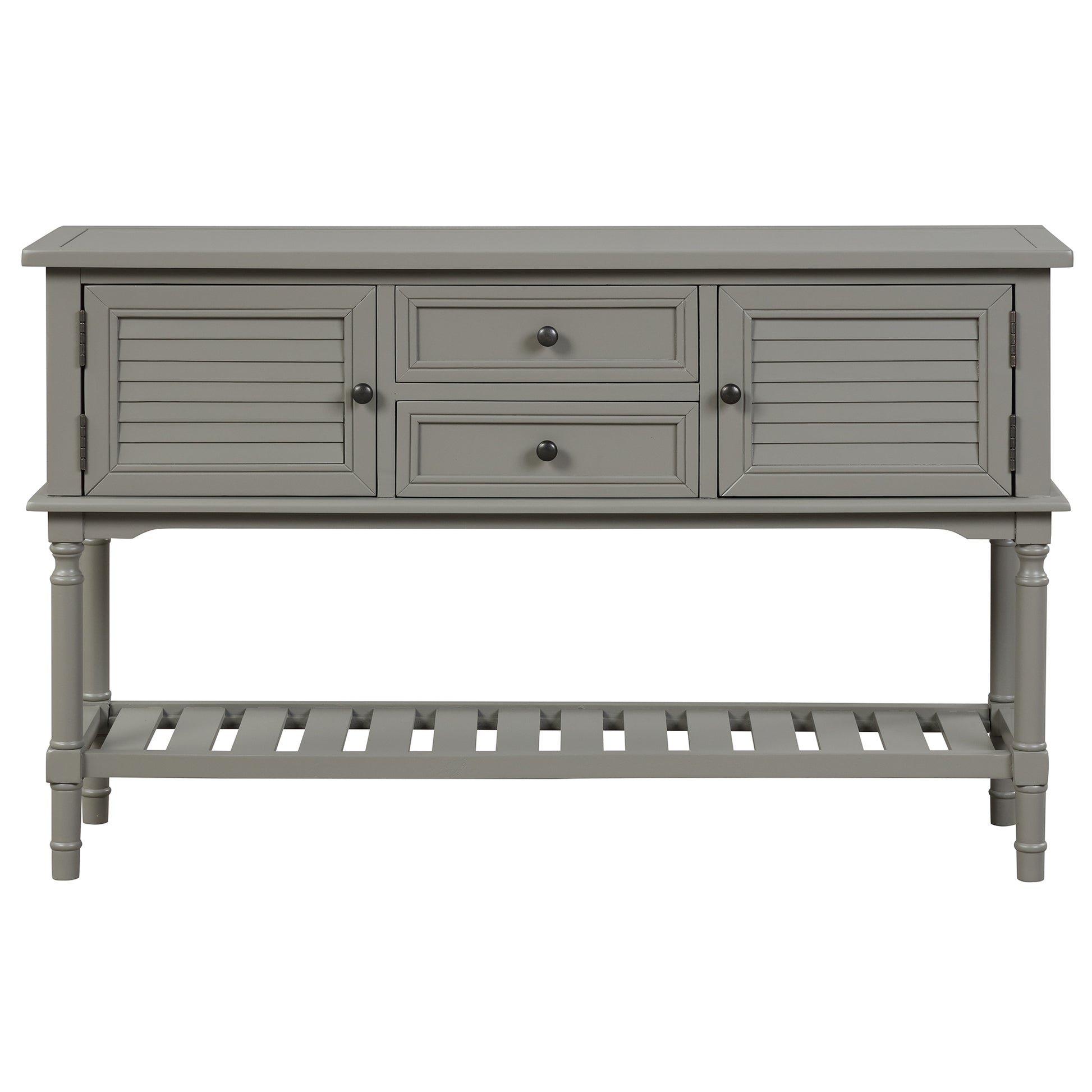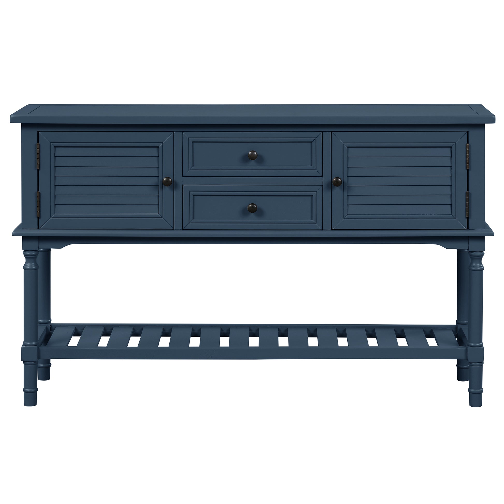 - If you want to bring the retro atmosphere to your living area, this classic simple style console table is the best choice! The multifunctional design is to meet your variety of needs. Crafted with solid pine wood and high-quality MDF, it comes complete with two drawers and two cabinets that open to hold your daily necessities and keep them away from your eyes. And the spacious shelf is the wonderful place for storage baskets, sundries, books, and daily necessities. There are vintage carved round Antimon handles for the drawers and cabinets. This table is suitable for living room, bed room, stairs area, and next to sofa. Your guests will talk about it actively.
