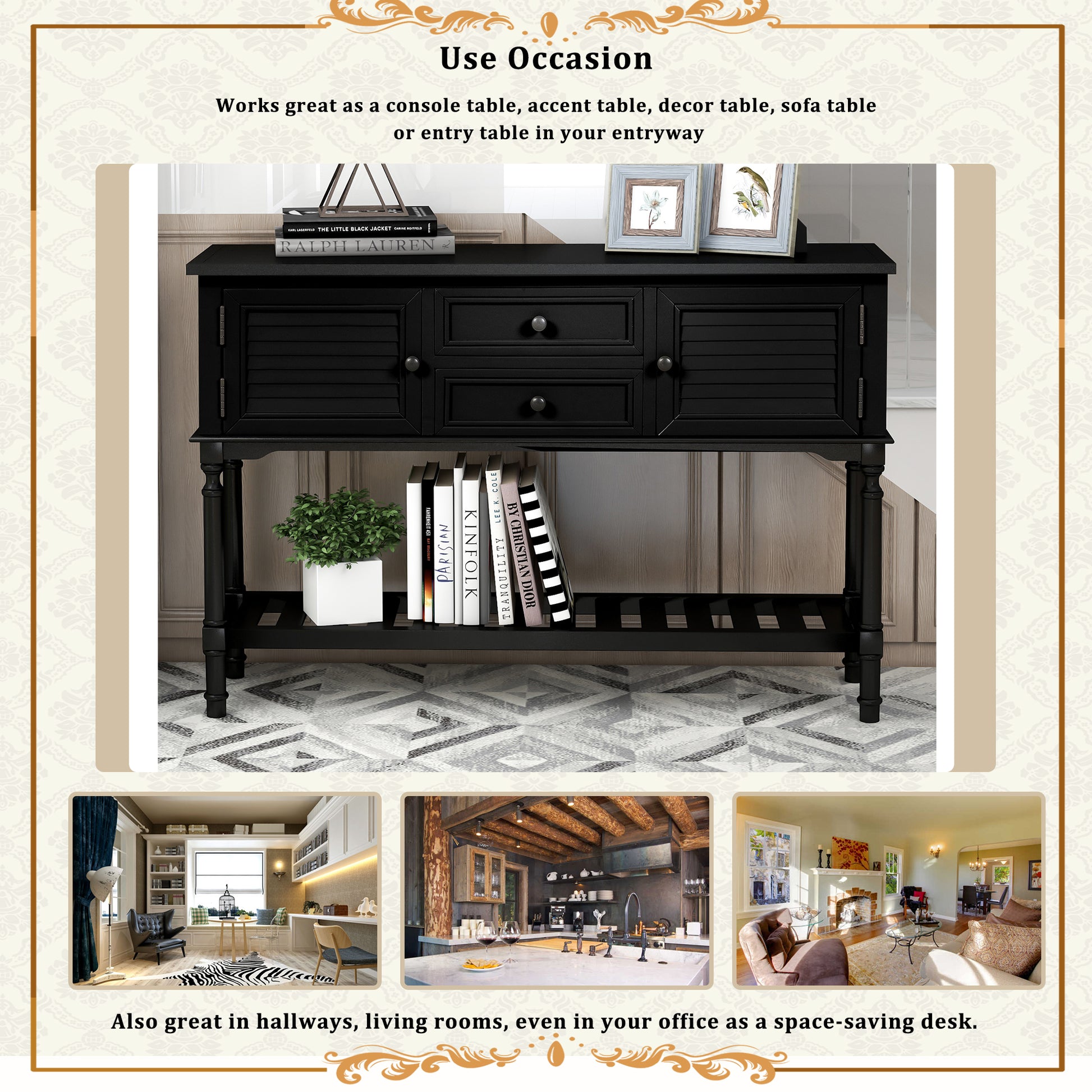 - Our console table that is retro design, simple and classic, it brings vintage atmosphere to your living area. All surfaces of the console table are painted in the same color, and the top is polished, the drawers and cabinets got vintage style handles. You can use it as a commodity shelf to support compact umbrellas, pet stuff, or daily essentials. You can also use it as a sofa table or a graceful book case to store books or magazines in hallway, entryway, bedroom, living room.