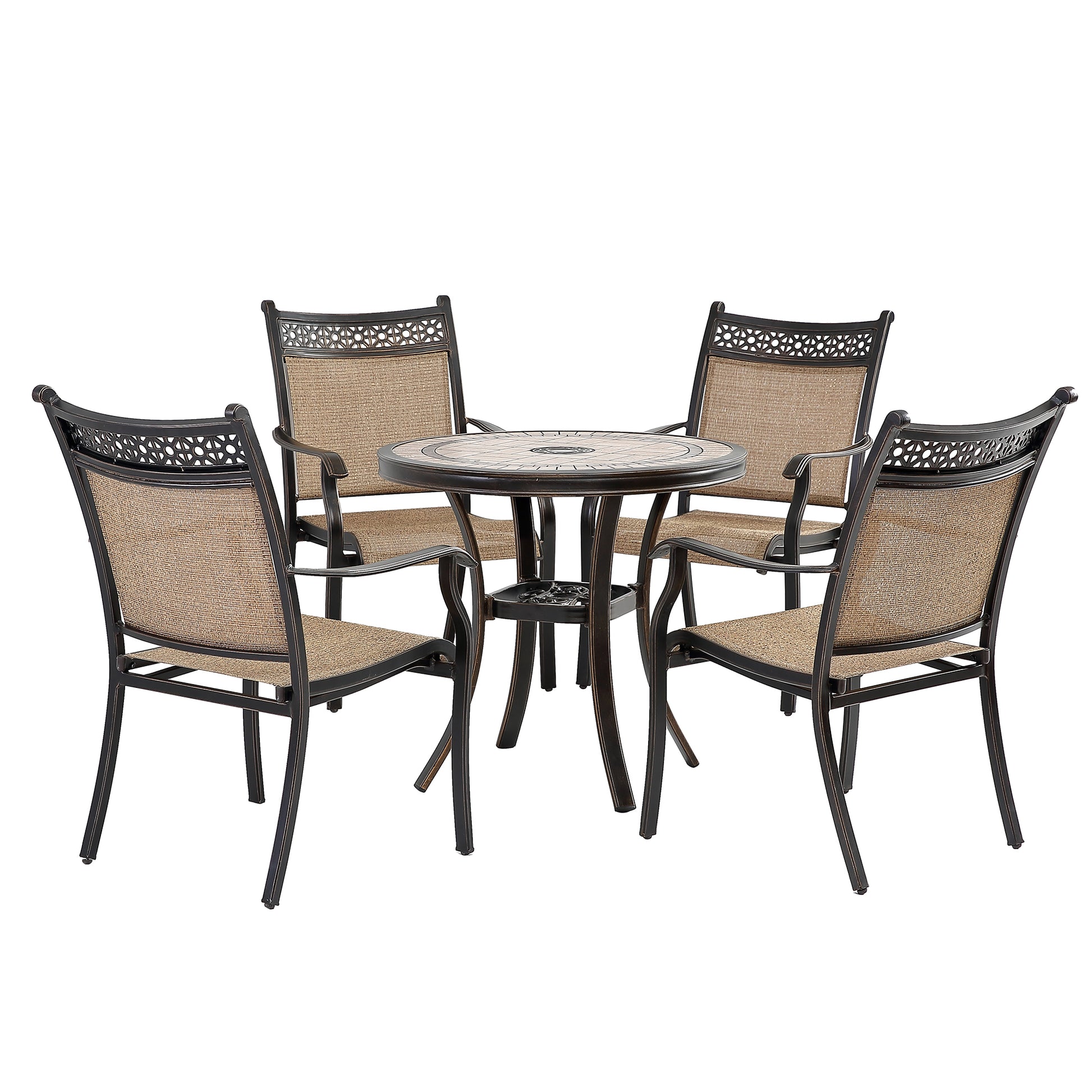 5-piece Cast Aluminum Dining Sling Set with 31-In Round Tile-Top Table and Classic Pattern Sling Chairs Light Brown