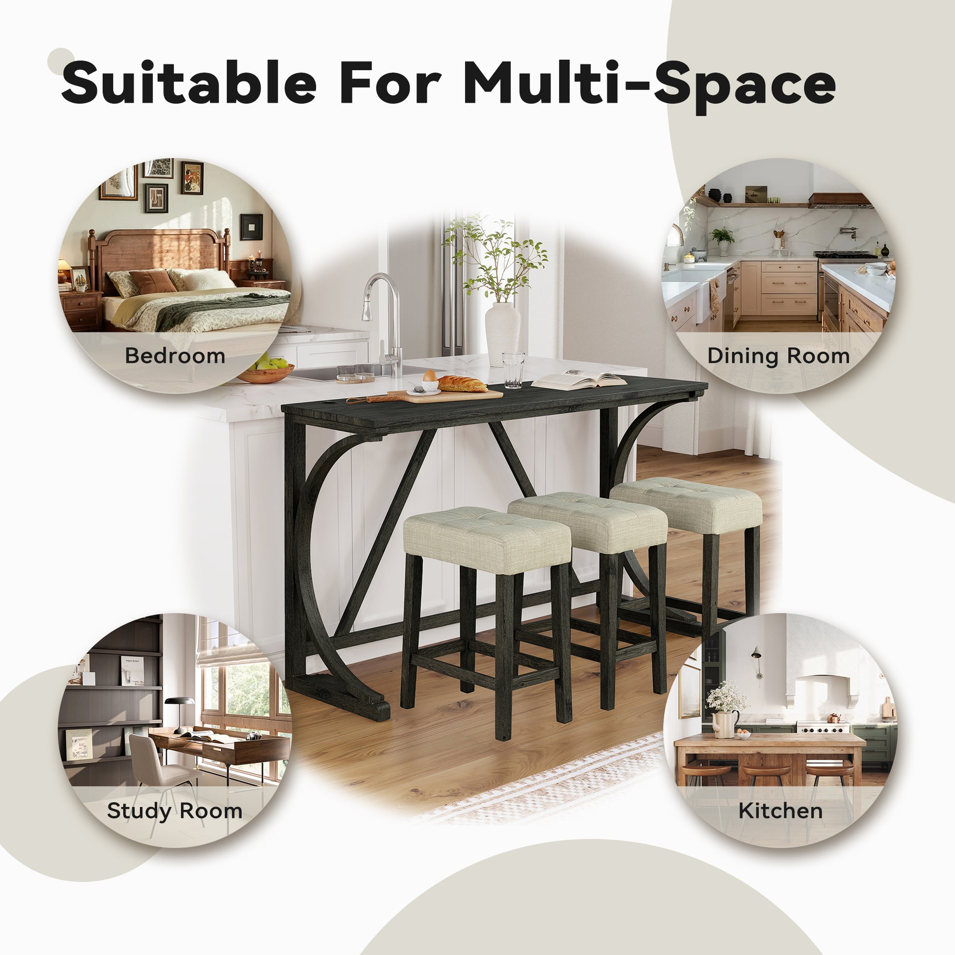 Black 4-Piece 36 in. H Bar Table Set with 3-Stools and USB Charging Portsand USB Charging Ports