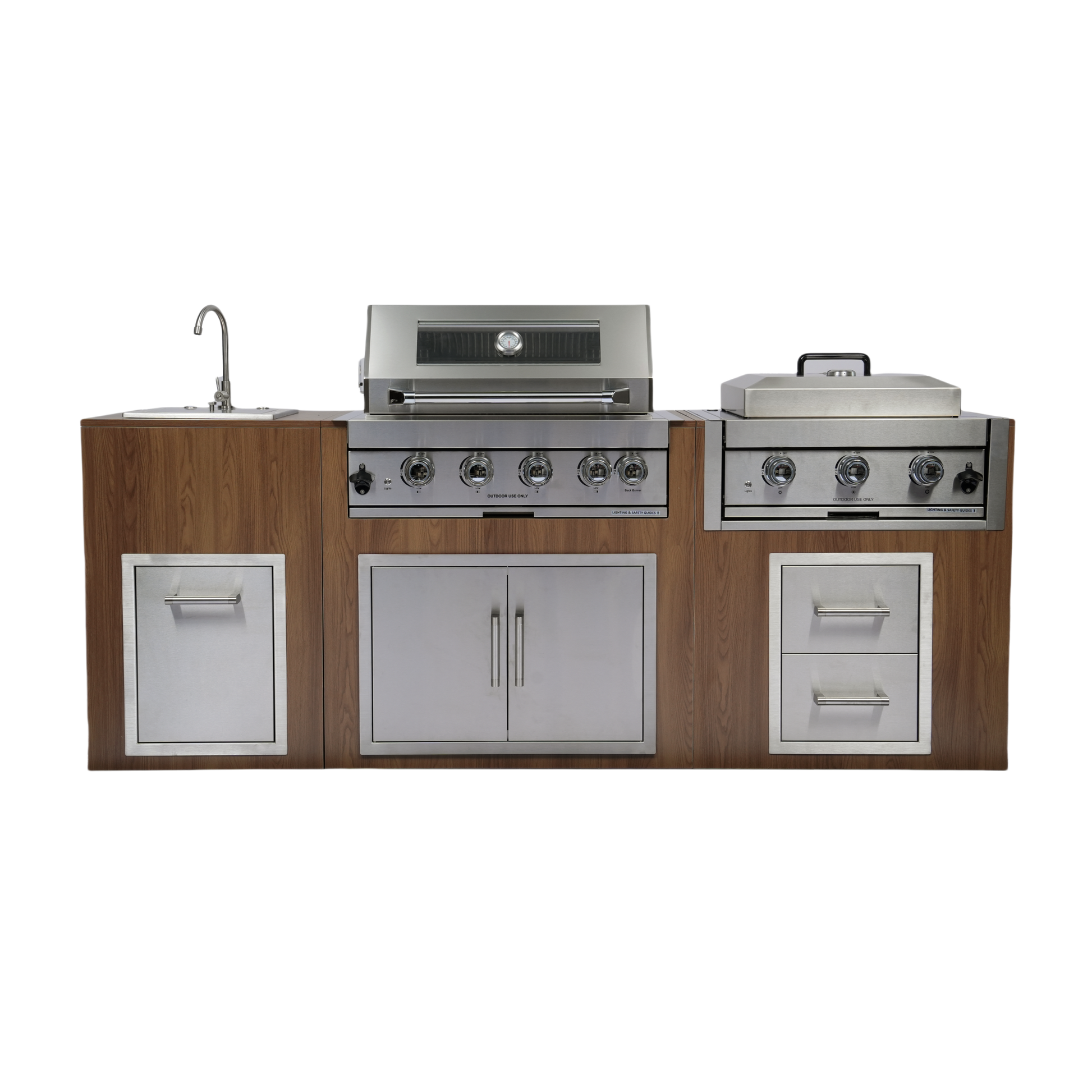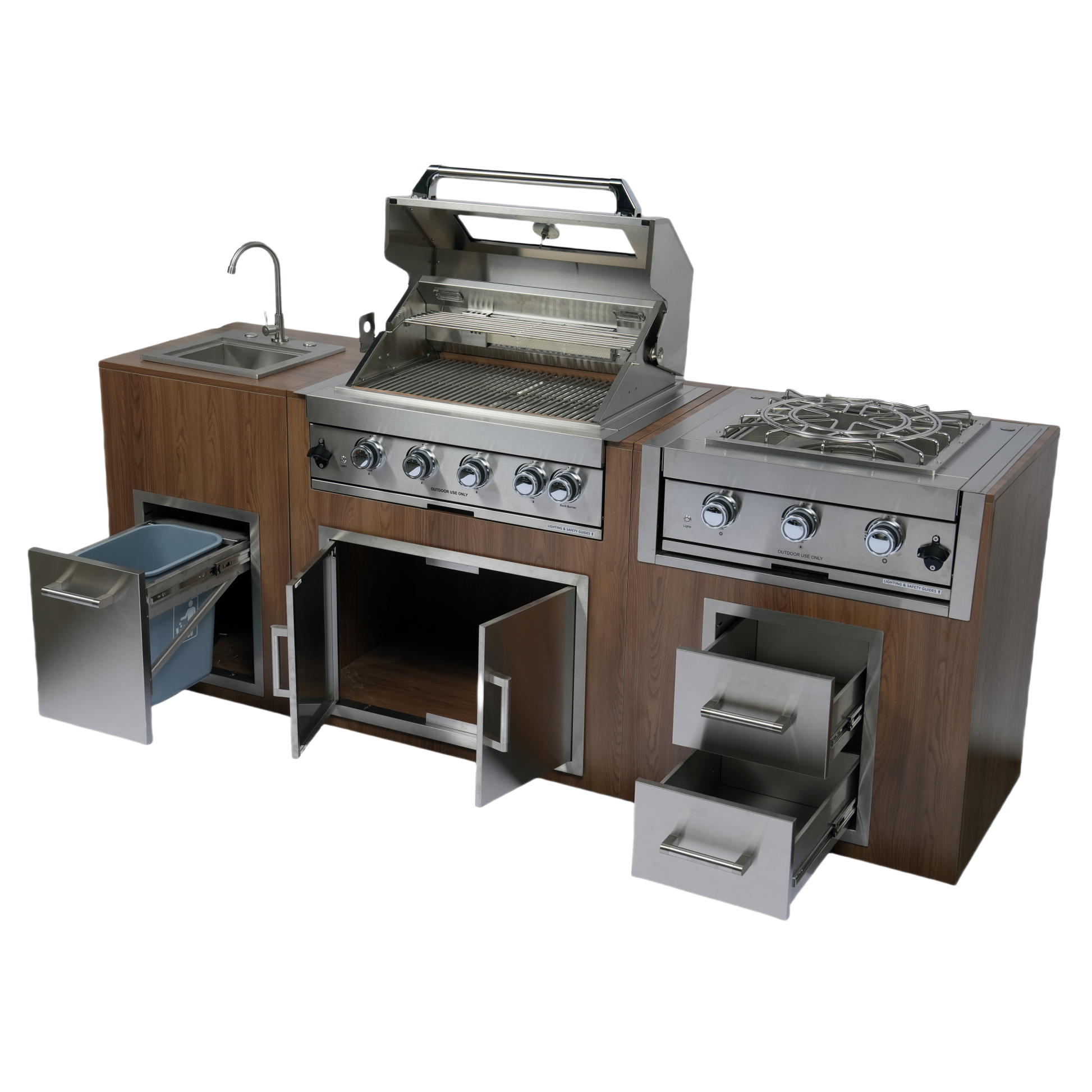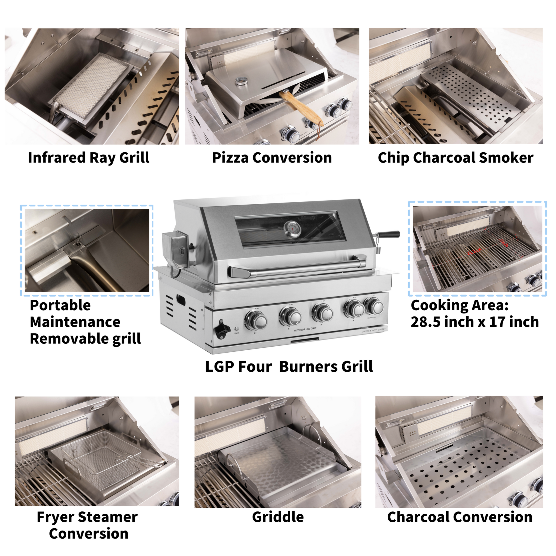 - Built in BBQ LPG 32'' feature 4 cast stainless steel burner with infrared rear bunrer (total 60000 BTU) with 8mm stainless steel cooking grids , heavy duty electric motor rotisserie kit ,two cooking surface halogen lights, a bottle opener , easy access full front pull-out grease tray for easy cleaning .