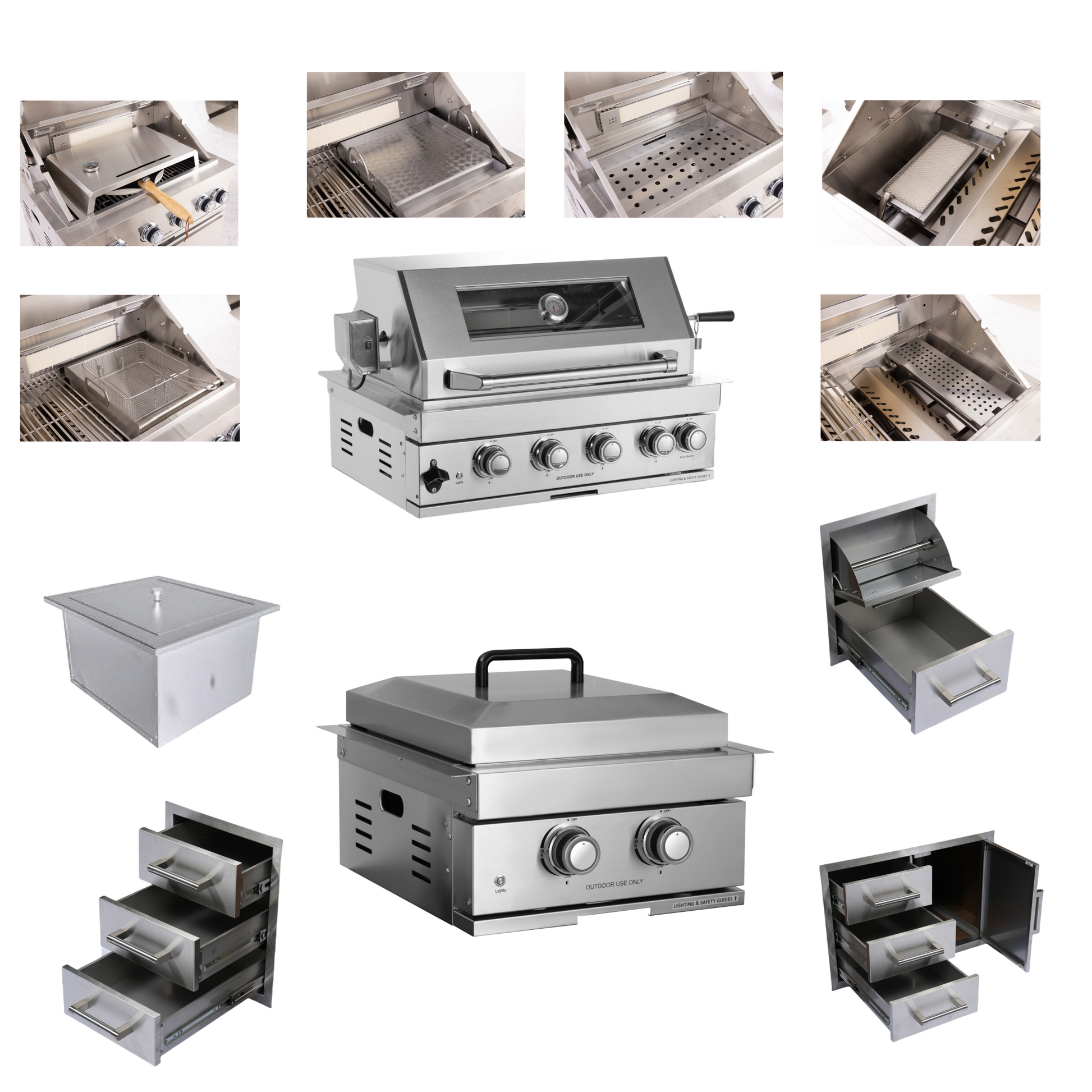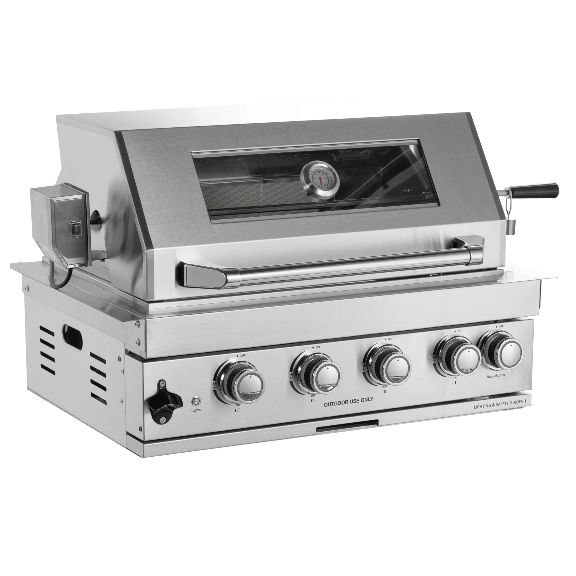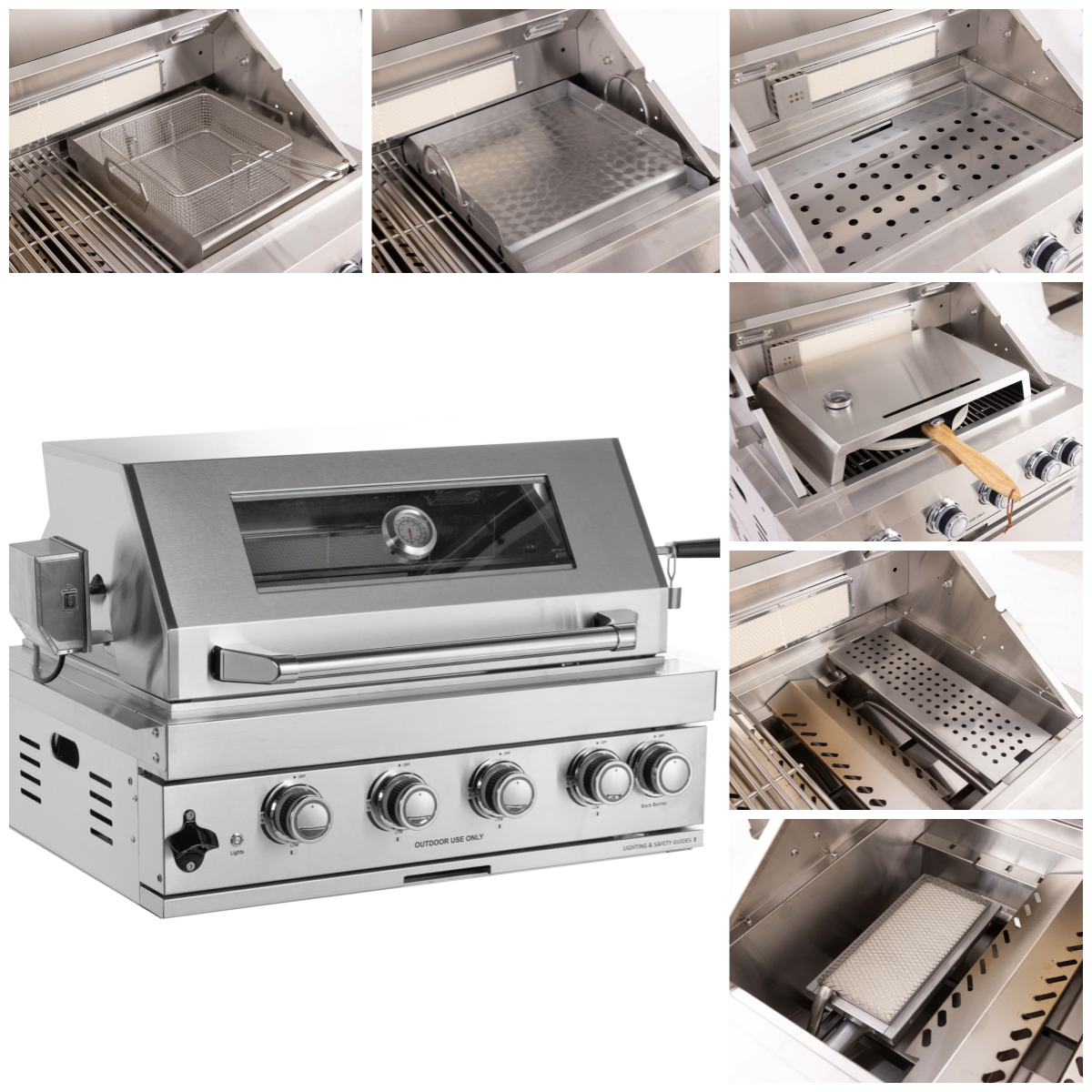 - Built in BBQ LPG 32'' feature 4 cast stainless steel burner with infrared rear bunrer (total 60000 BTU) with 8mm stainless steel cooking grids , heavy duty electric motor rotisserie kit ,two cooking surface halogen lights, a bottle opener , easy access full front pull-out grease tray for easy cleaning .