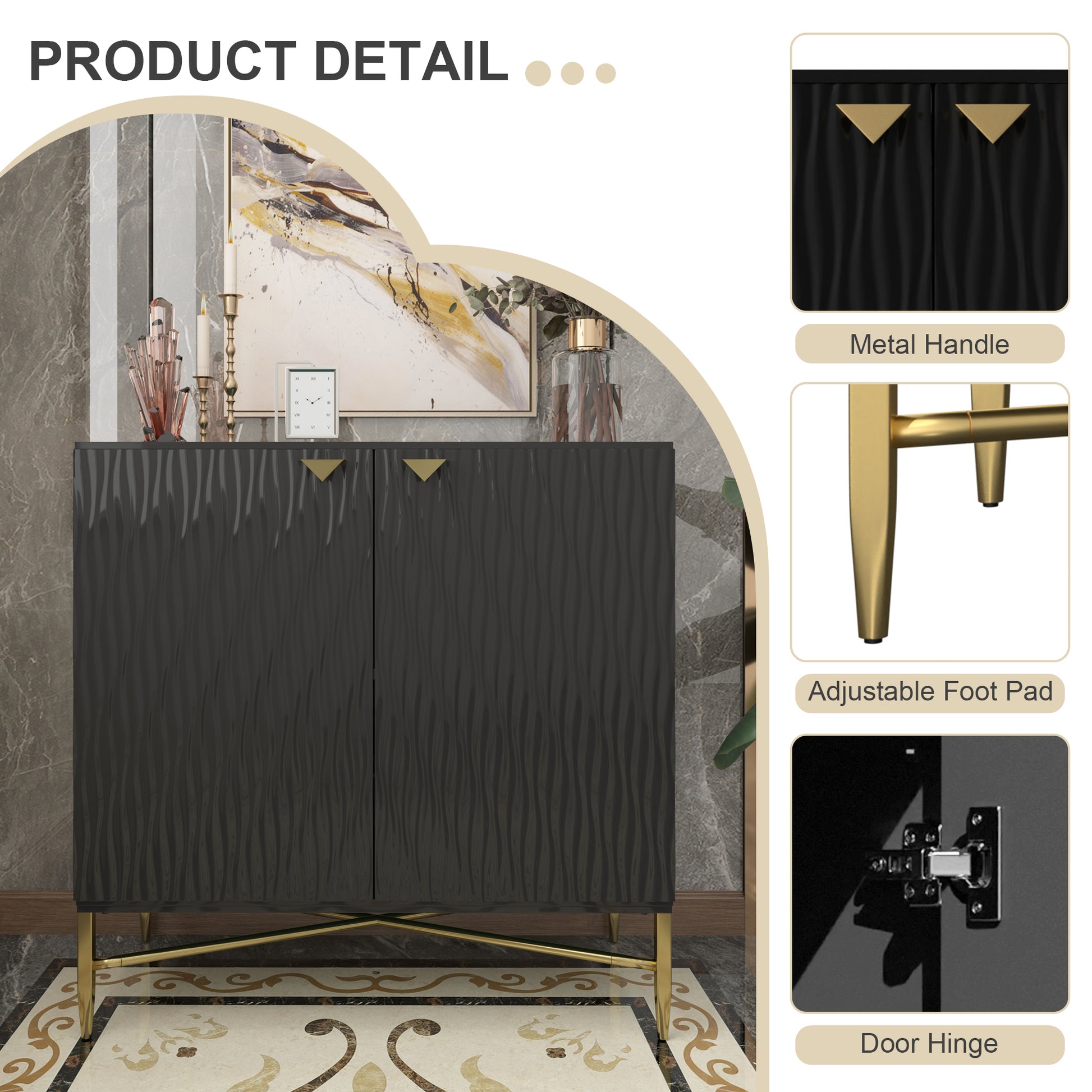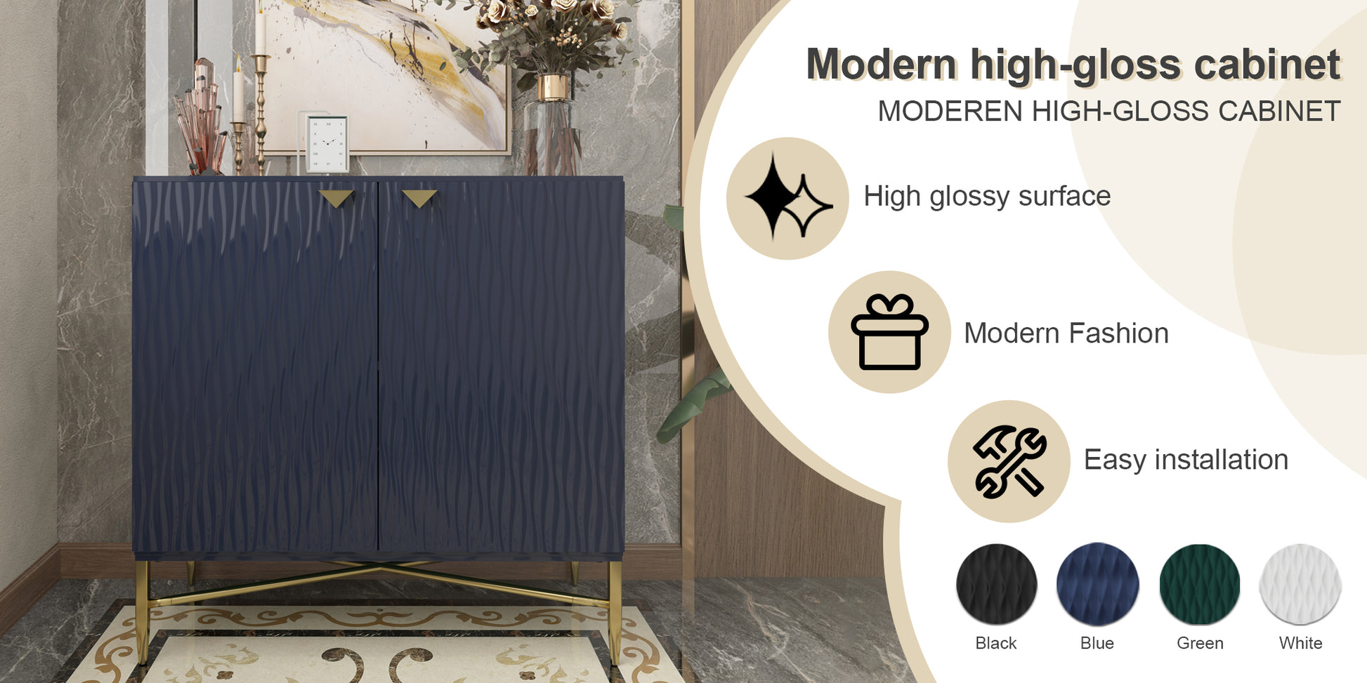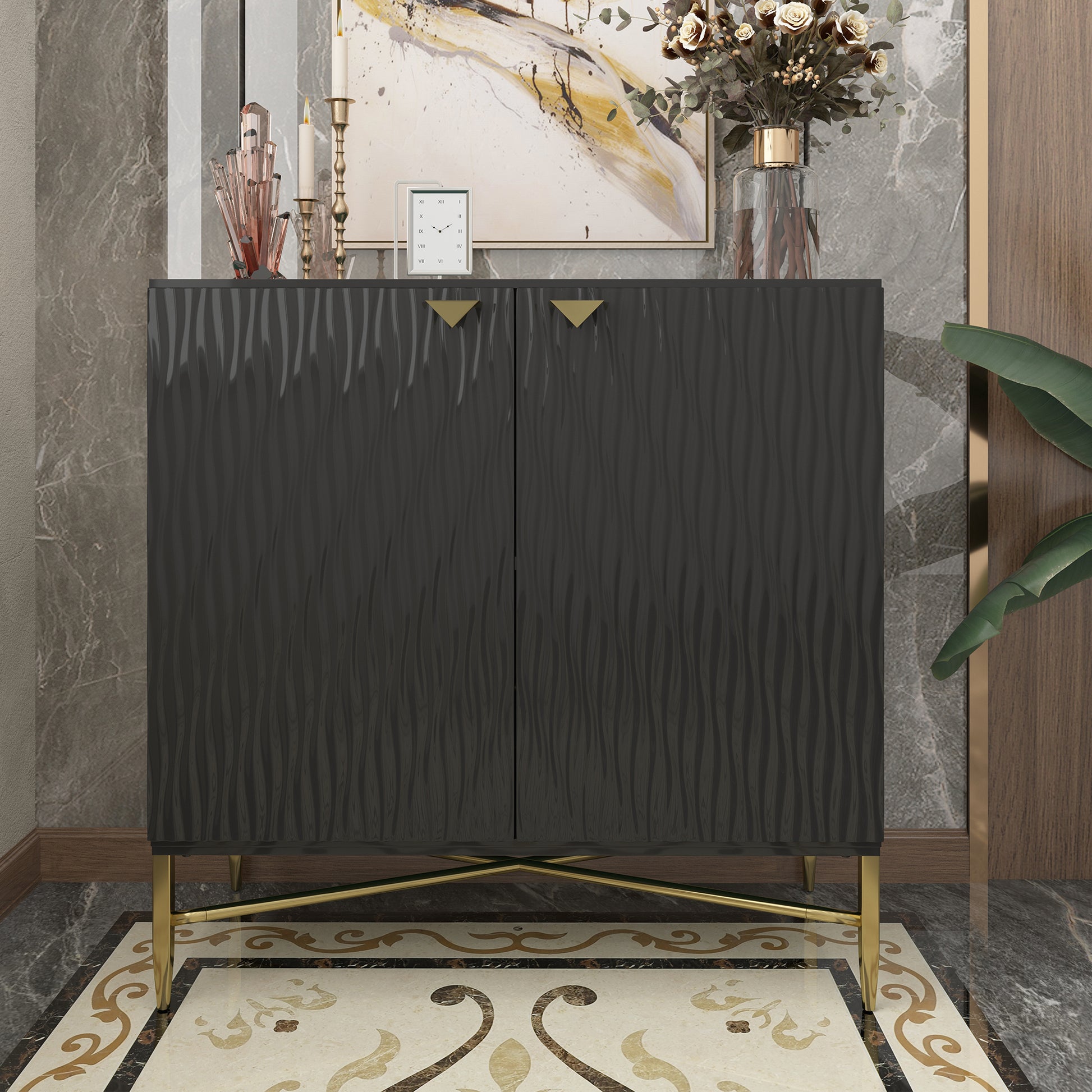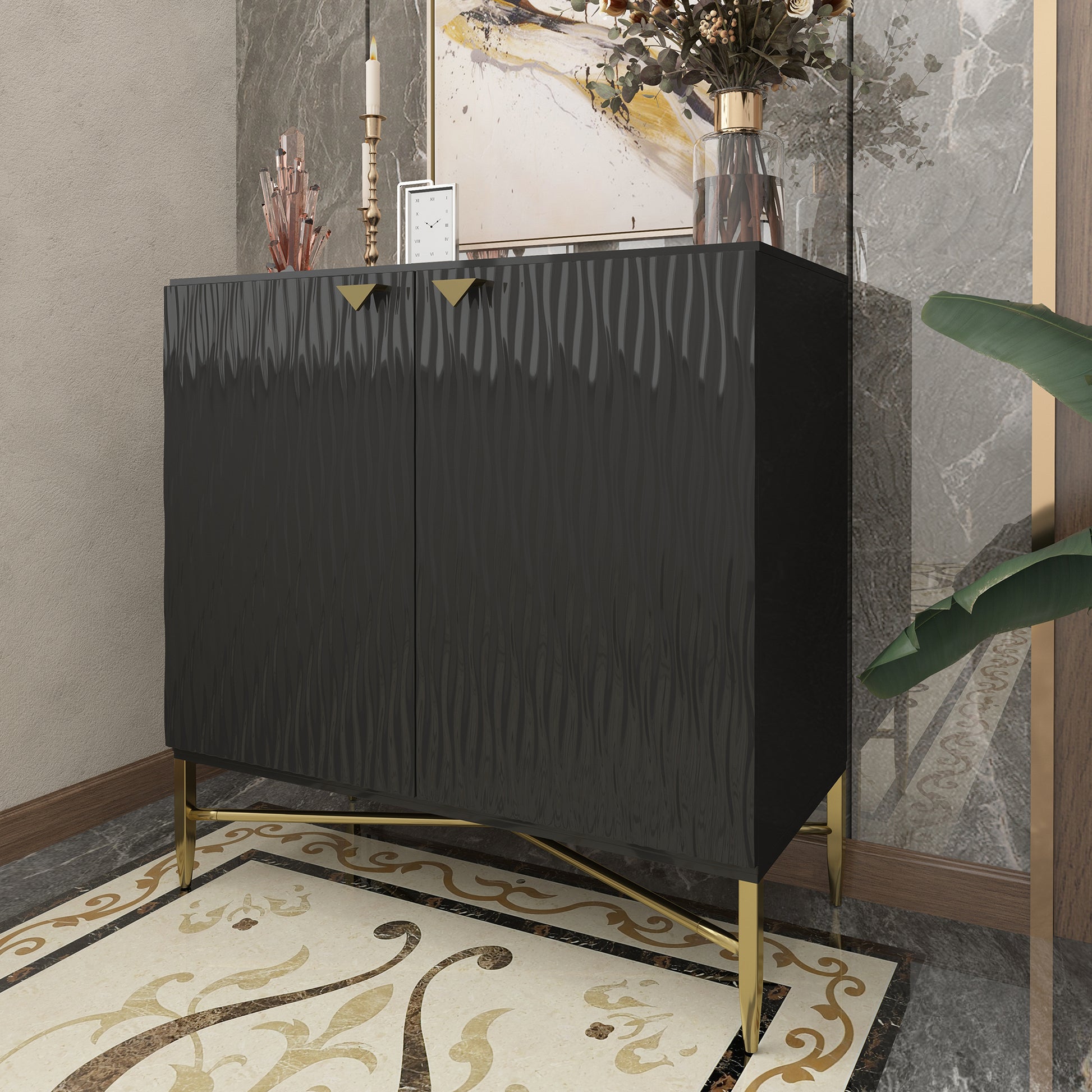 This door cabinet from our store enhances any space in your home with ample storage space and a luxurious high-gloss finish with attractive gold spindly legs and triangular handles. The black lines throughout the cabinet are clean and straight. The two cabinet doors feature an elegant pattern of small raised diamond shapes that open to reveal an adjustable shelf for storing anything from dishes to books to shoes. Additionally, the back of this cabinet has a polished finish, so it would look great next to a hallway wall or in the center of a home office.