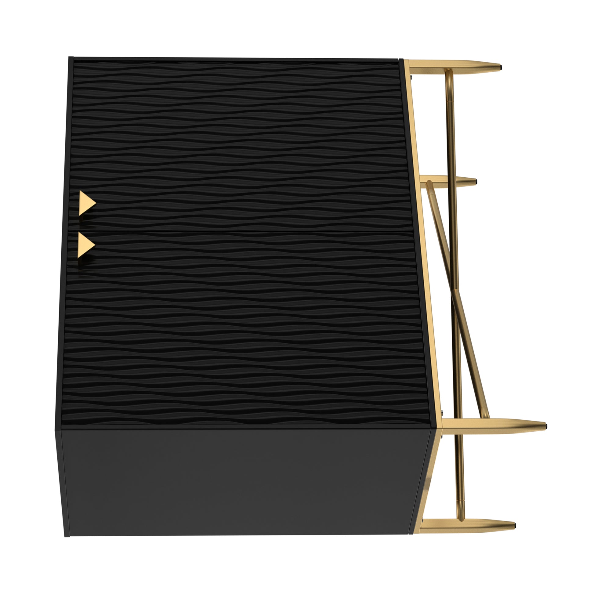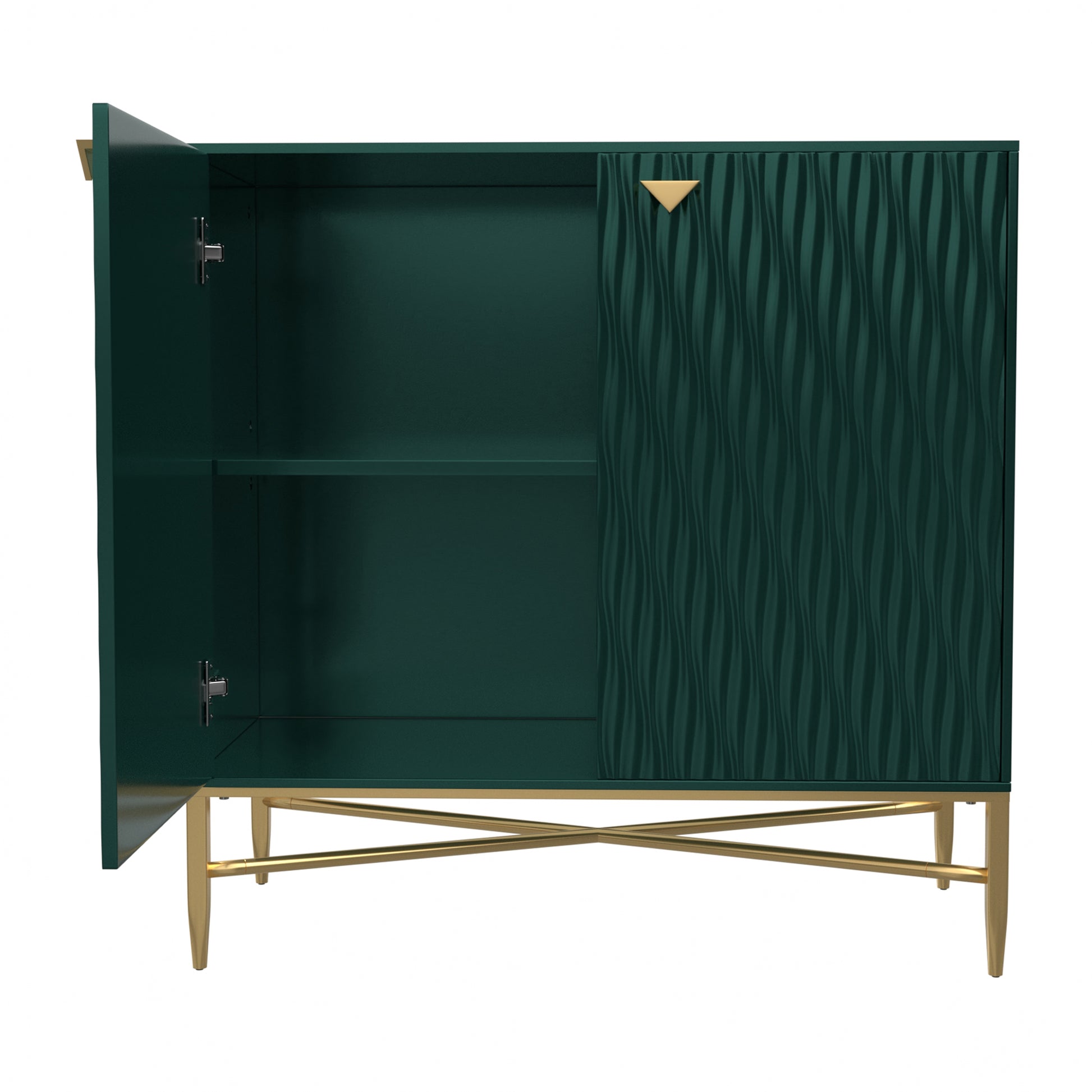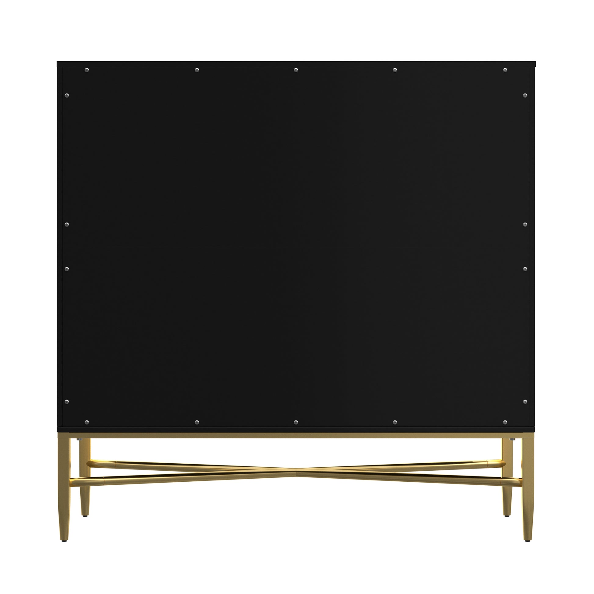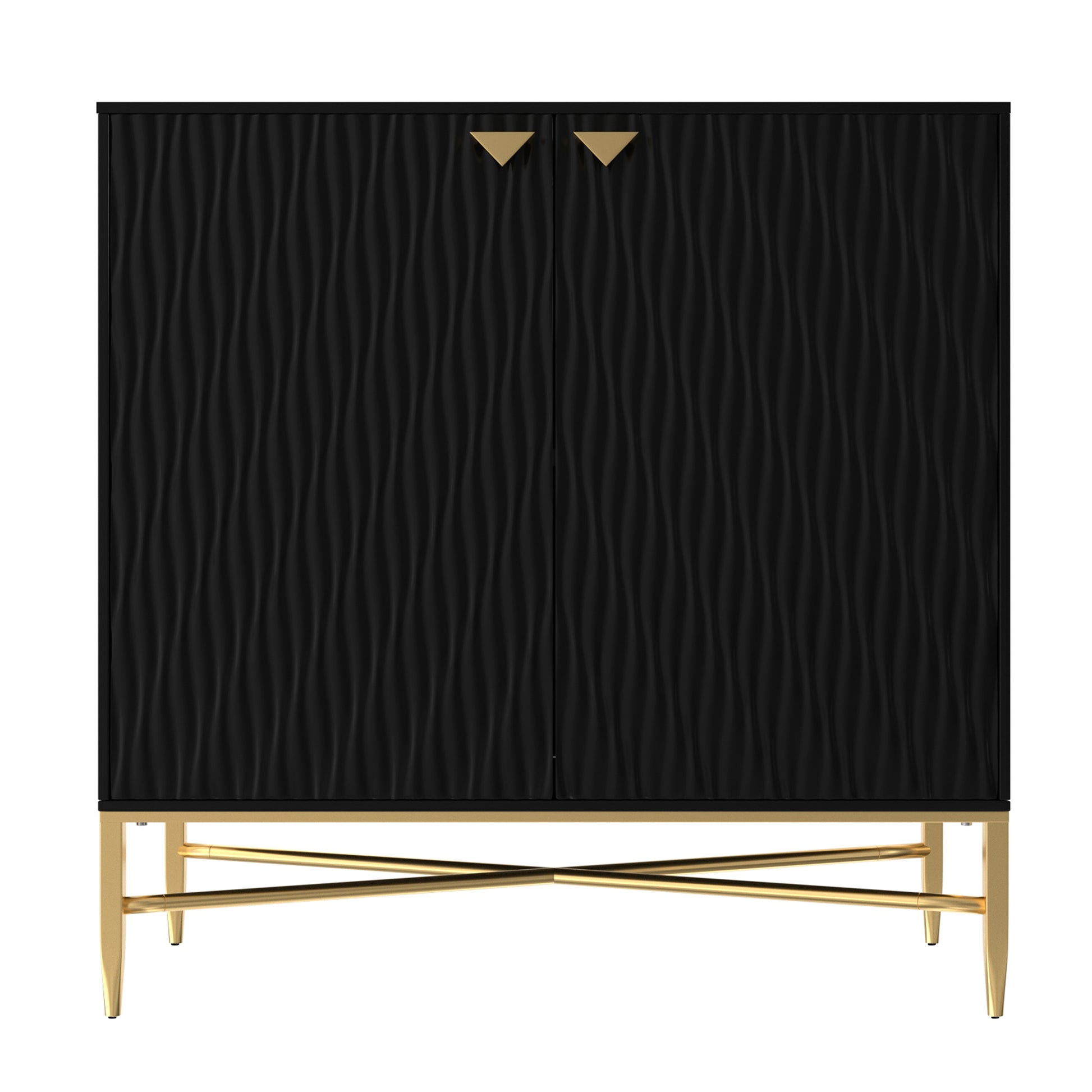 This door cabinet from our store enhances any space in your home with ample storage space and a luxurious high-gloss finish with attractive gold spindly legs and triangular handles. The black lines throughout the cabinet are clean and straight. The two cabinet doors feature an elegant pattern of small raised diamond shapes that open to reveal an adjustable shelf for storing anything from dishes to books to shoes. Additionally, the back of this cabinet has a polished finish, so it would look great next to a hallway wall or in the center of a home office.