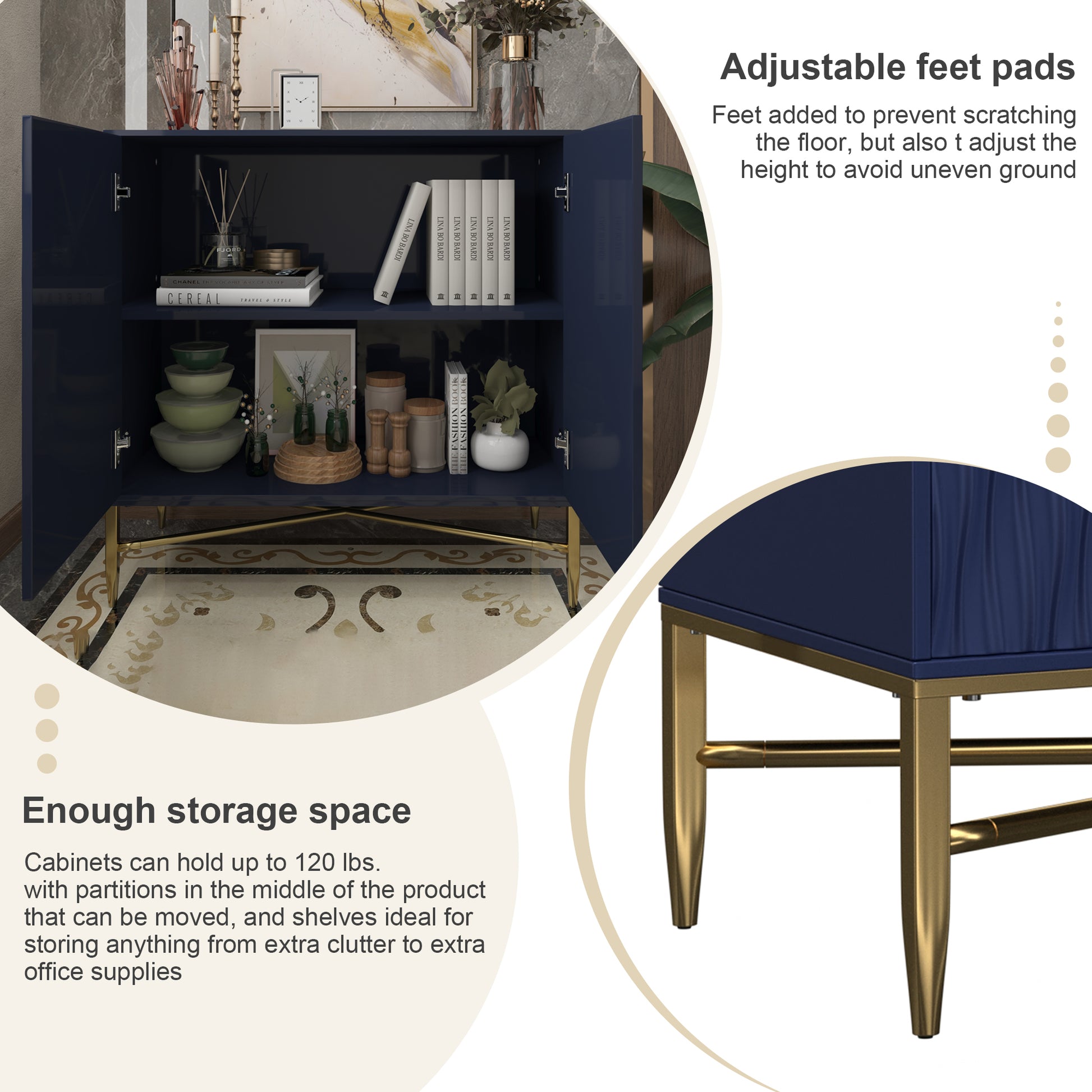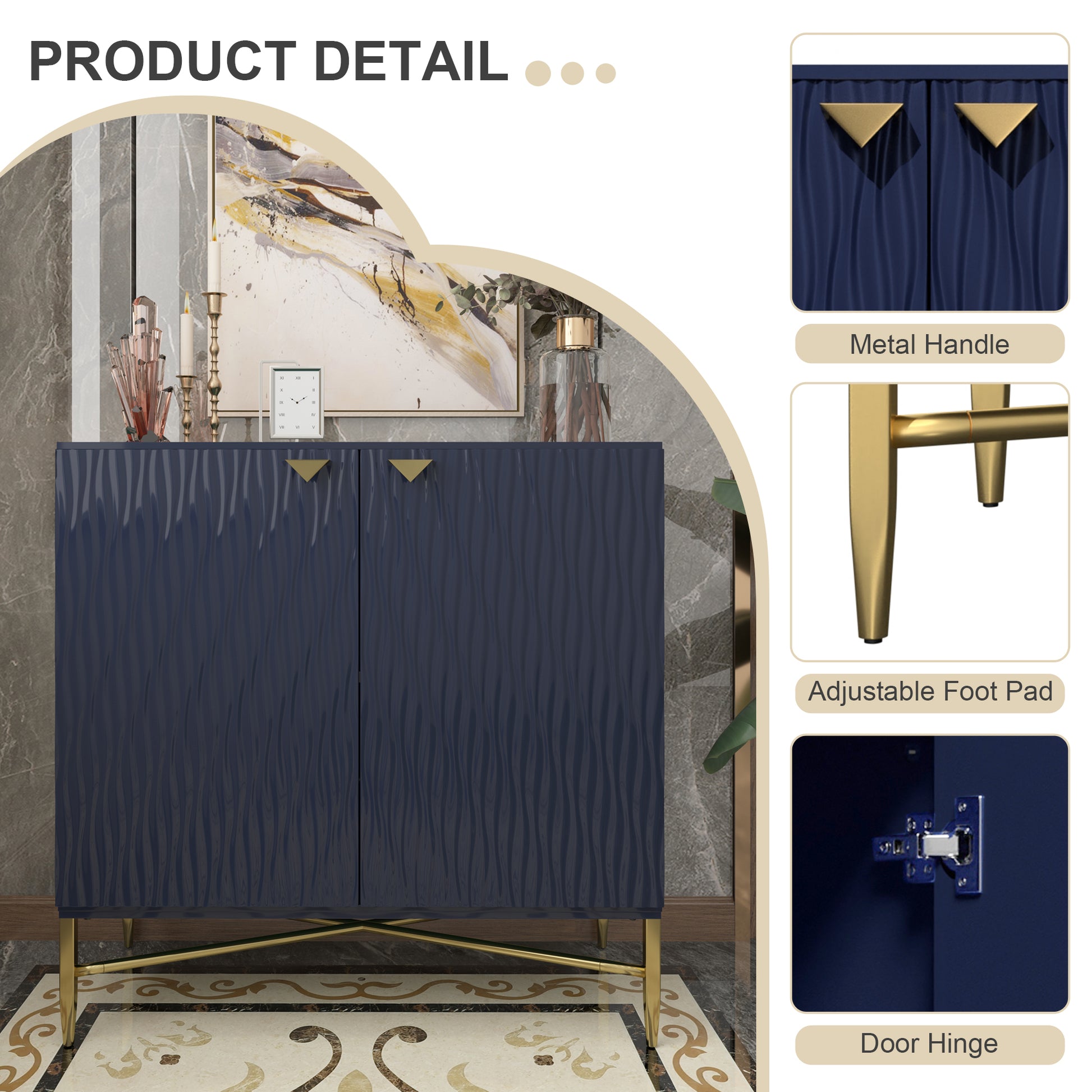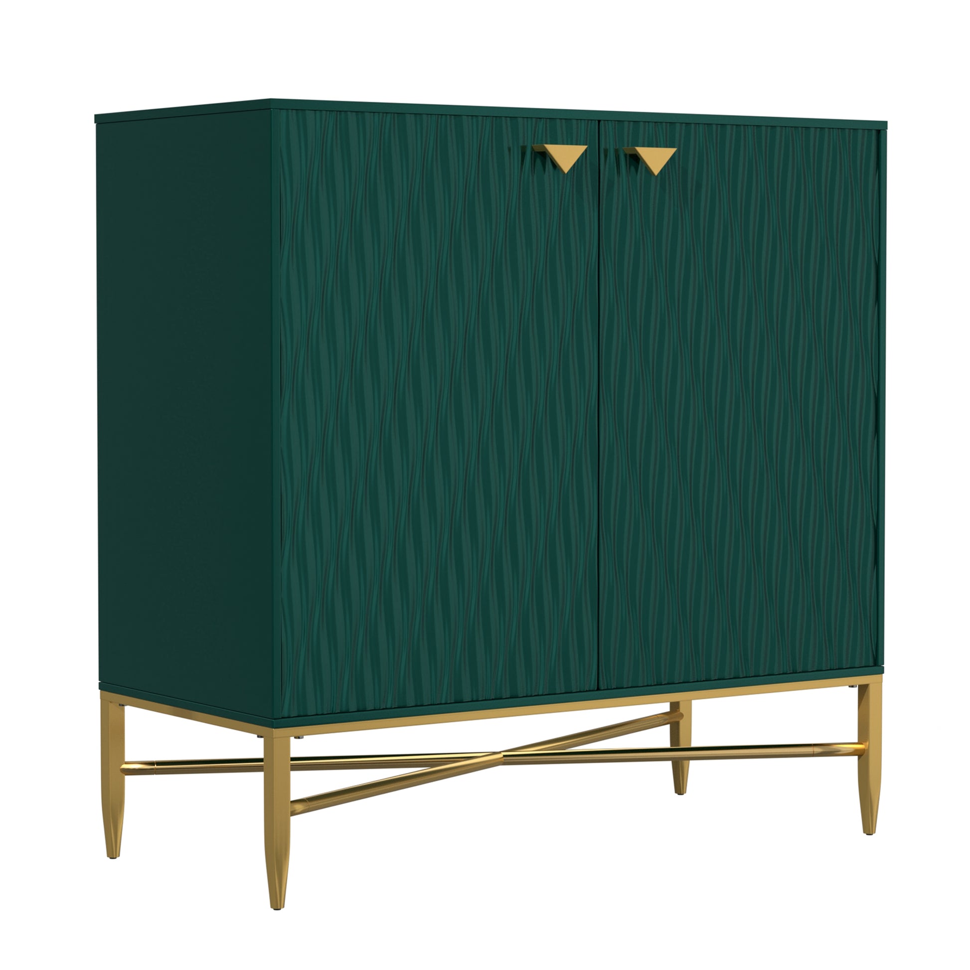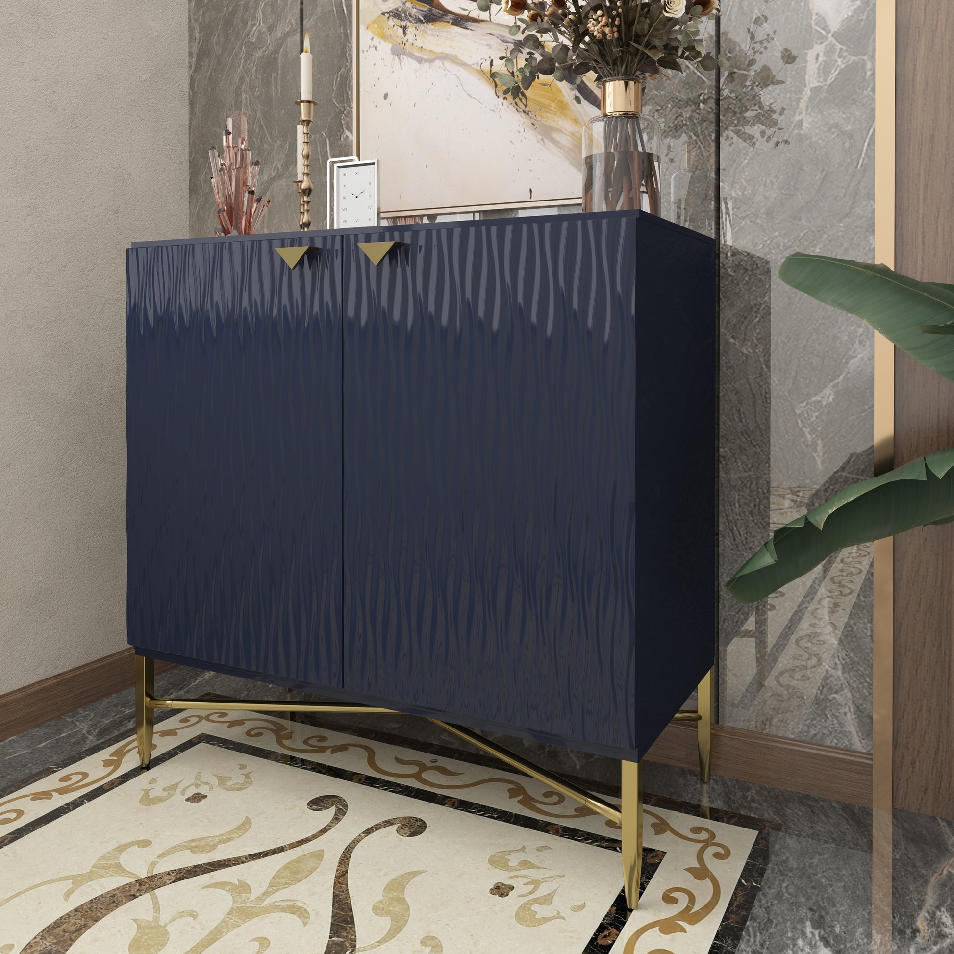 This door cabinet from our store enhances any space in your home with ample storage space and a luxurious high-gloss finish with attractive gold spindly legs and triangular handles. The black lines throughout the cabinet are clean and straight. The two cabinet doors feature an elegant pattern of small raised diamond shapes that open to reveal an adjustable shelf for storing anything from dishes to books to shoes. Additionally, the back of this cabinet has a polished finish, so it would look great next to a hallway wall or in the center of a home office.
