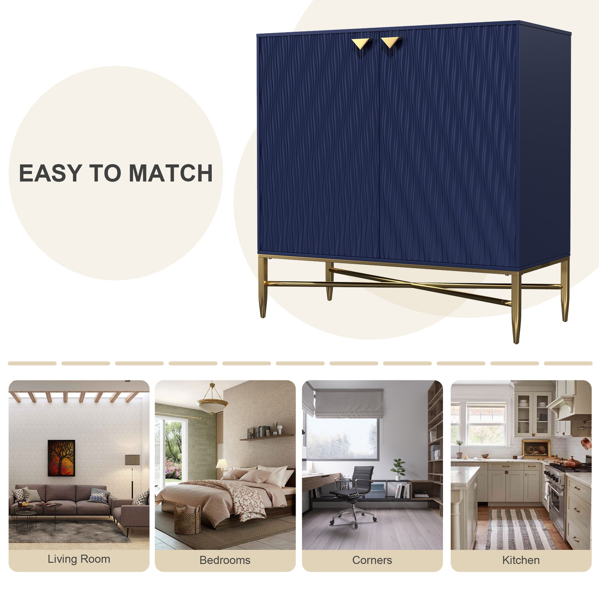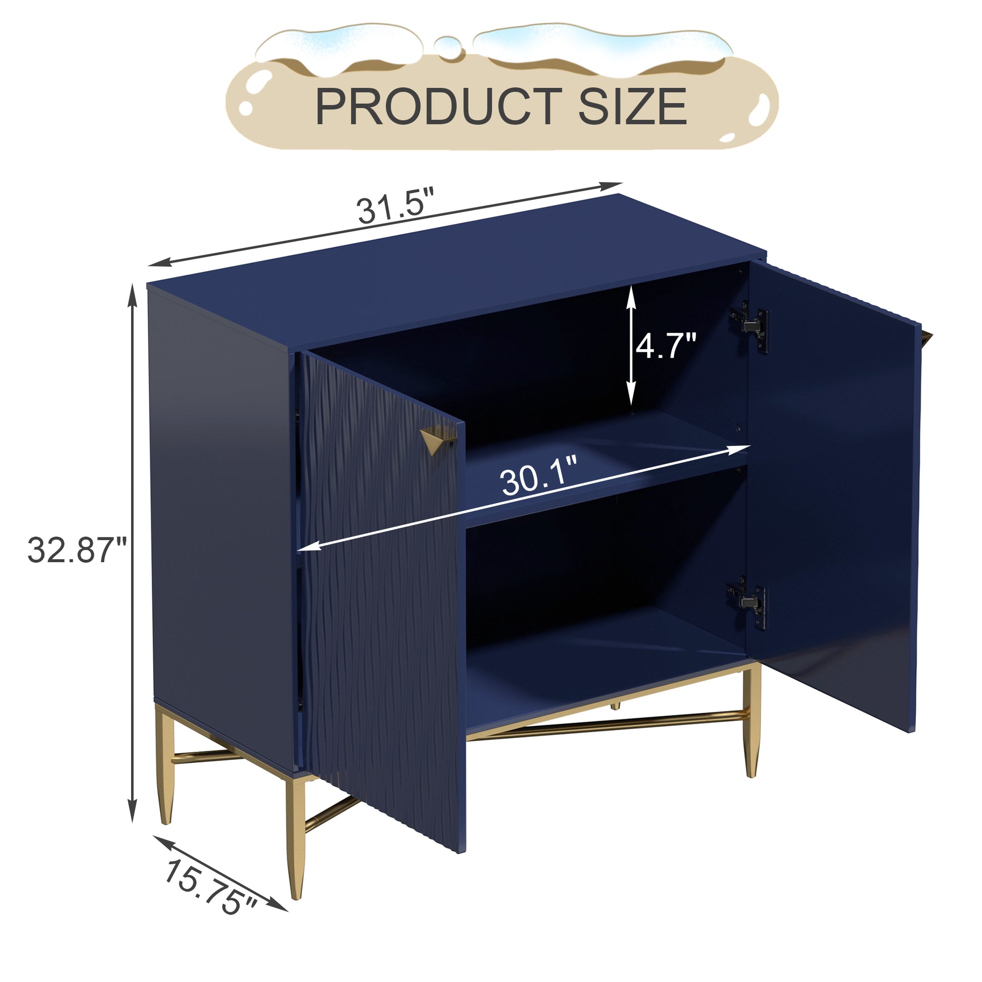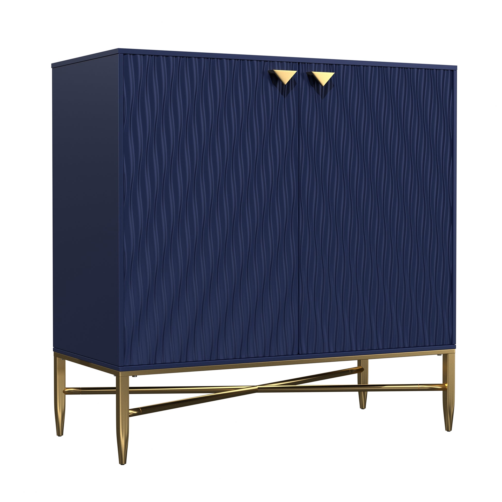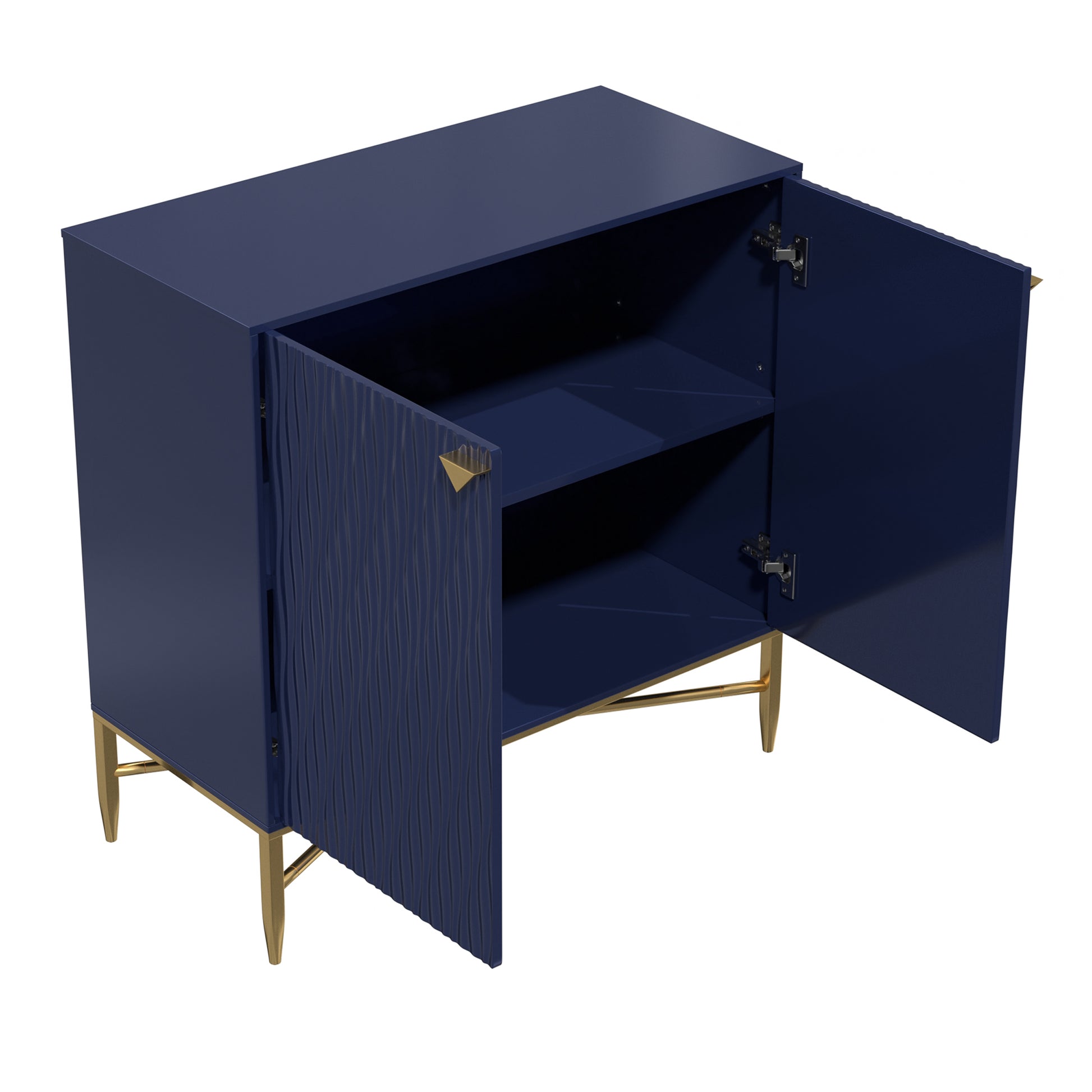 This door cabinet from our store enhances any space in your home with ample storage space and a luxurious high-gloss finish with attractive gold spindly legs and triangular handles. The black lines throughout the cabinet are clean and straight. The two cabinet doors feature an elegant pattern of small raised diamond shapes that open to reveal an adjustable shelf for storing anything from dishes to books to shoes. Additionally, the back of this cabinet has a polished finish, so it would look great next to a hallway wall or in the center of a home office.