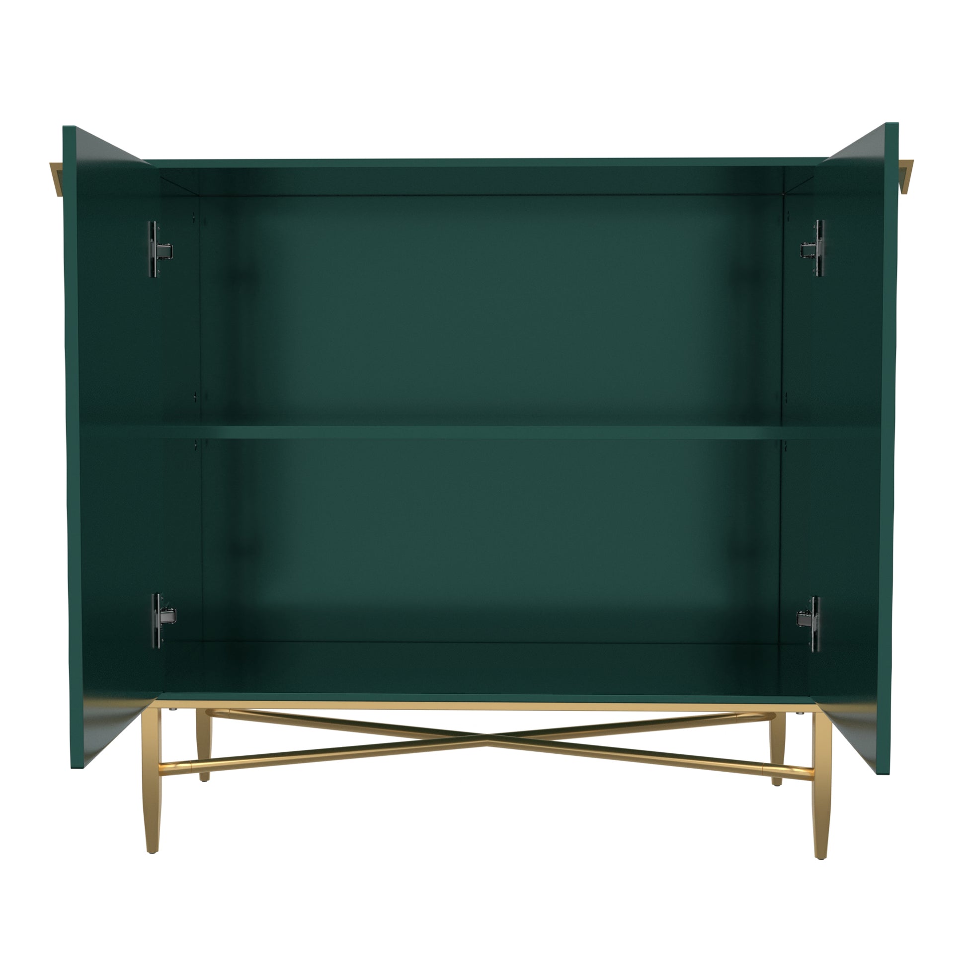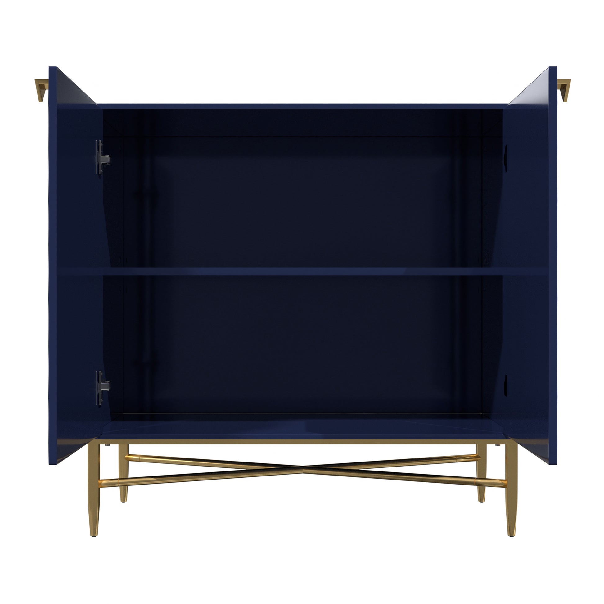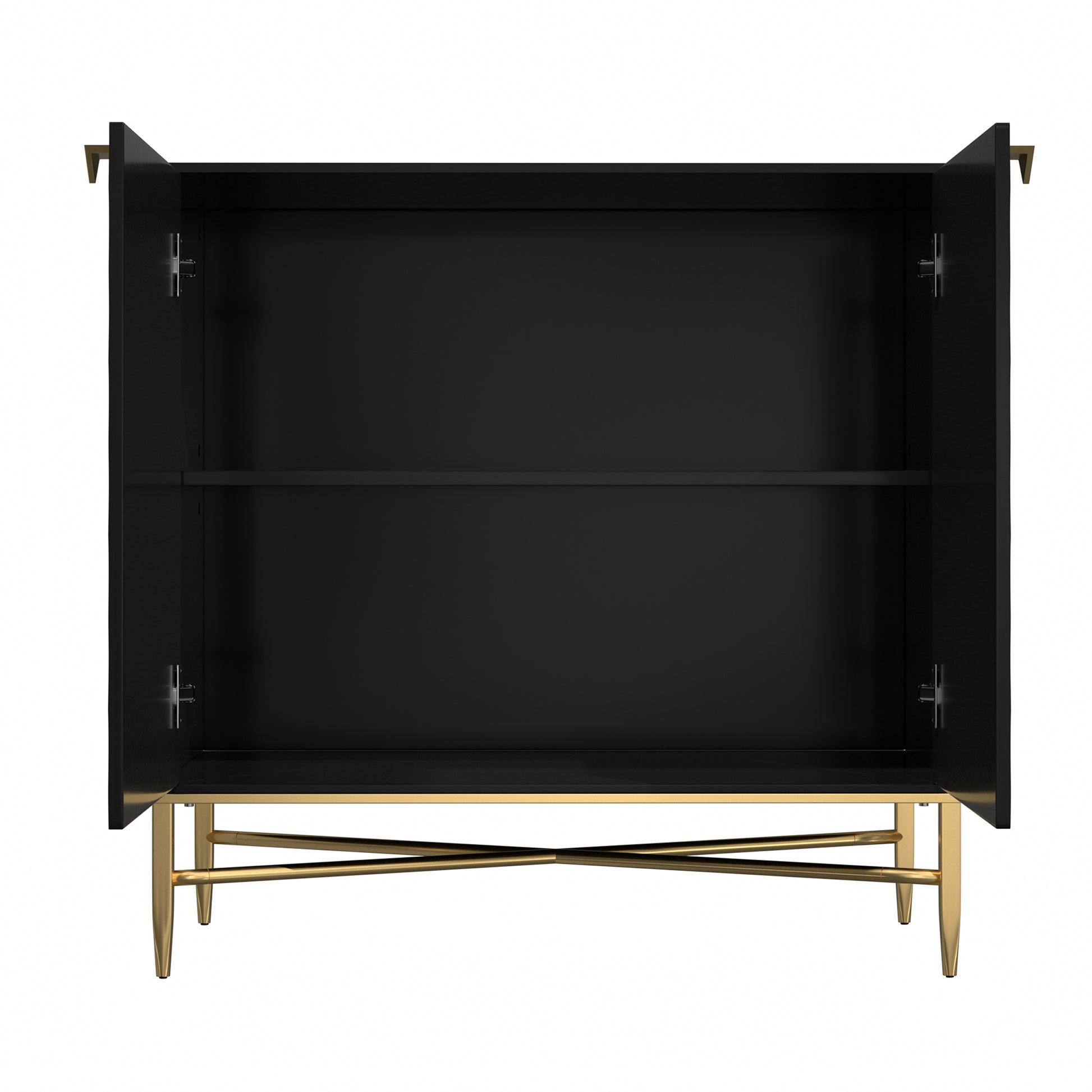 - Door cabinet is supported by elegant brass powder-coated x-tapered metal legs with uniquely designed handles to create an attractive look