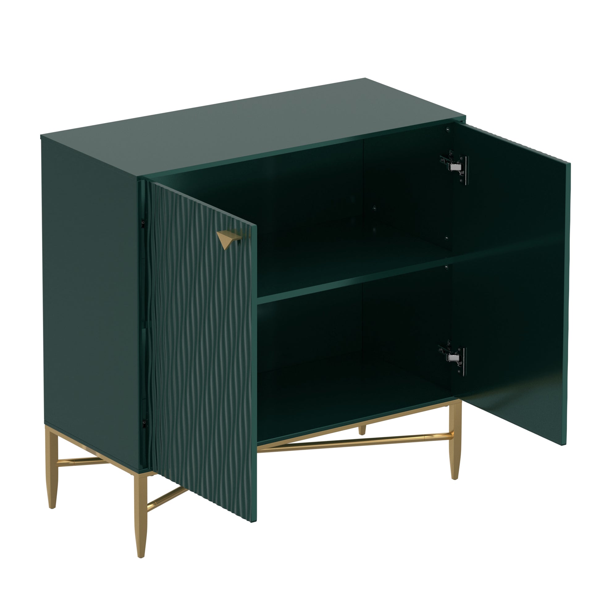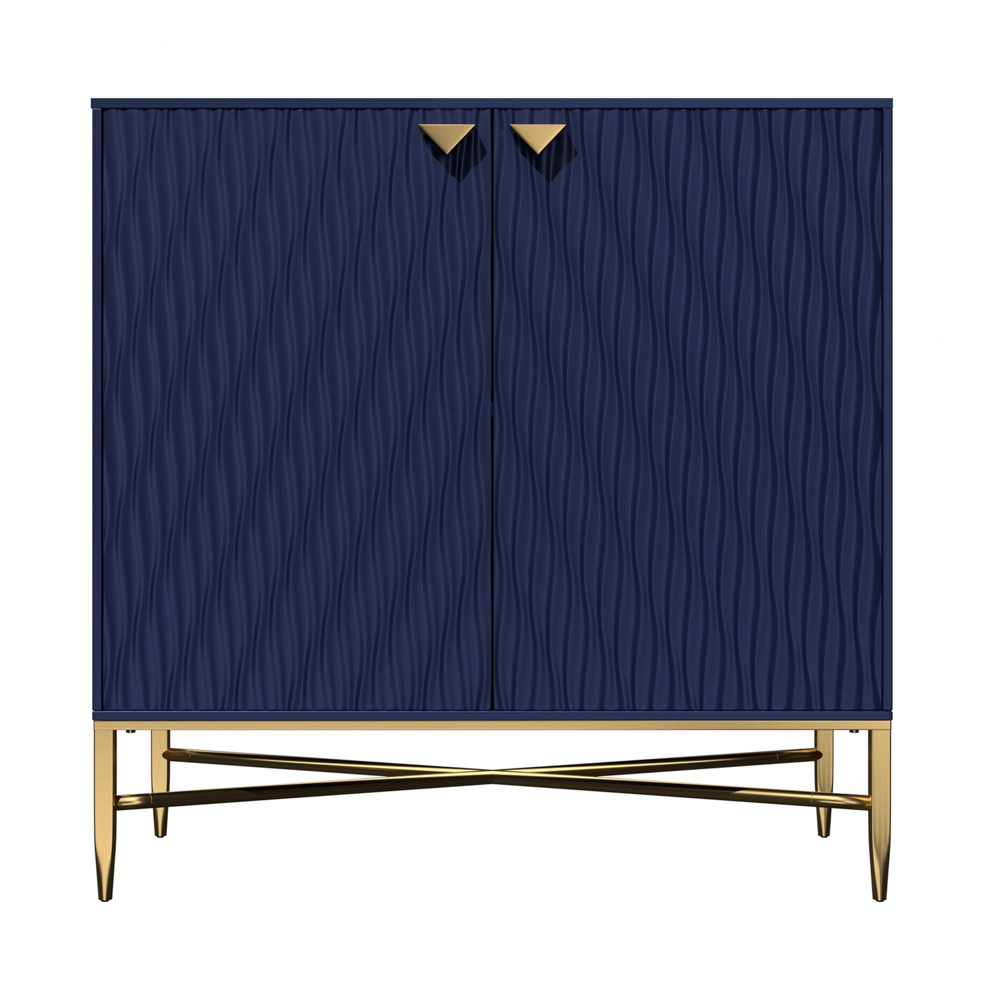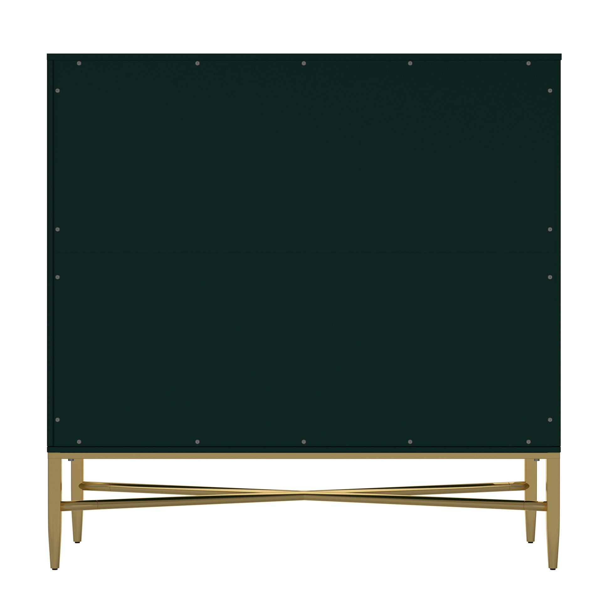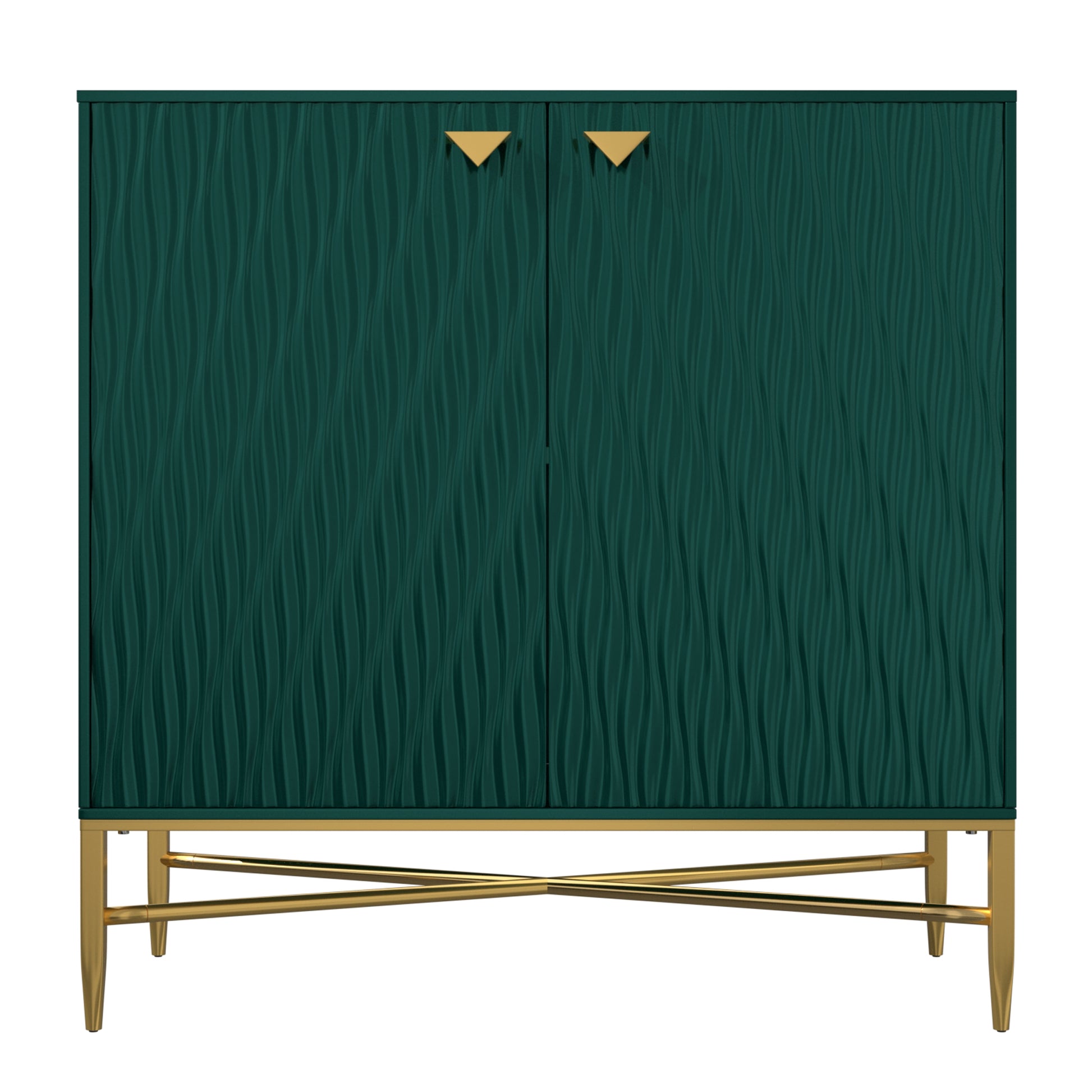 - Door cabinet is supported by elegant brass powder-coated x-tapered metal legs with uniquely designed handles to create an attractive look