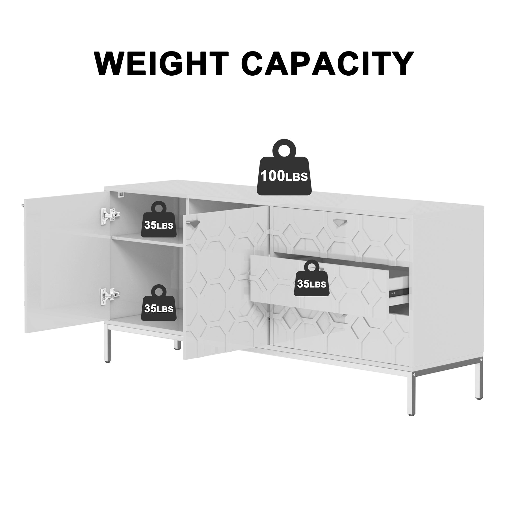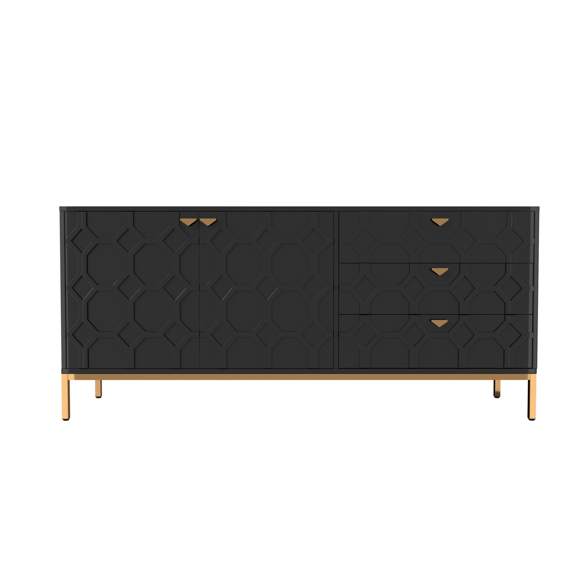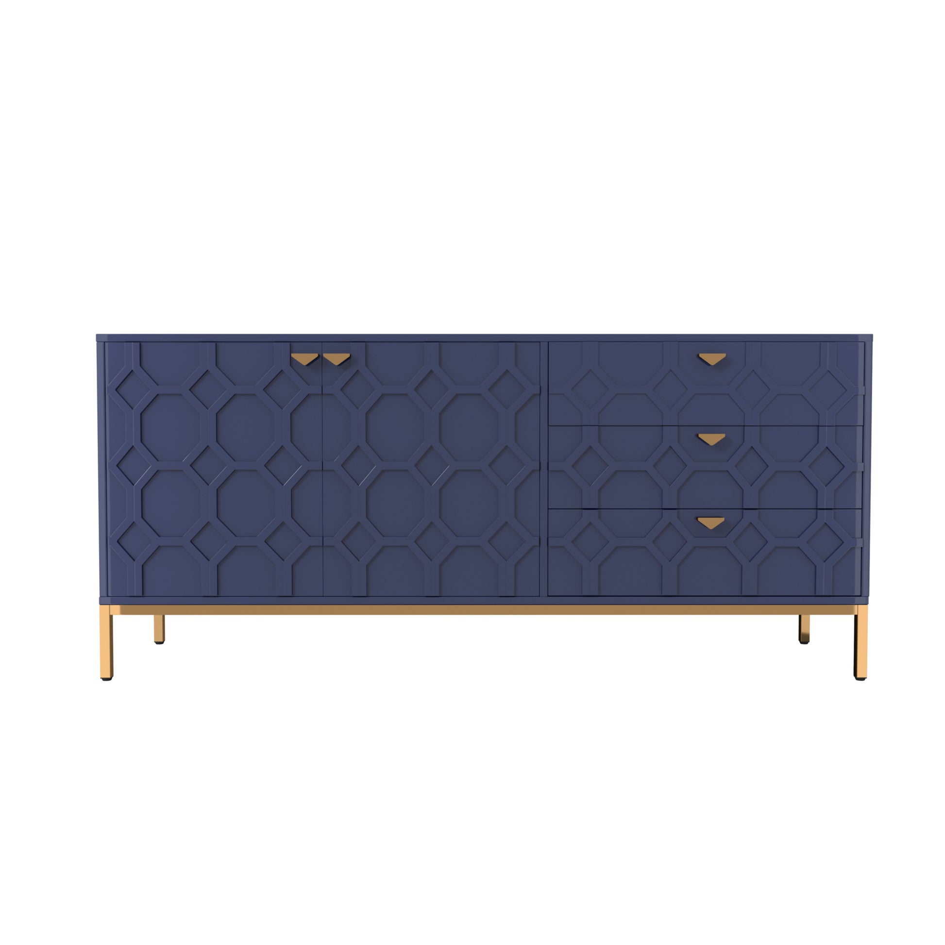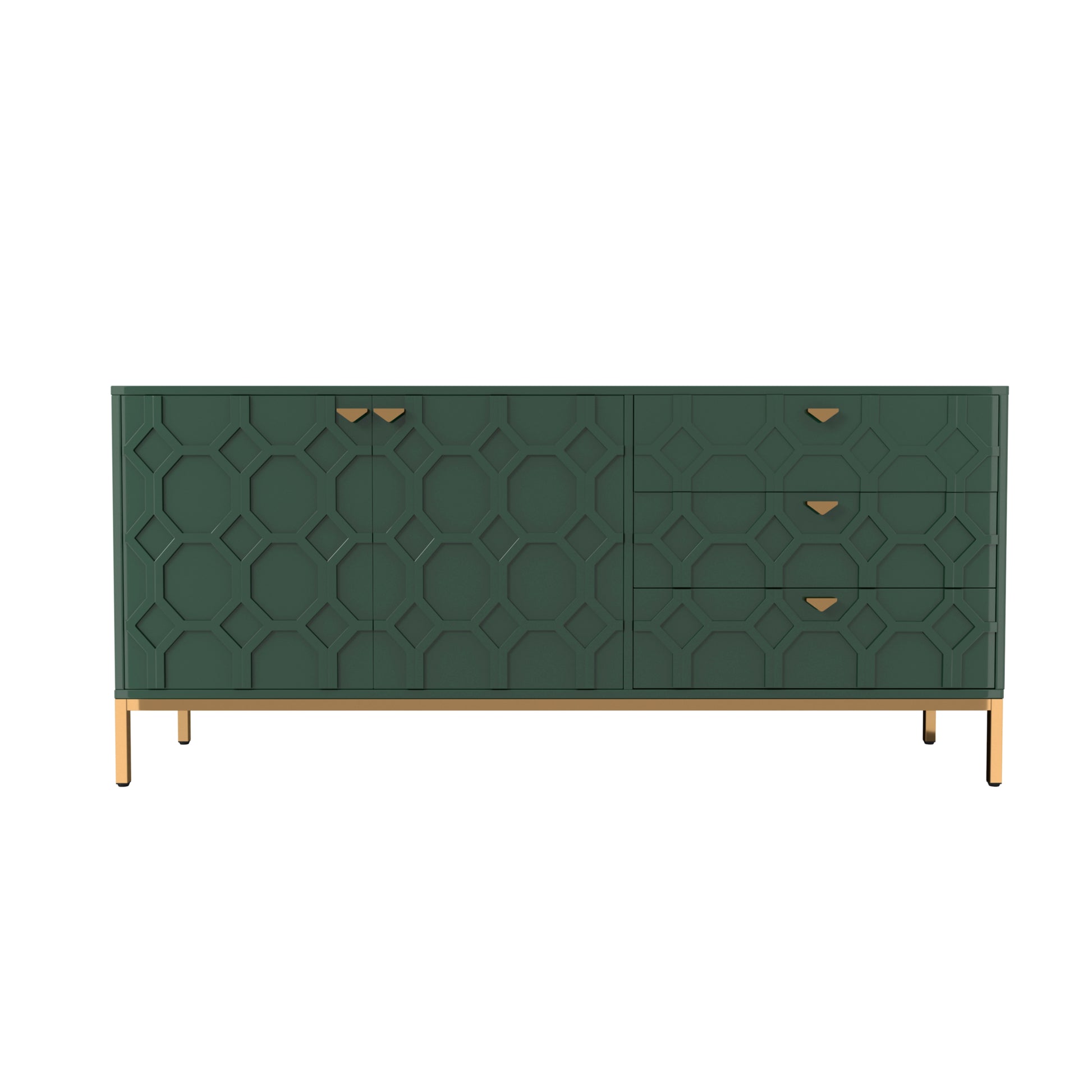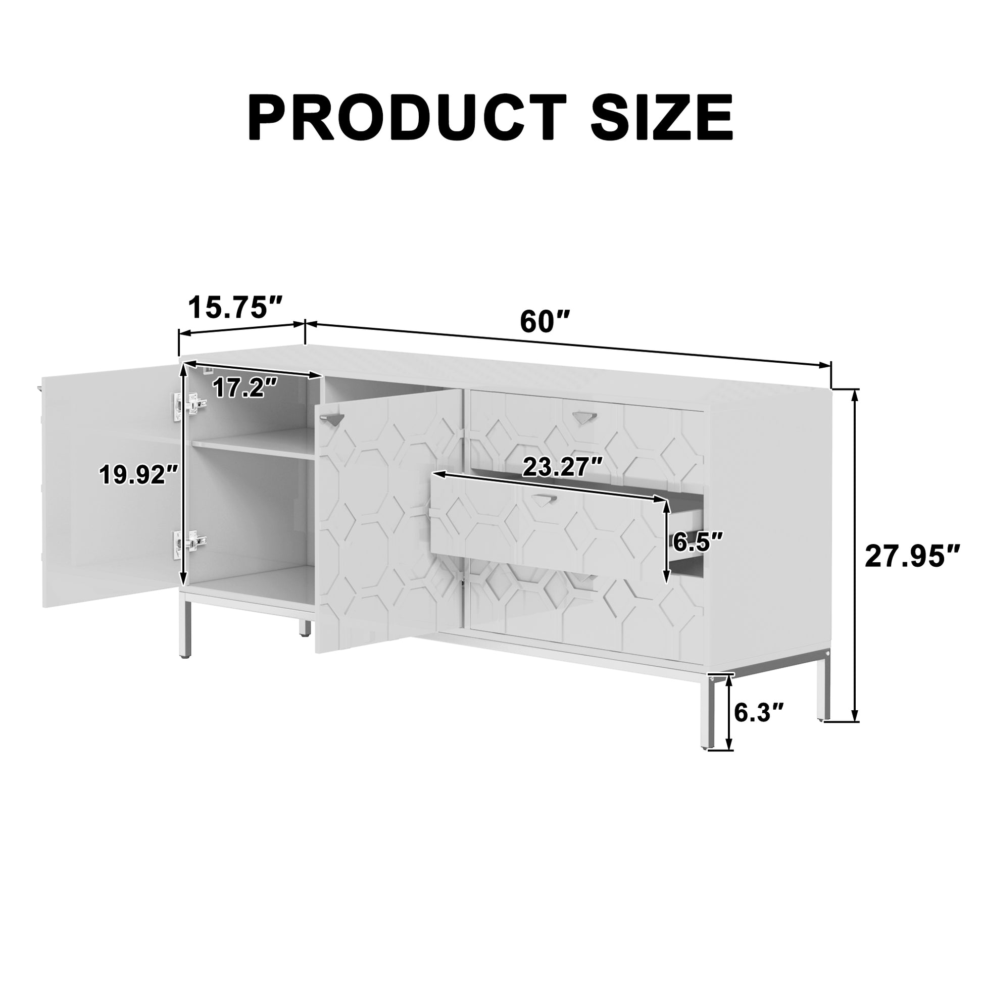 This sideboard with 3 drawers from our store can add valuable storage space and fun color to any part of your home. Made of MDF, its beautiful colors add interest to your storage solutions. The door fronts and drawer fronts are decorated with a three-dimensional honeycomb pattern, making it the perfect place for bar essentials, spare towels, and toiletries, or you can use it as a TV stand. It is recommended that two adults assemble it together. When assembled, the measures 28" H x 60" W x 15.75" D.