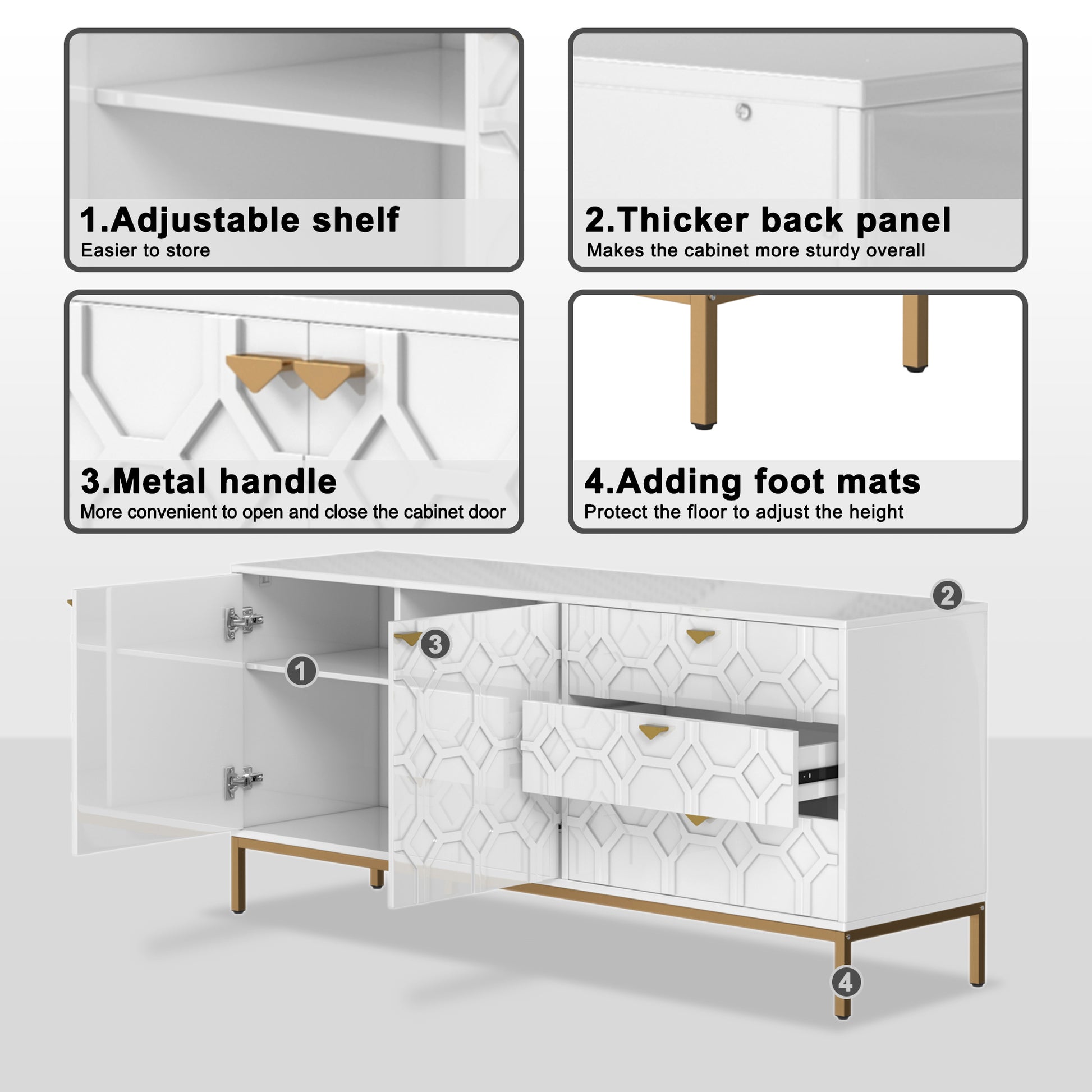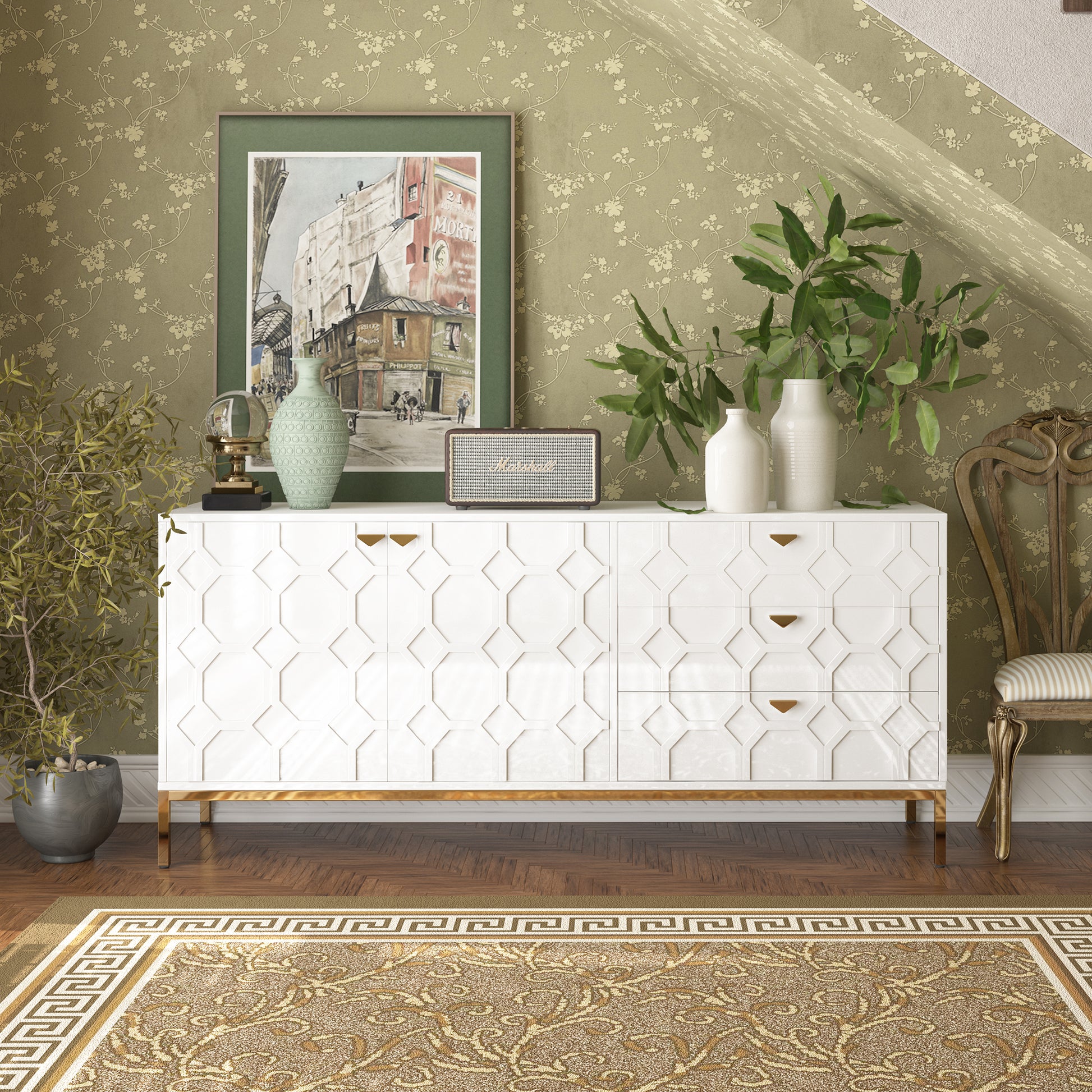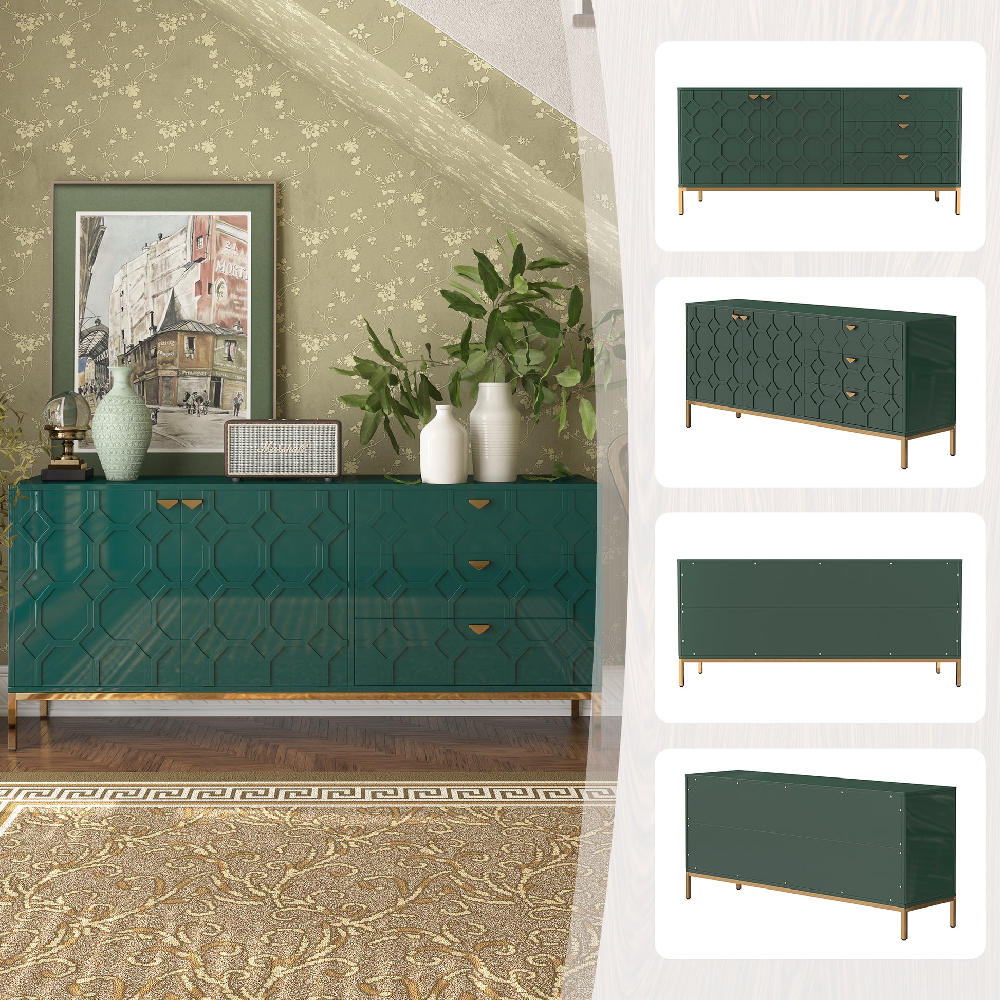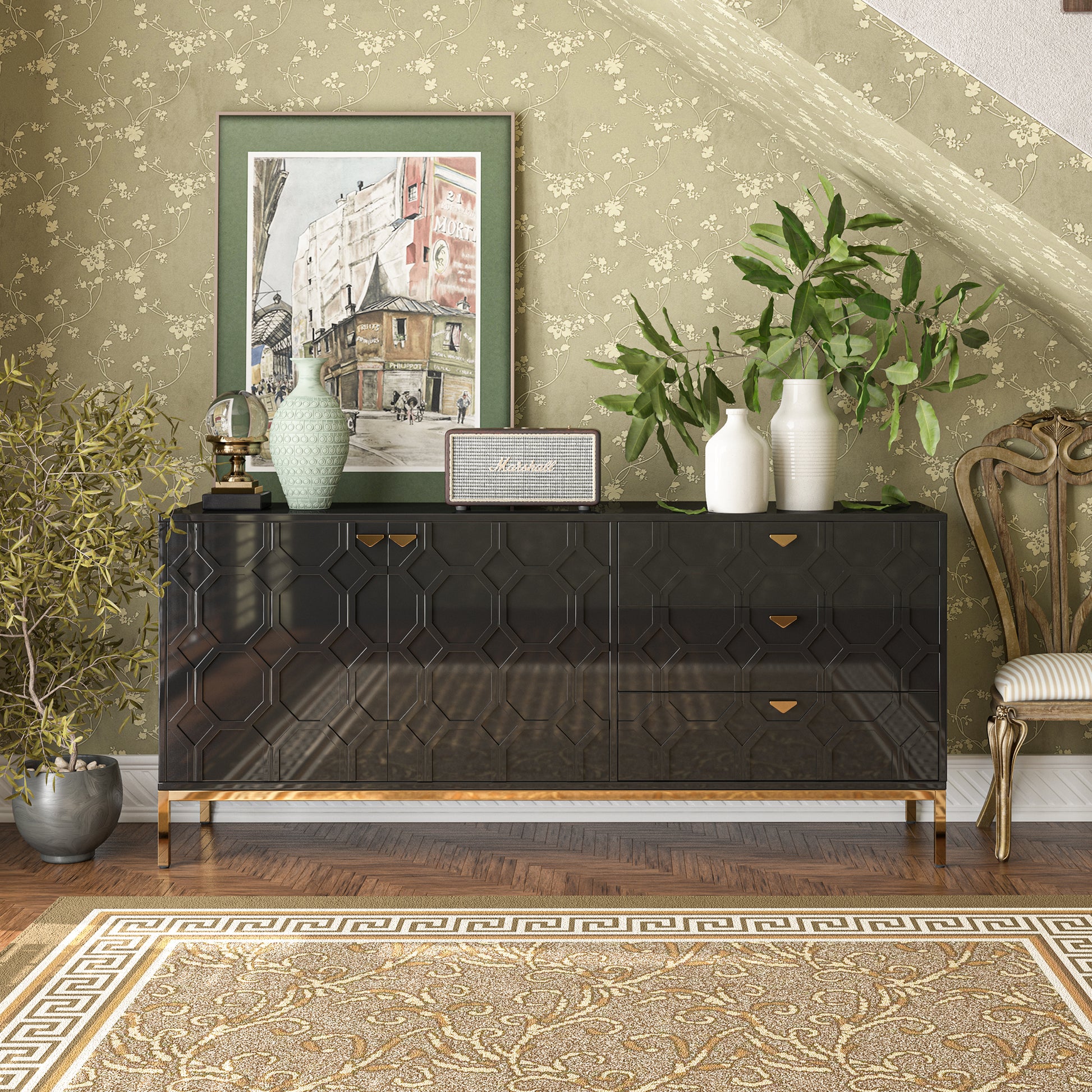 This sideboard with 3 drawers from our store can add valuable storage space and fun color to any part of your home. Made of MDF, its beautiful colors add interest to your storage solutions. The door fronts and drawer fronts are decorated with a three-dimensional honeycomb pattern, making it the perfect place for bar essentials, spare towels, and toiletries, or you can use it as a TV stand. It is recommended that two adults assemble it together. When assembled, the measures 28" H x 60" W x 15.75" D.