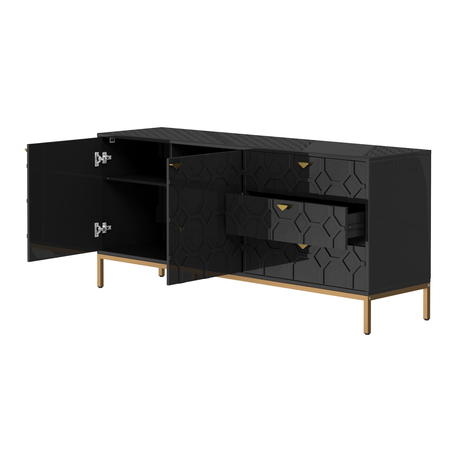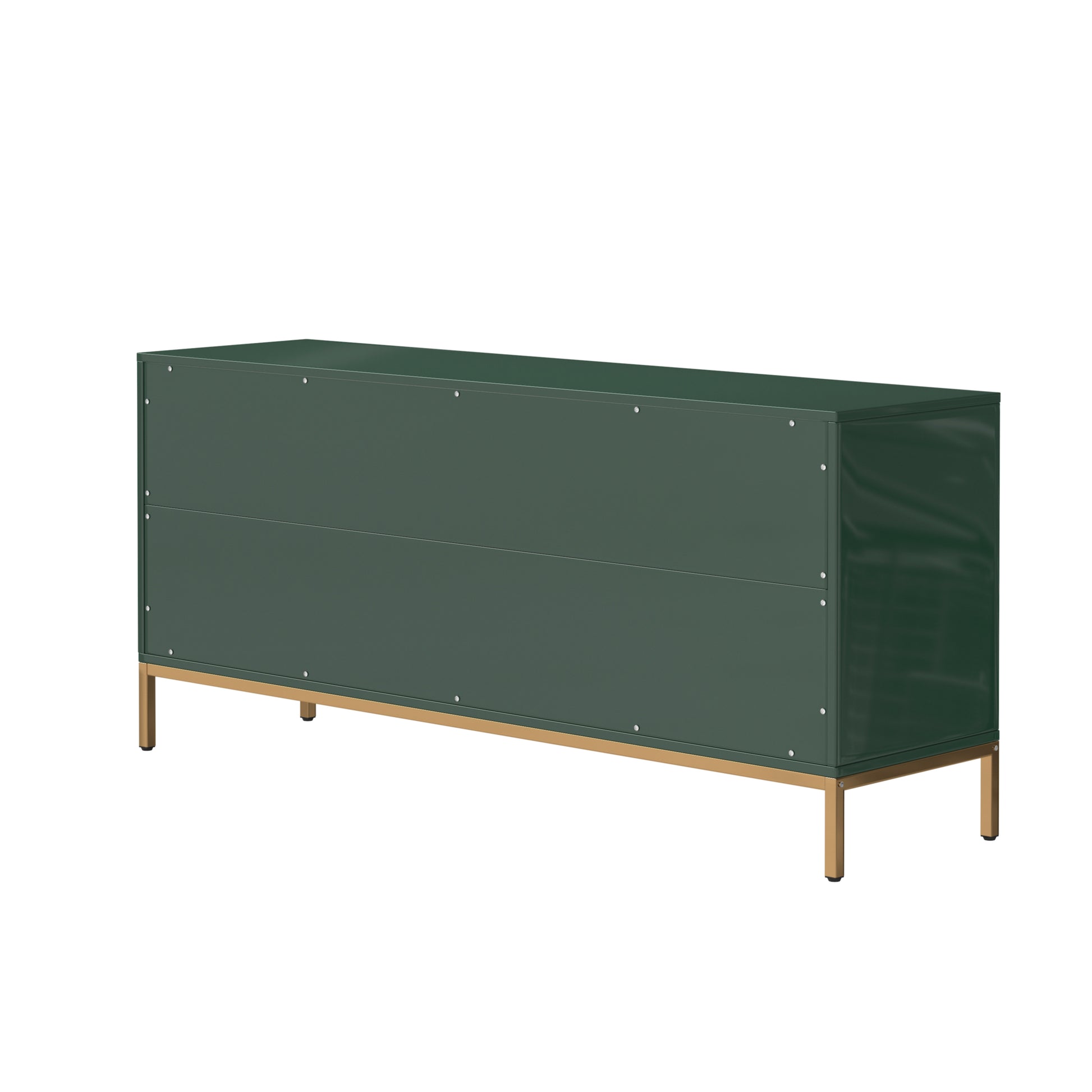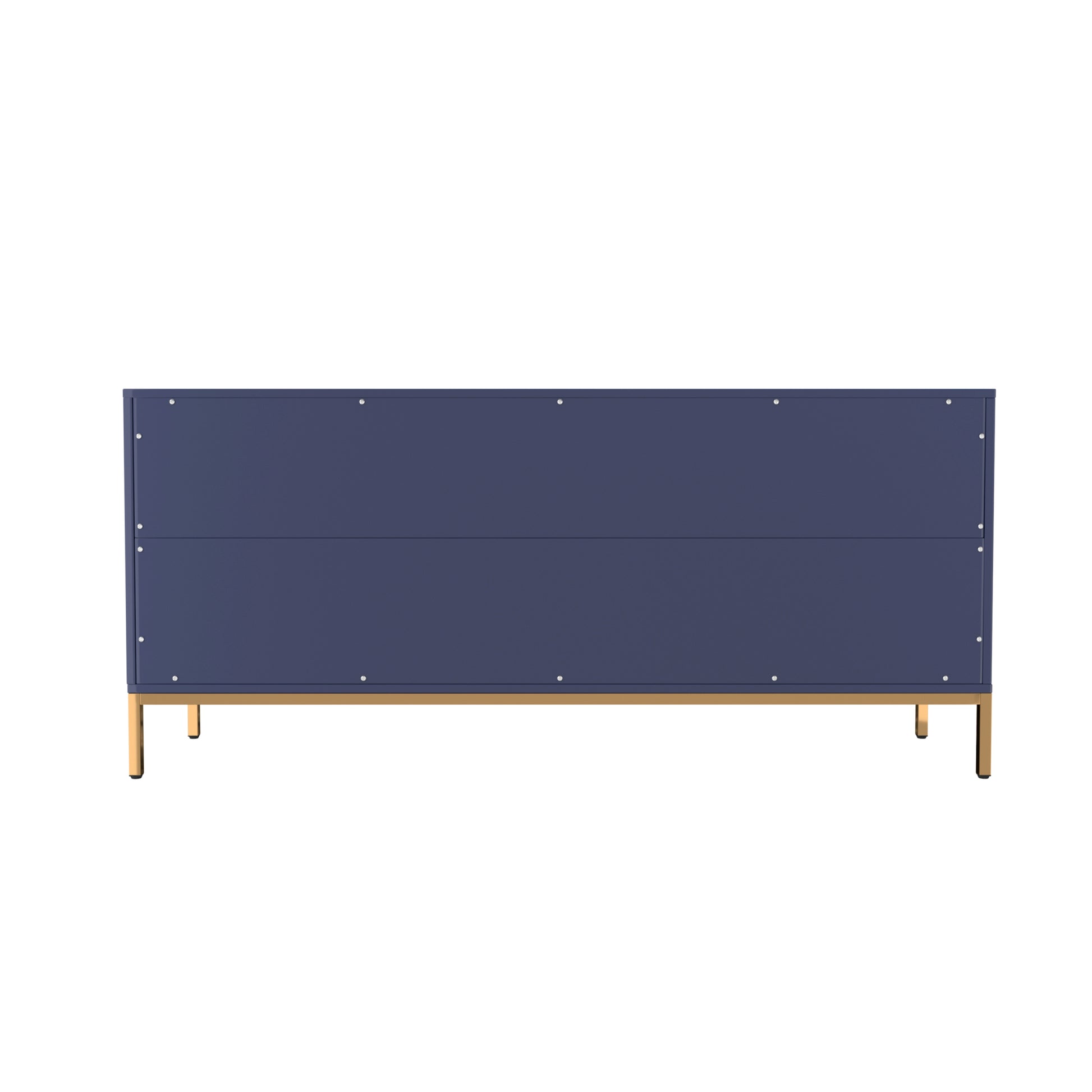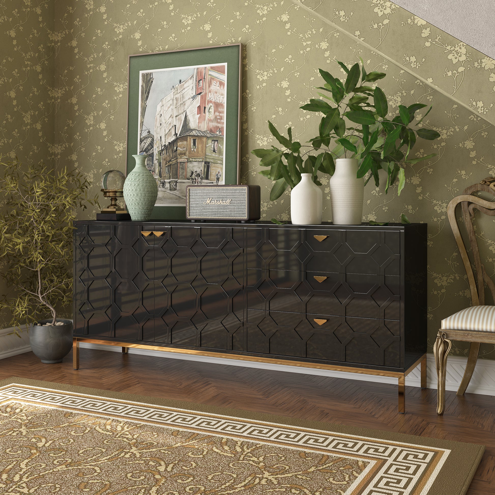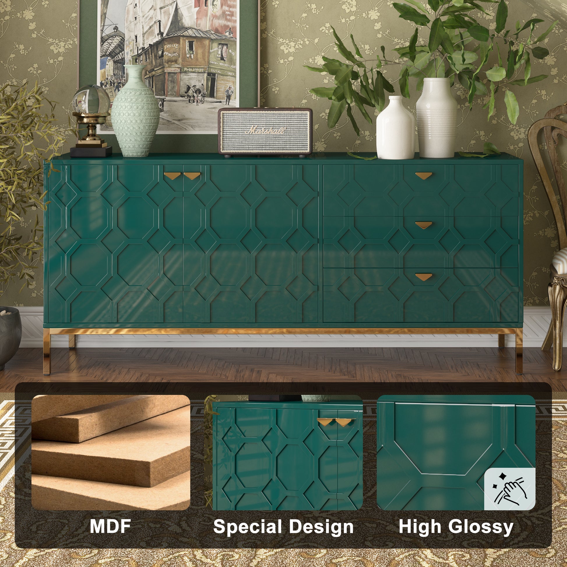 This sideboard with 3 drawers from our store can add valuable storage space and fun color to any part of your home. Made of MDF, its beautiful colors add interest to your storage solutions. The door fronts and drawer fronts are decorated with a three-dimensional honeycomb pattern, making it the perfect place for bar essentials, spare towels, and toiletries, or you can use it as a TV stand. It is recommended that two adults assemble it together. When assembled, the measures 28" H x 60" W x 15.75" D.
