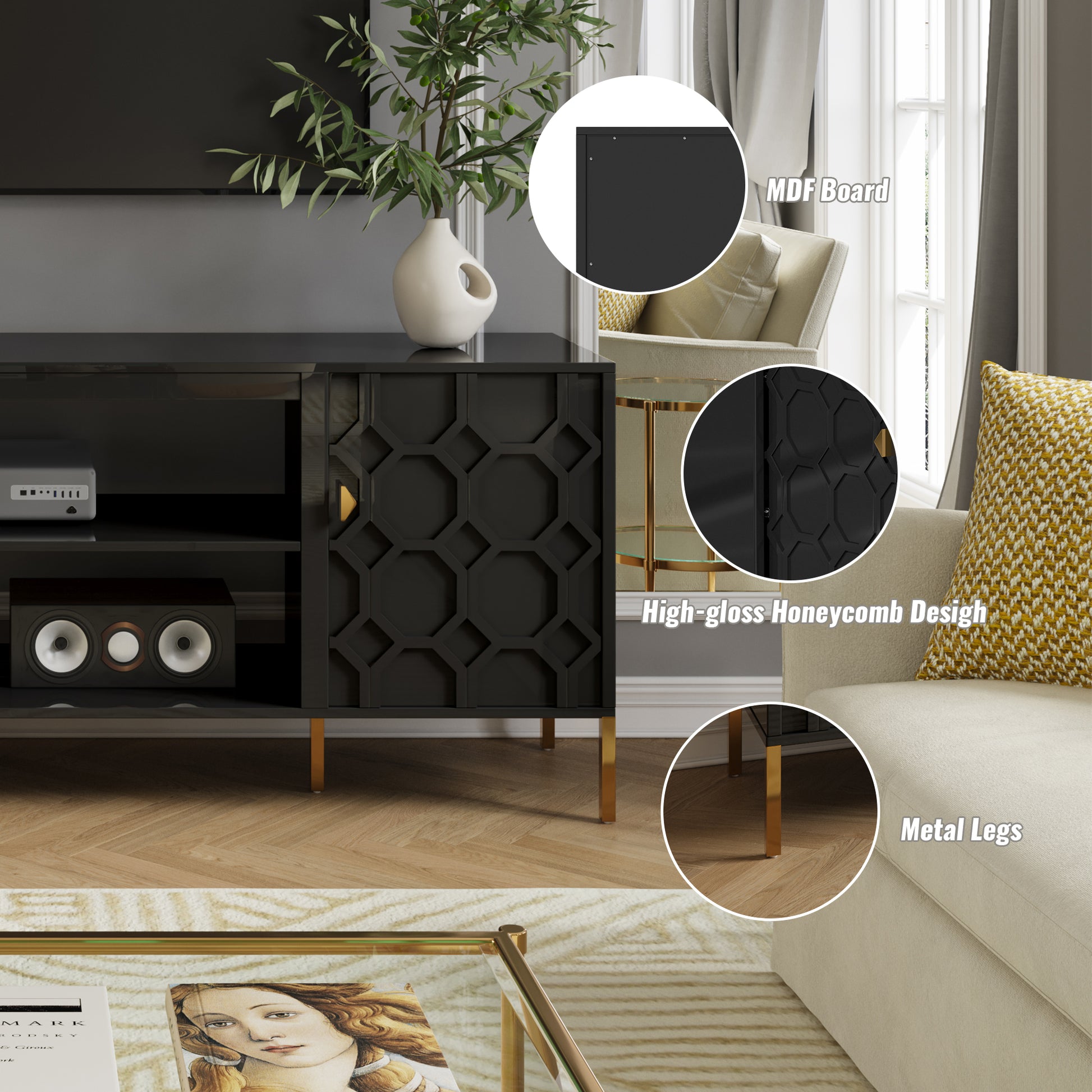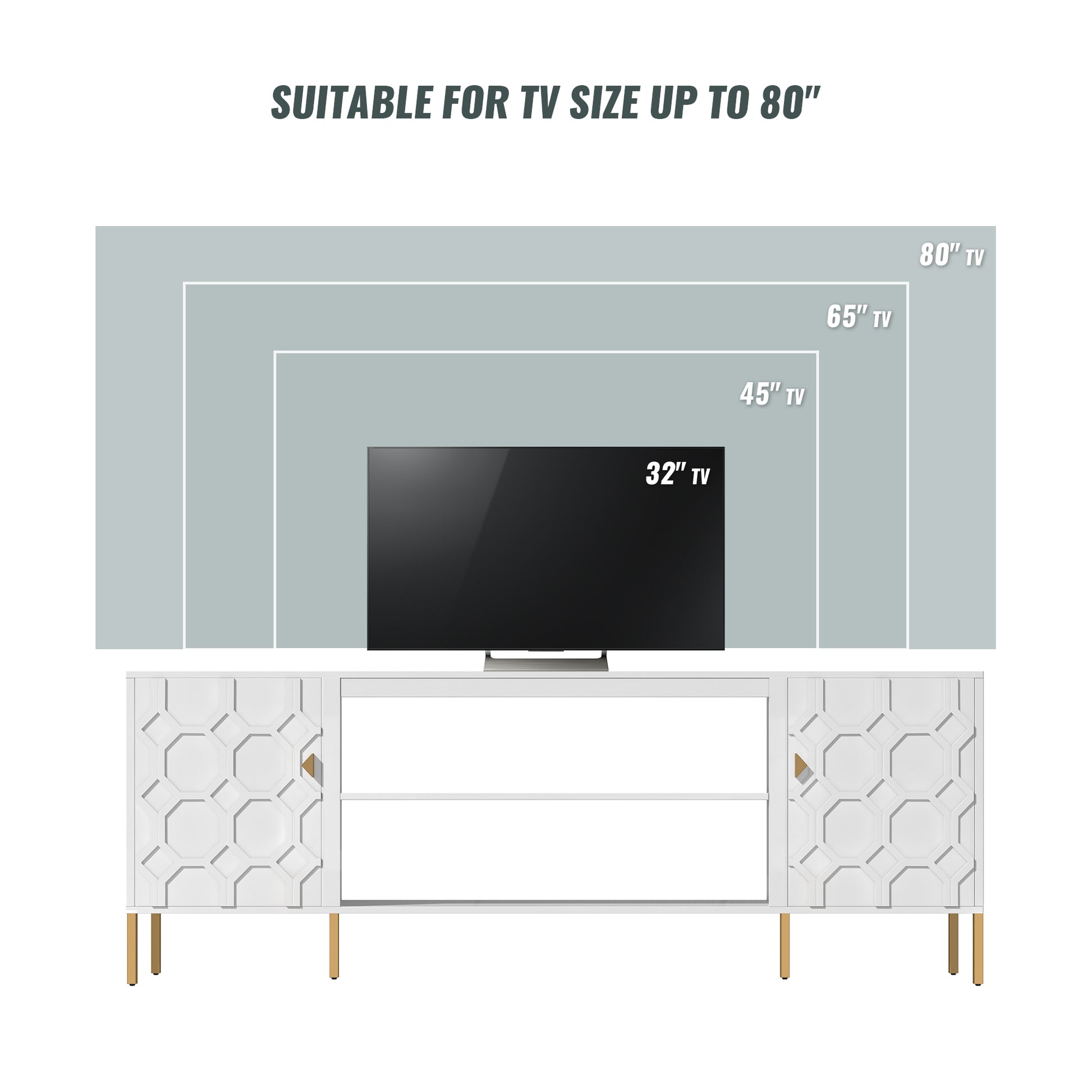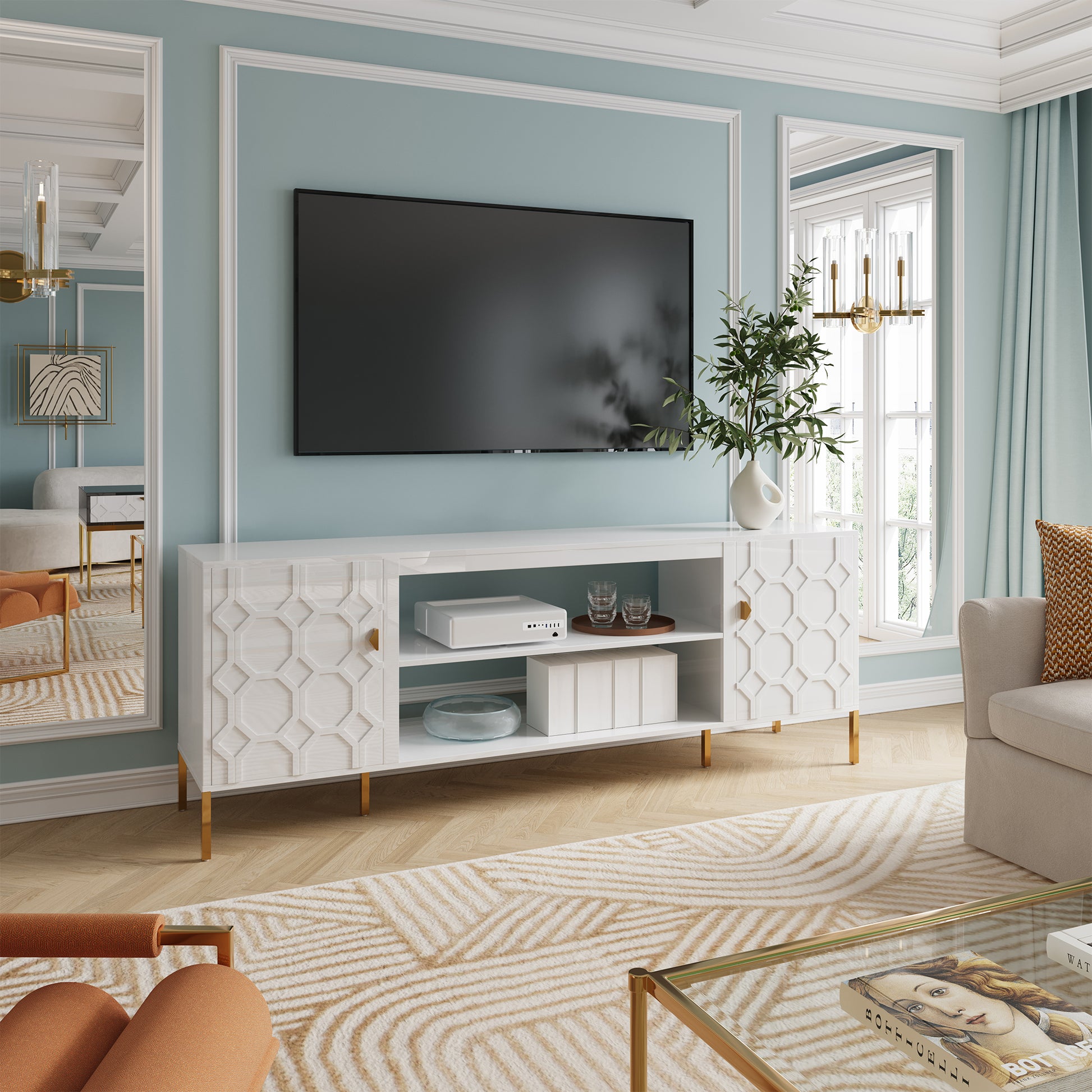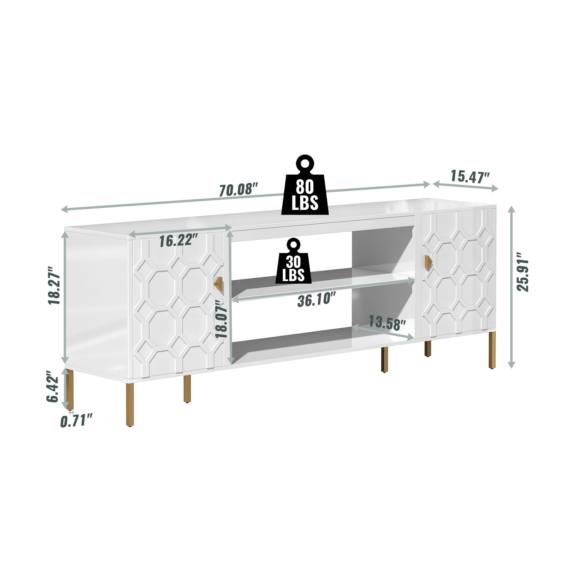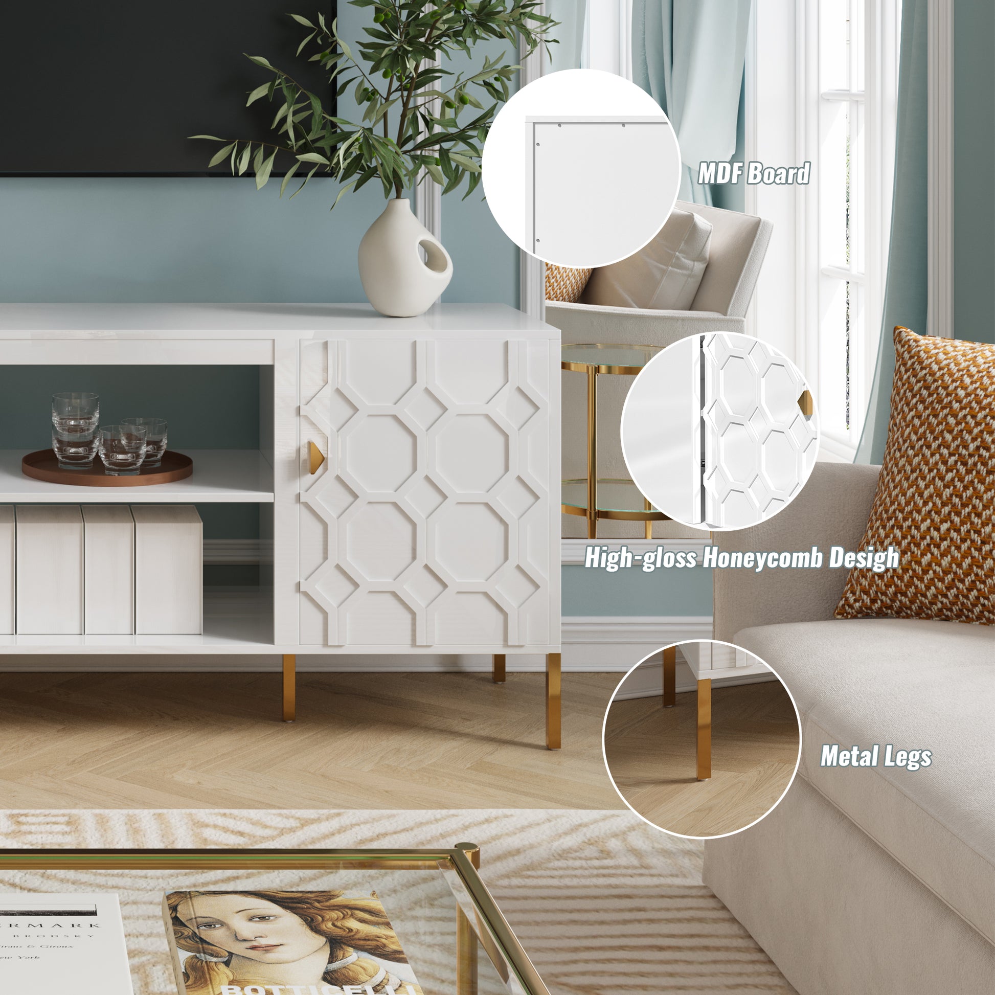 The door panels of the storage TV cabinet are decorated with an embossed honeycomb effect, and the clean lines and simple design of the door cabinets are perfect for modern styles