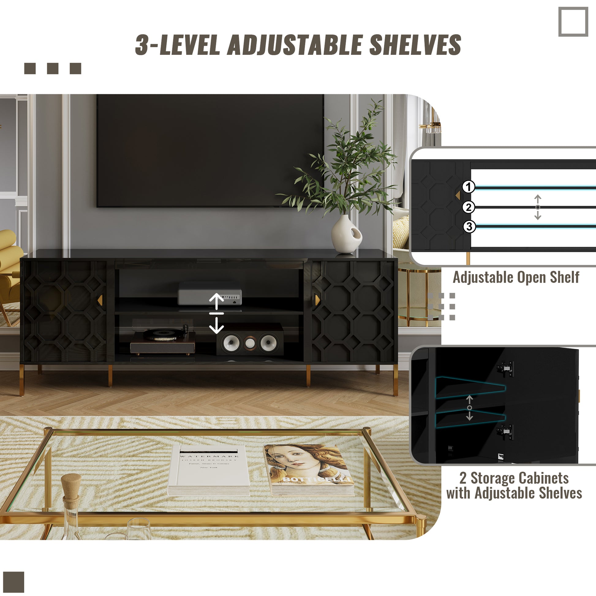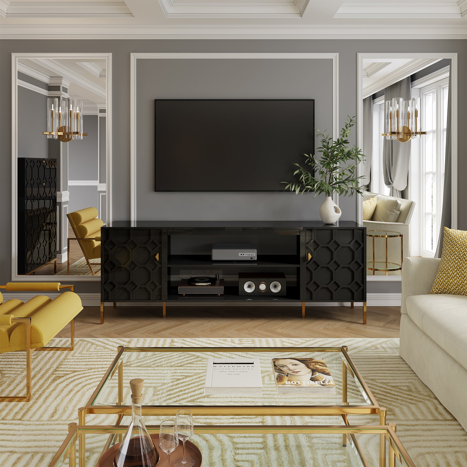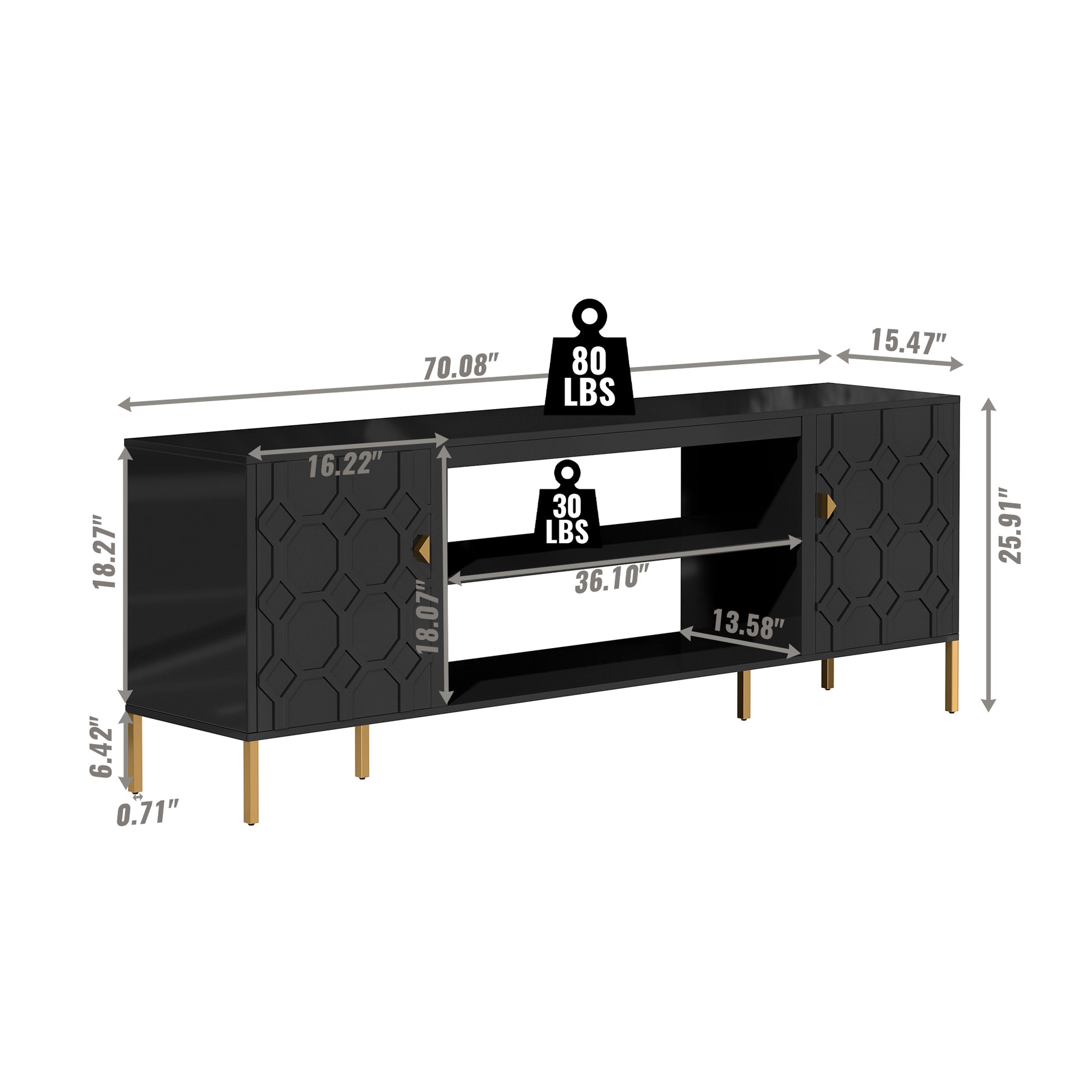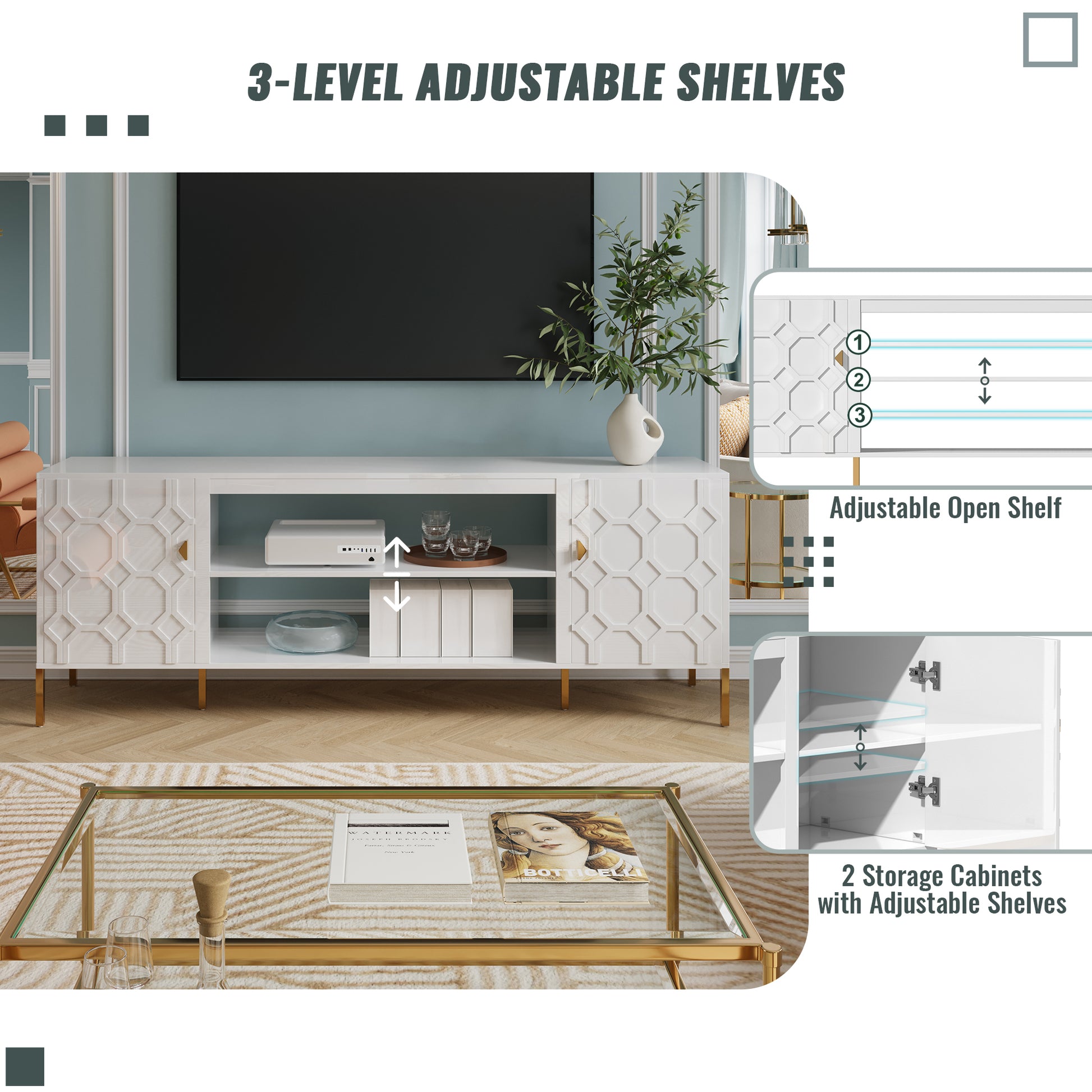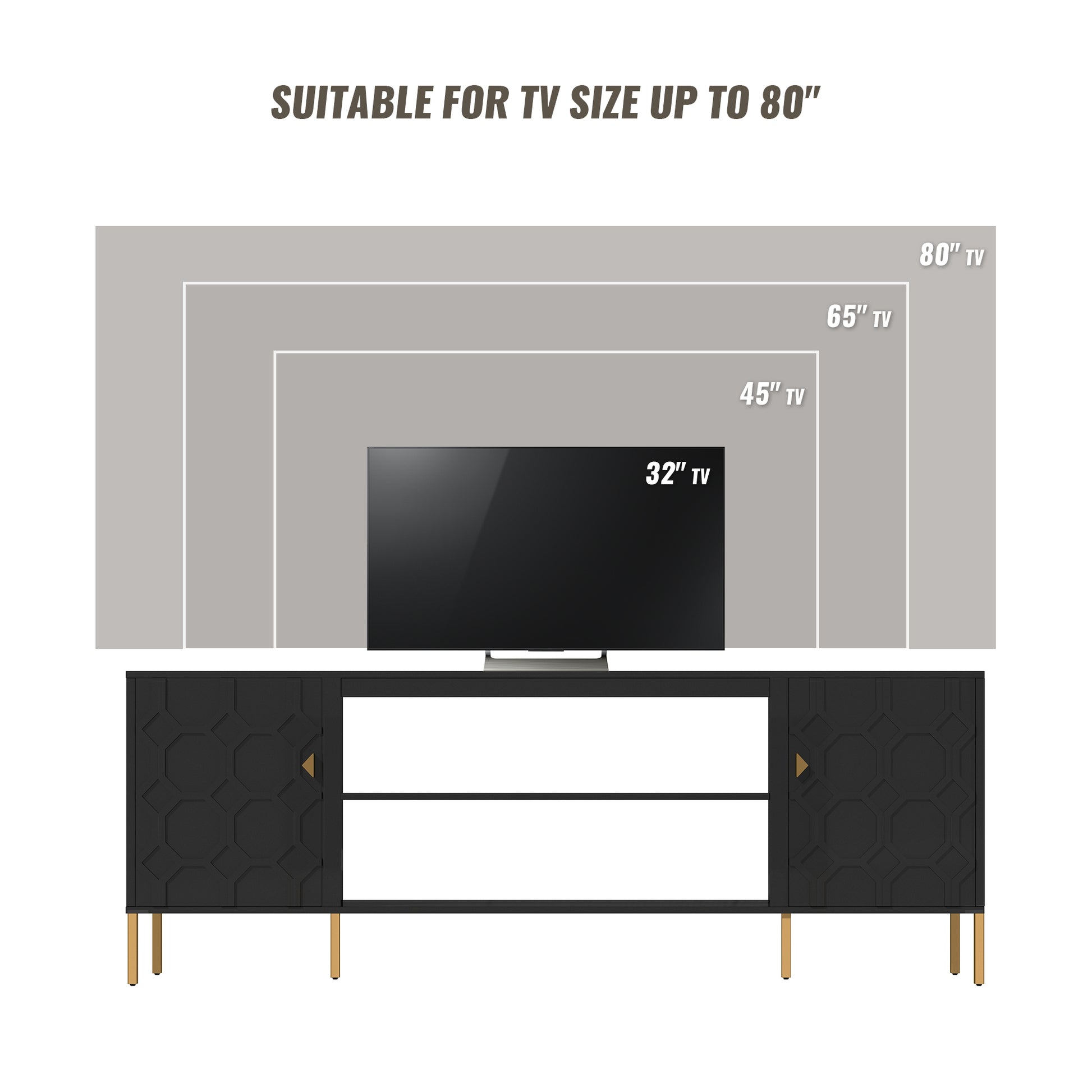 The door panels of the storage TV cabinet are decorated with an embossed honeycomb effect, and the clean lines and simple design of the door cabinets are perfect for modern styles
