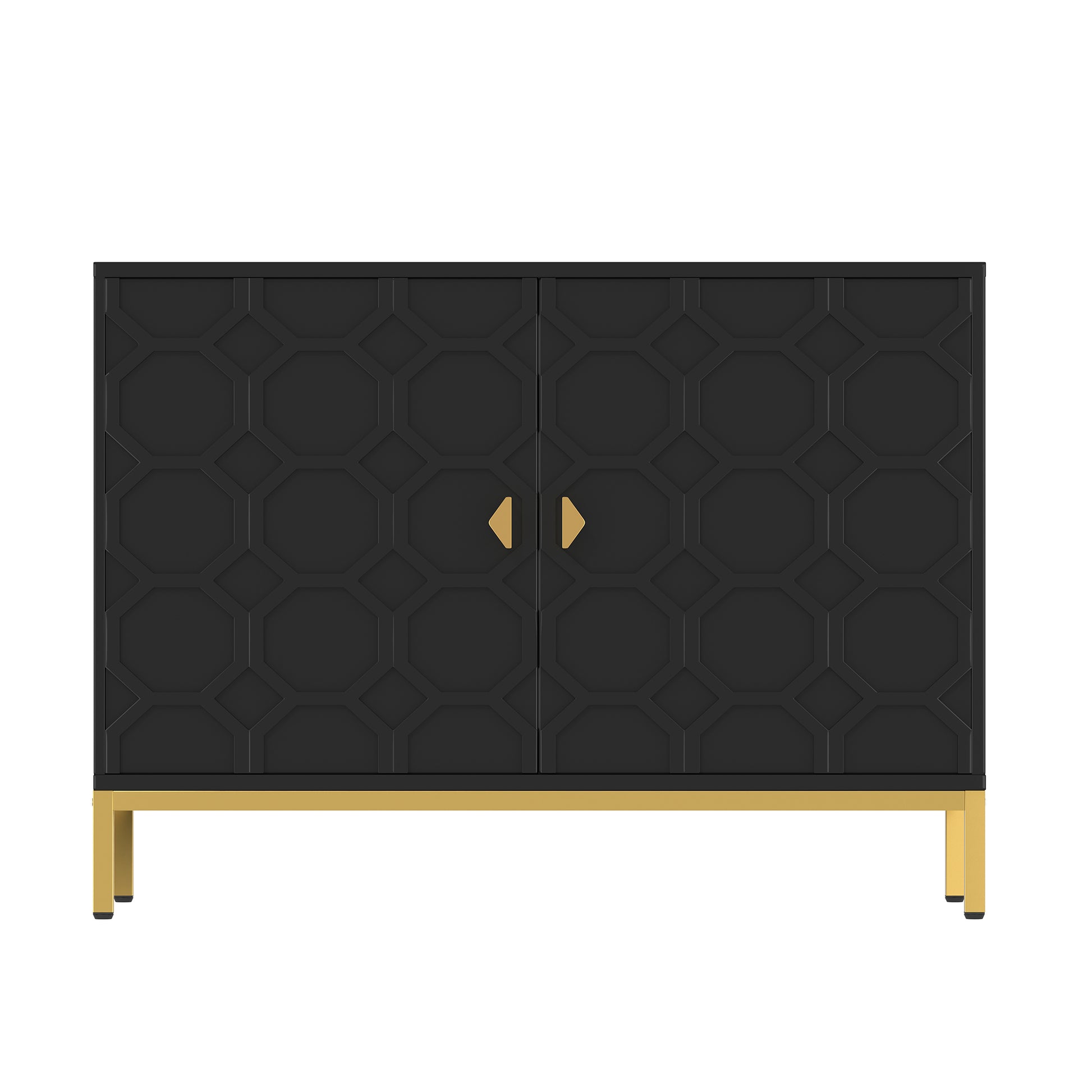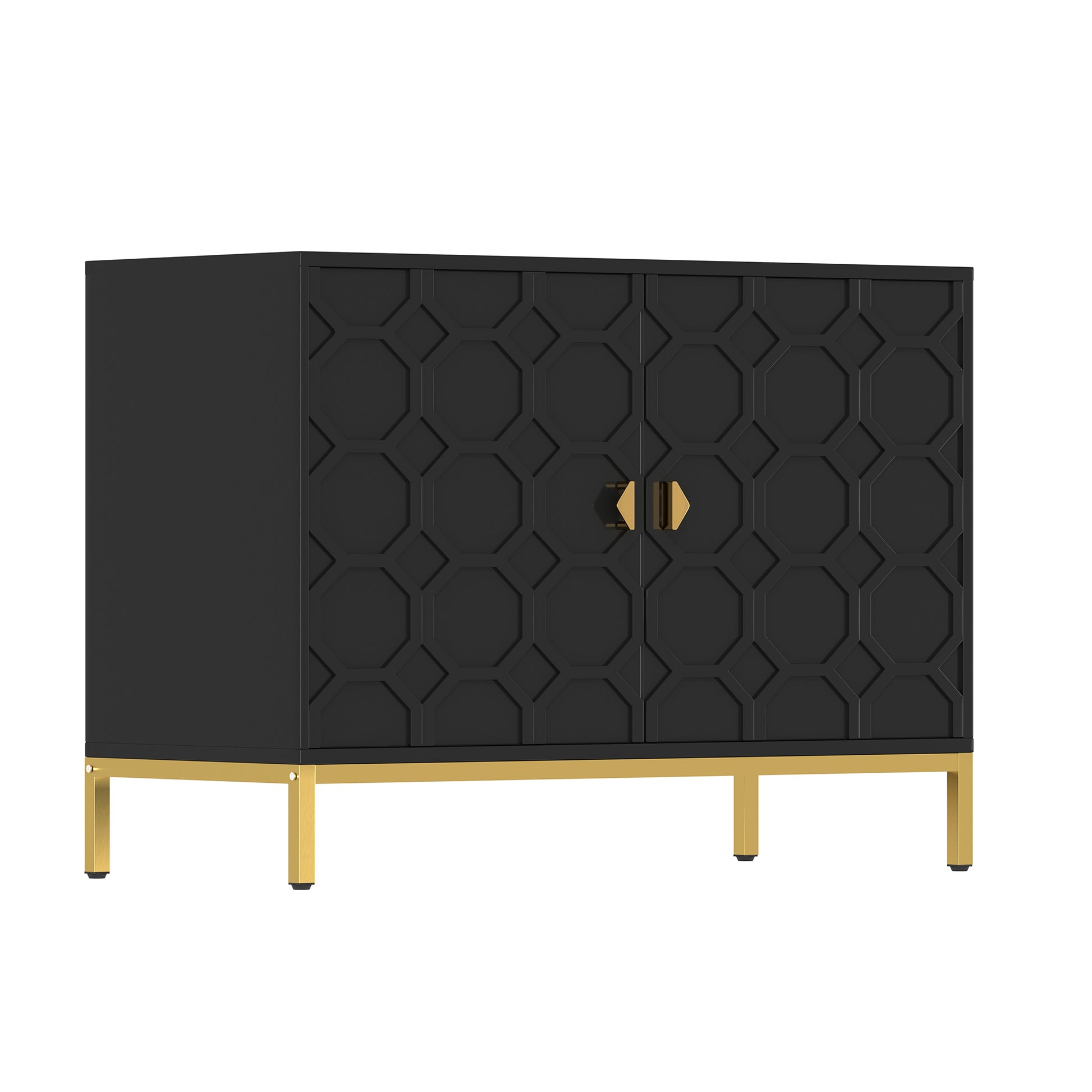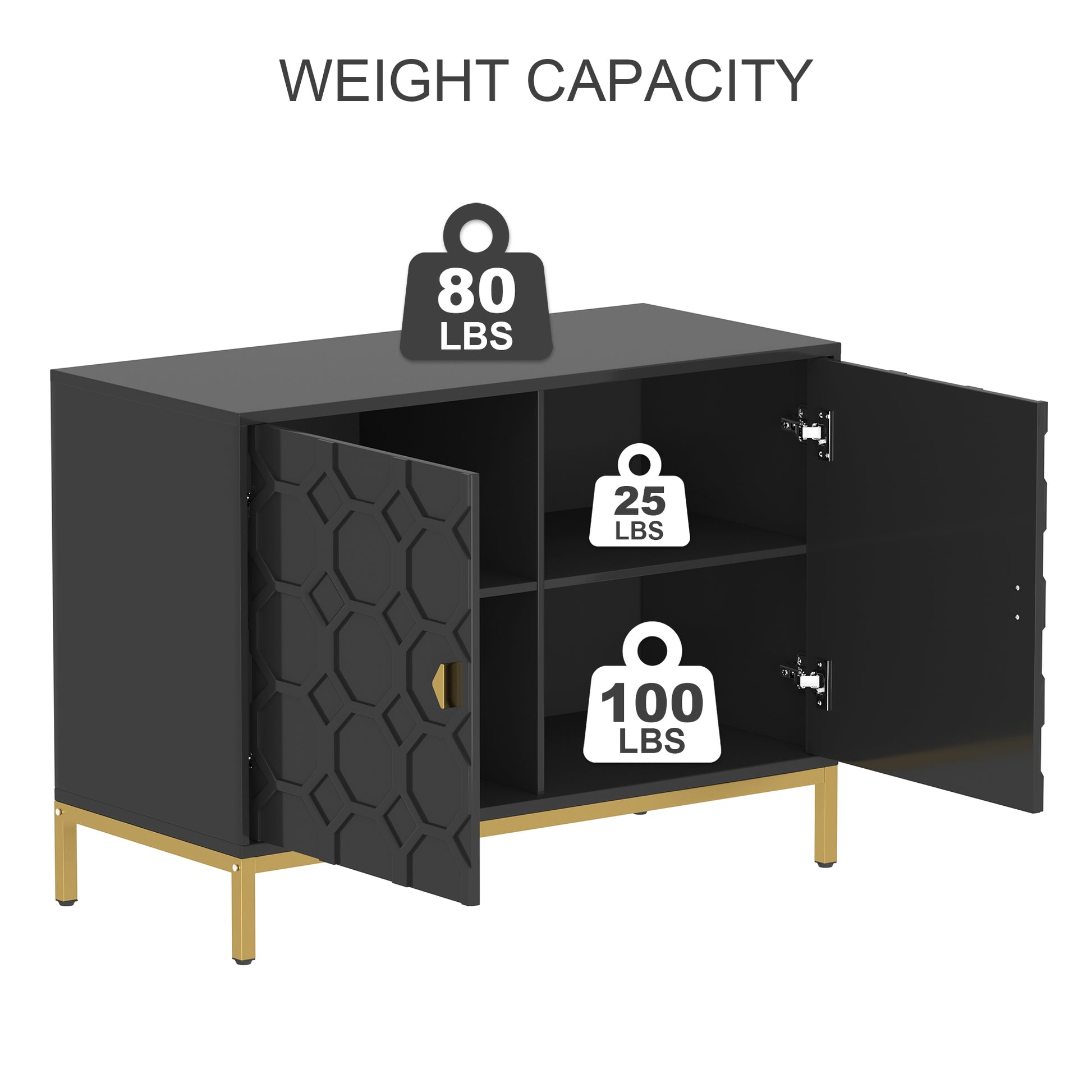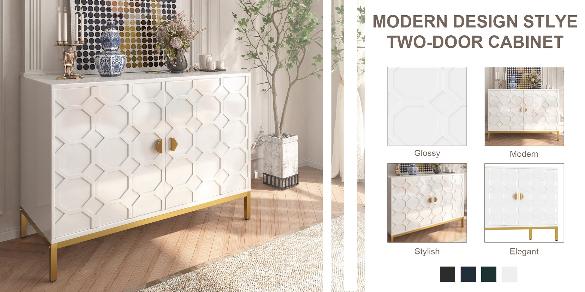 The accent cabinet features a crisp silhouette complemented by Golden Square iron cabinet legs with inverted triangular door handle shows lively and playful; Unique woodcut finish Inspired by the honeycomb of pastoral farm. The whole sideboards cabinet body is made of bright PU paint, which is scratch resistant; The attached adjustable floor mat allows you to avoid scratching the floor while adjusting the cabinet. The elevated legs design can avoid that the moisture will damage the cabinet. -