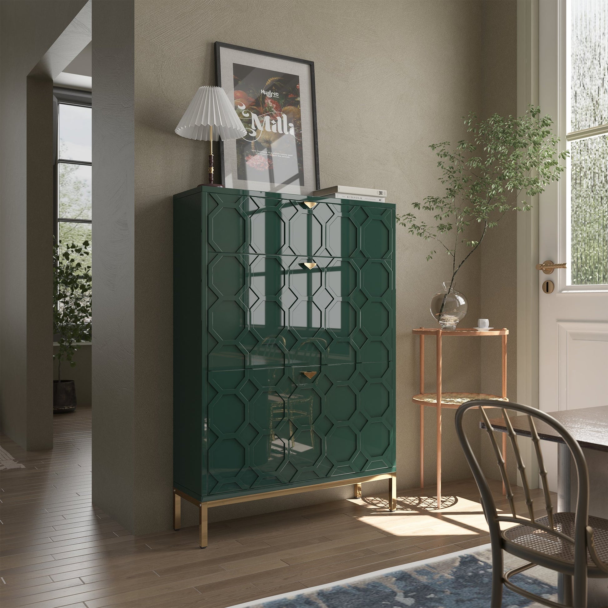 This shoe cabinet has great storage features,It is made of engineered wood with three drawers that tilt open and a steel wire shelf inside for easy storage, 4 gold legs make it look like a unique piece of art furniture.