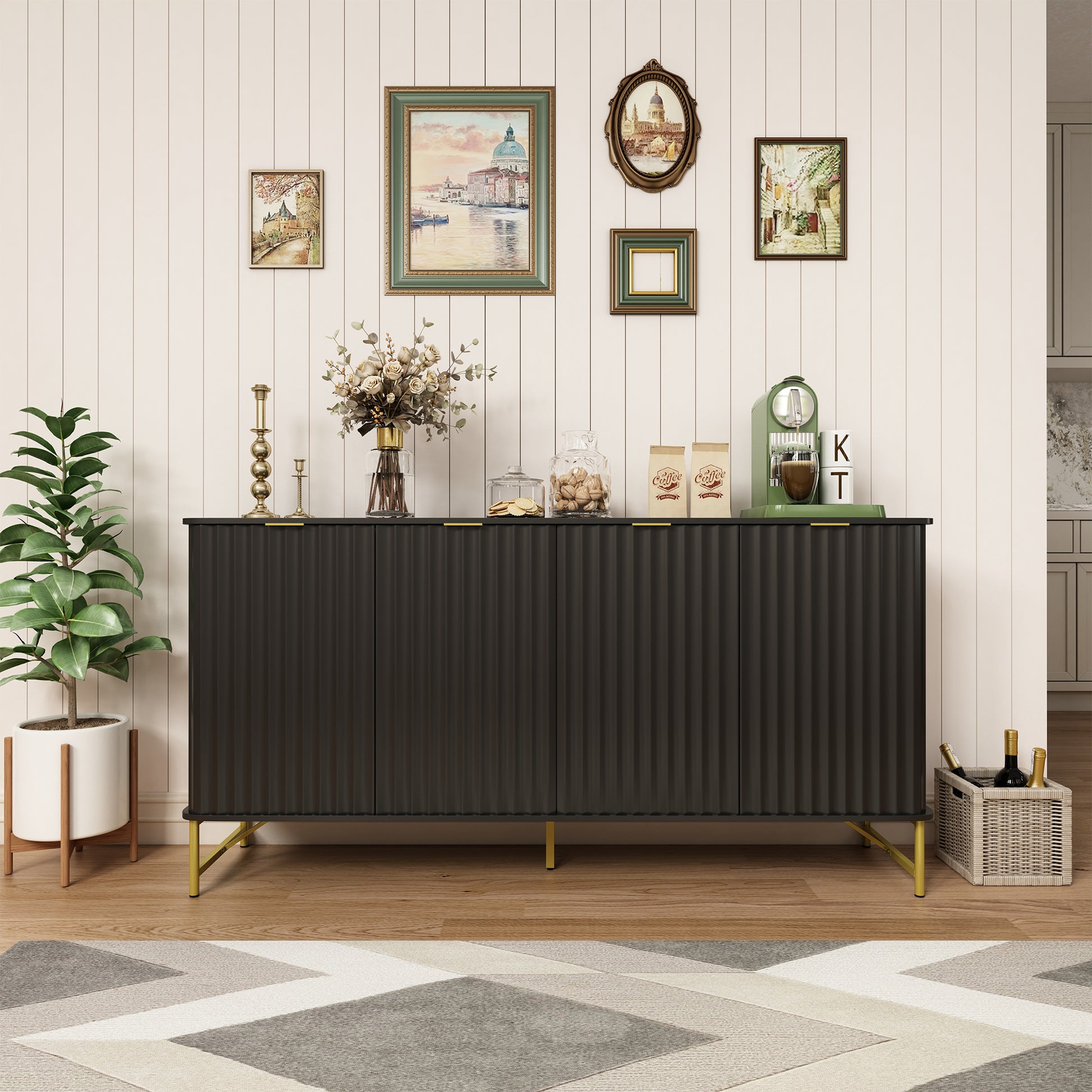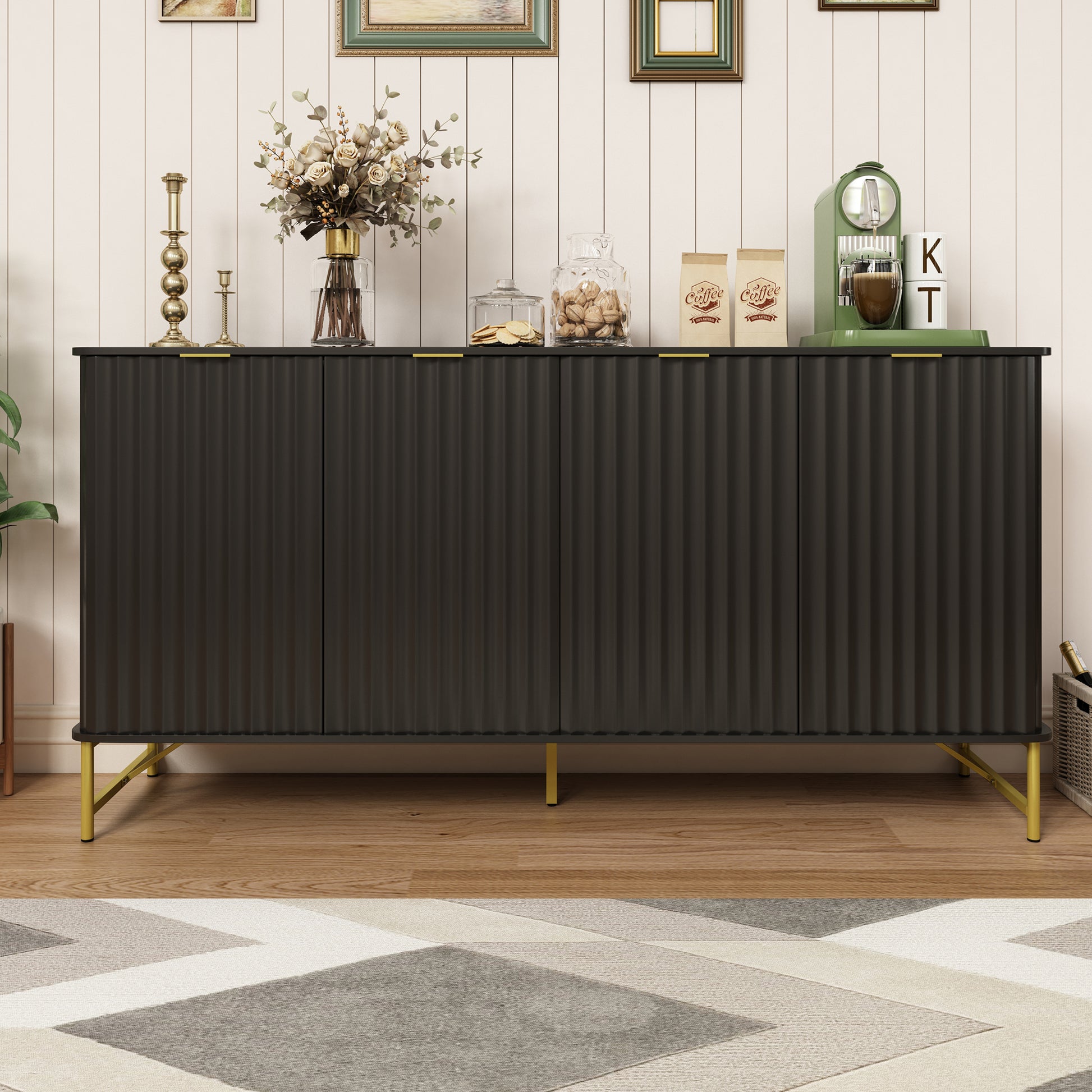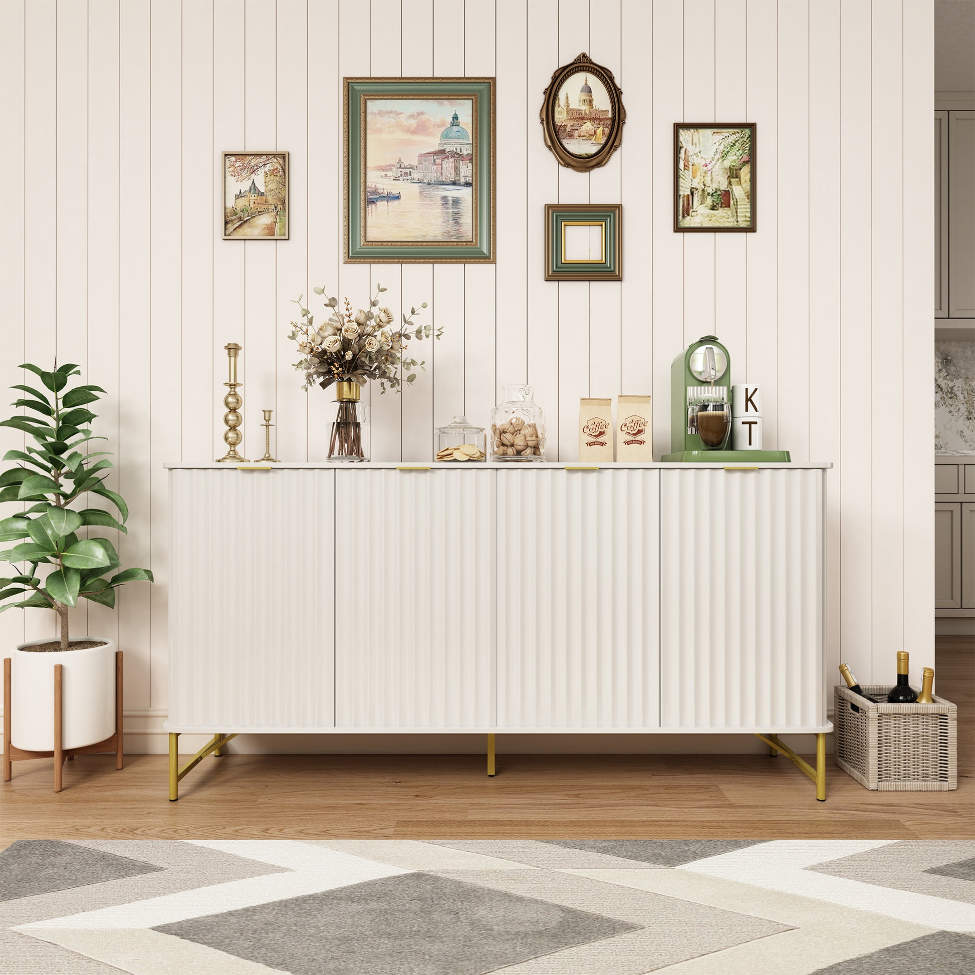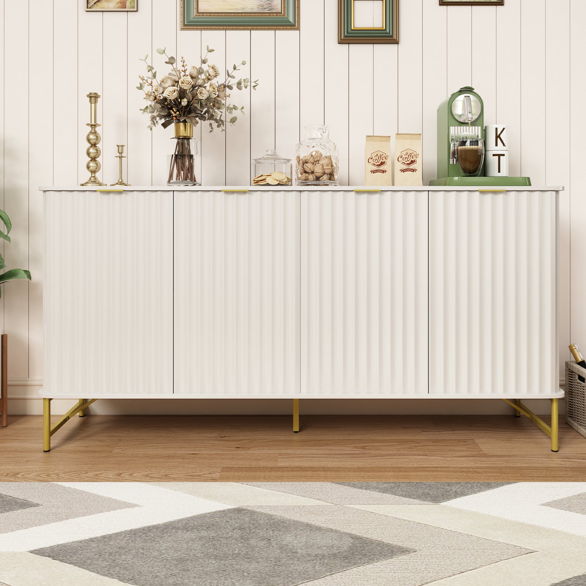 - Durable Construction:With an overall dimension of 63"W x 16"D x 32"H,Crafted from durable MDF, this sideboard buffet cabinet can hold up to 100 pounds.The Plated metal legs with adjustable footpads enhance stability, ensuring your items are securely stored.